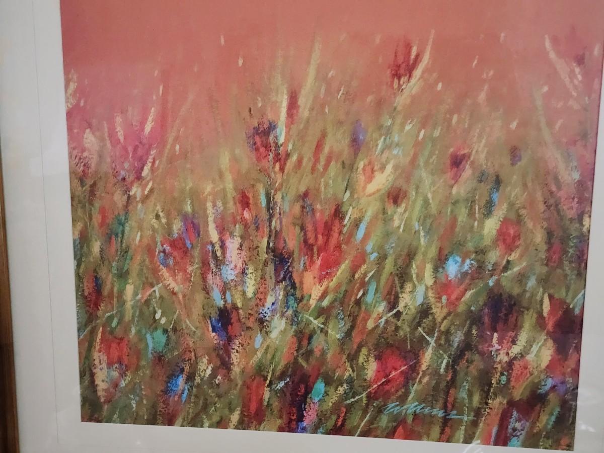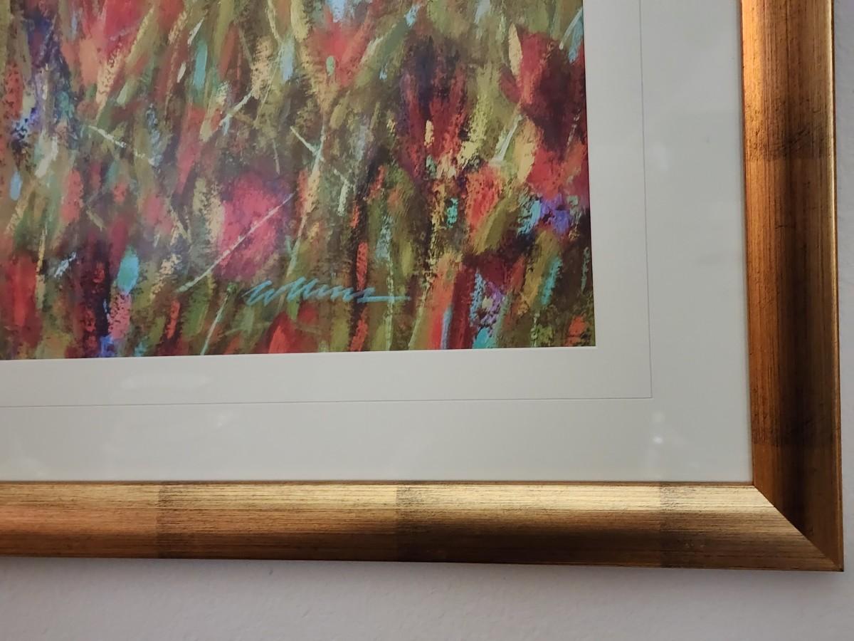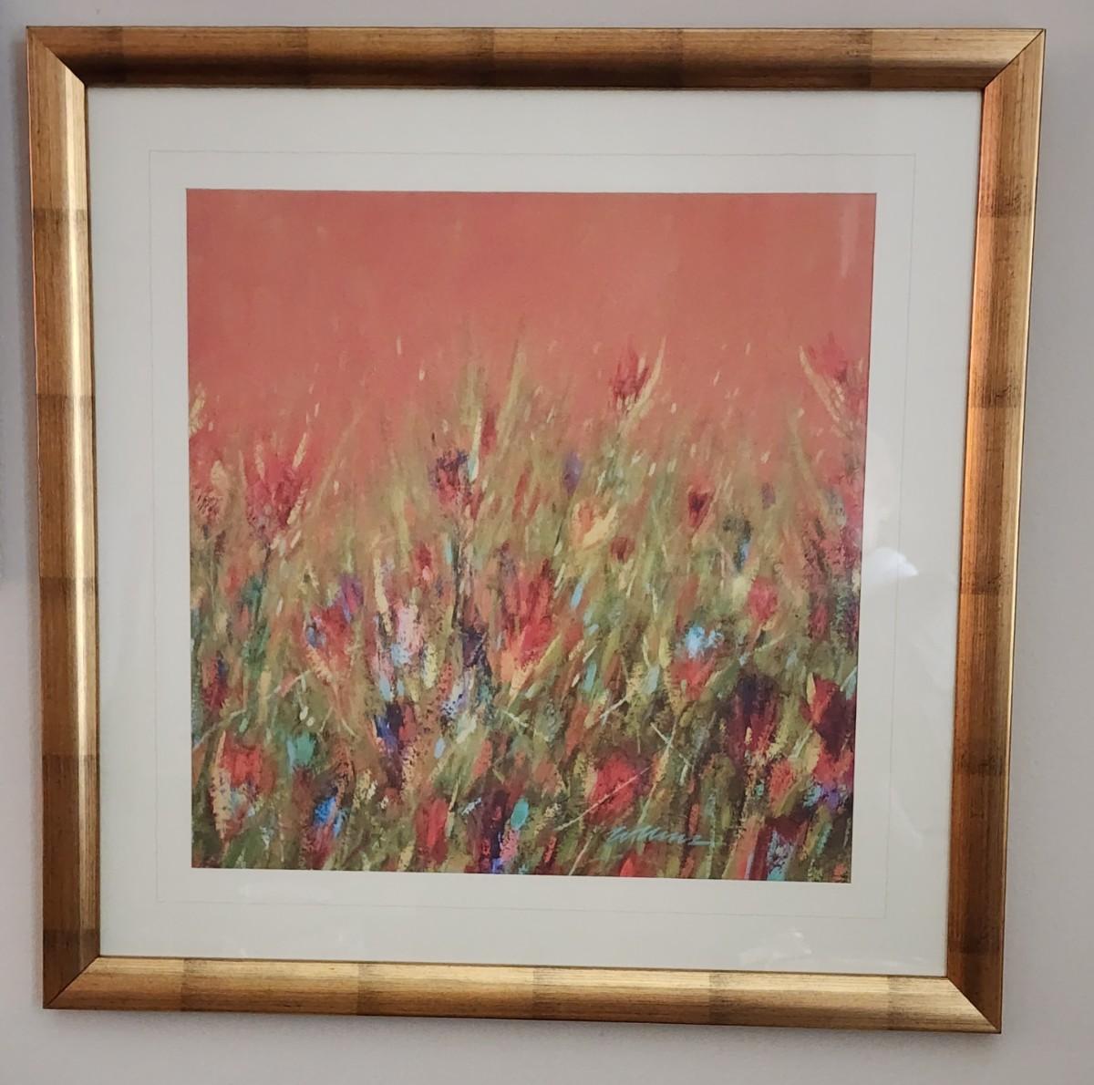Pretty abstract art print looks like a field of wild flowers with the sun setting in the background. Oranges, reds, yellows and muted greens are the dominant colors, with dots of turquoise and robin's egg blue to make the colors pop. Set in a white mat and framed in metallic copper colored wood frame. Overall size 27 3/4" square.