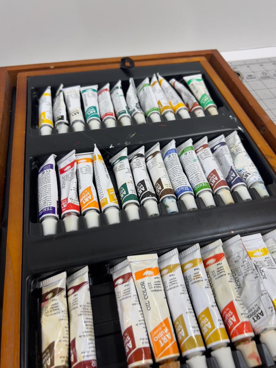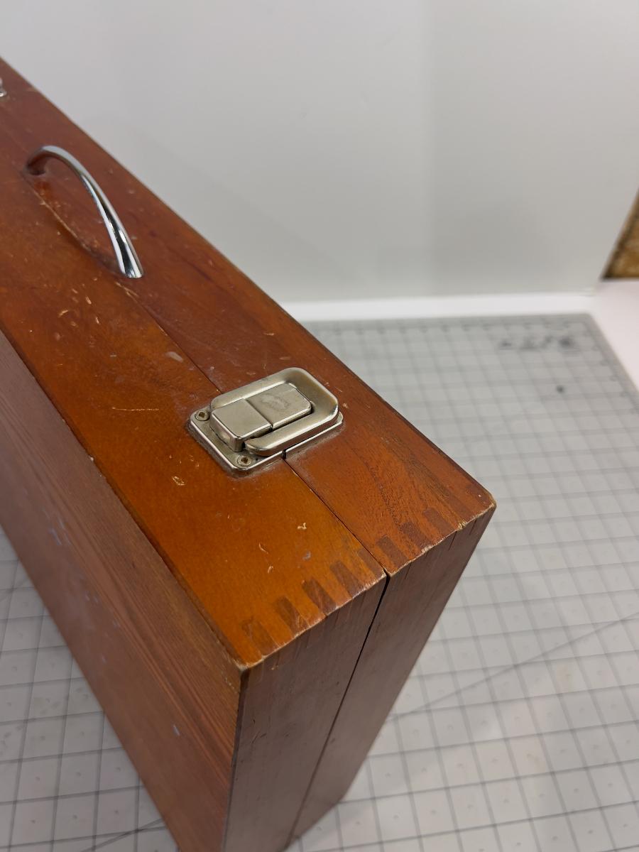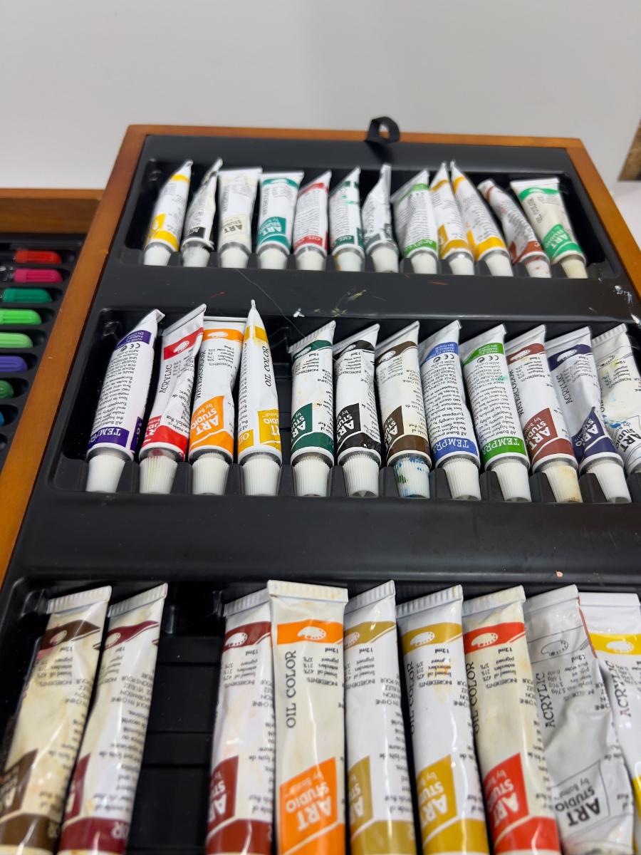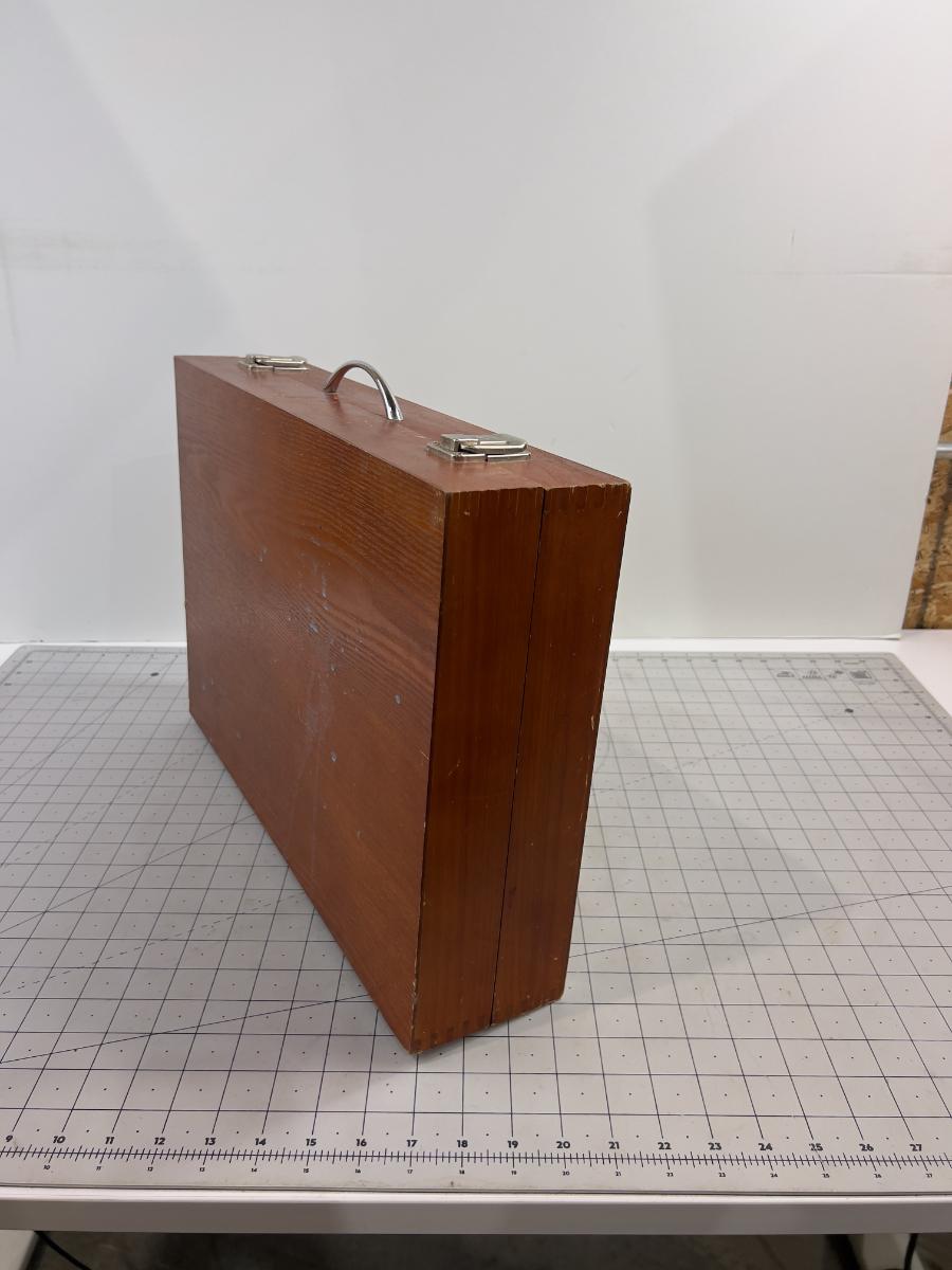 Seems to be in good usable condition. Not Dry. Make art today!! Pencils, markers, Pastel, Oil Etc. in a Finger Jointed Wood Case. WOW! Nicely Organized 18 x 13 x4