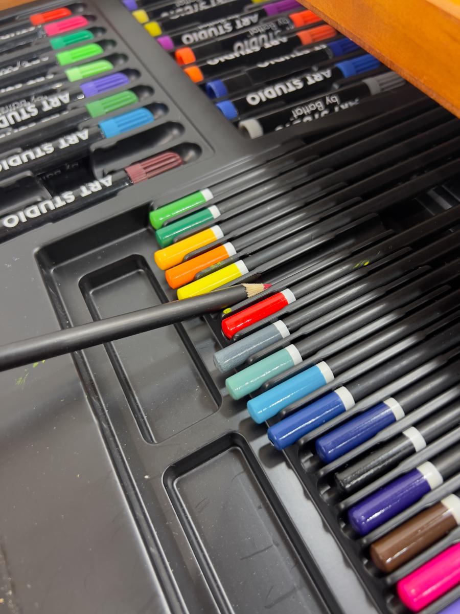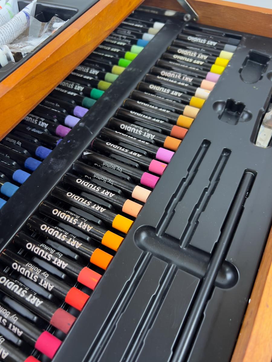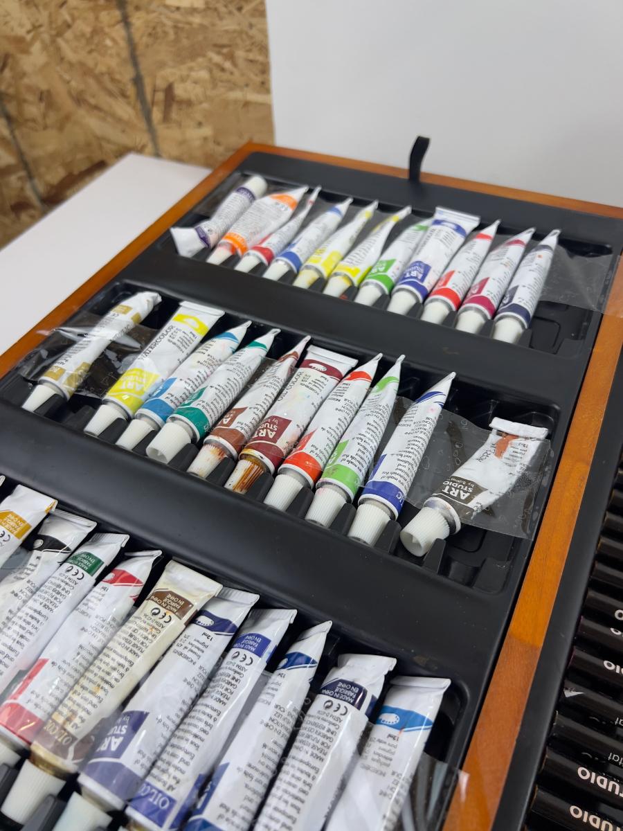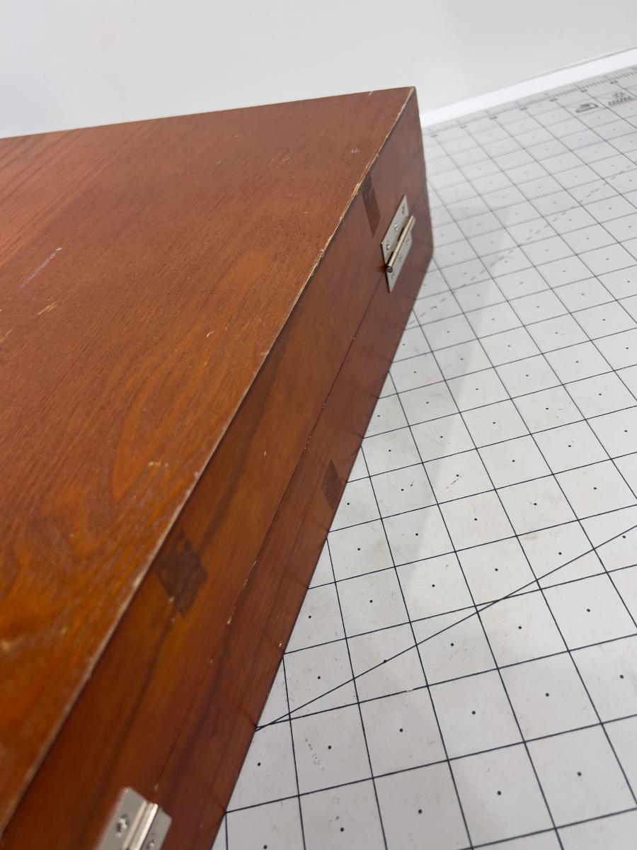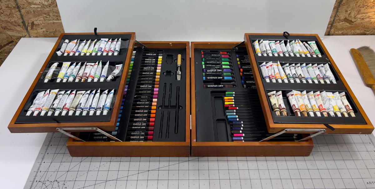 Seems to be in good usable condition. Not Dry. Make art today!! Pencils, markers, Pastel, Oil Etc. in a Finger Jointed Wood Case. WOW! Nicely Organized 18 x 13 x4