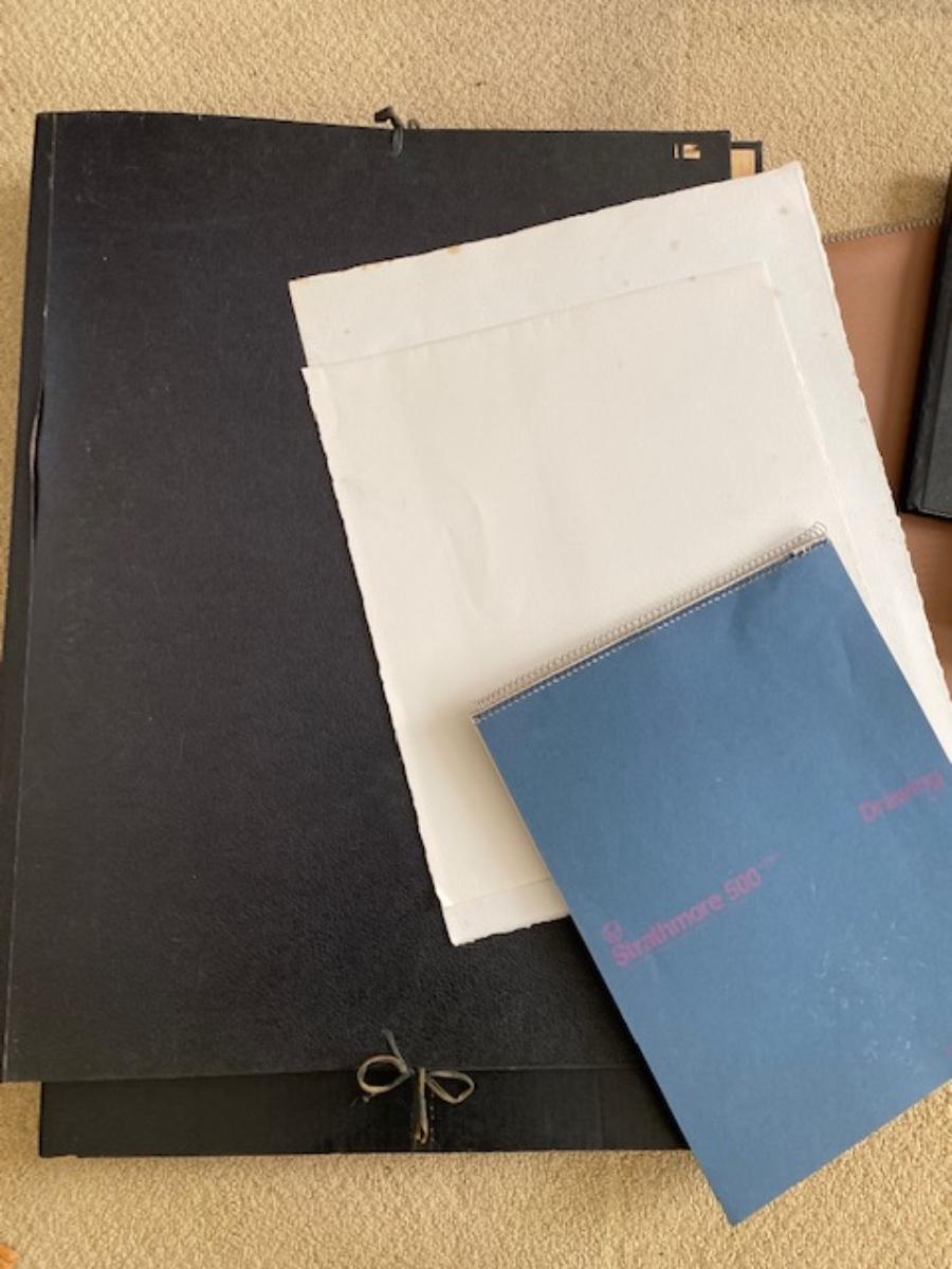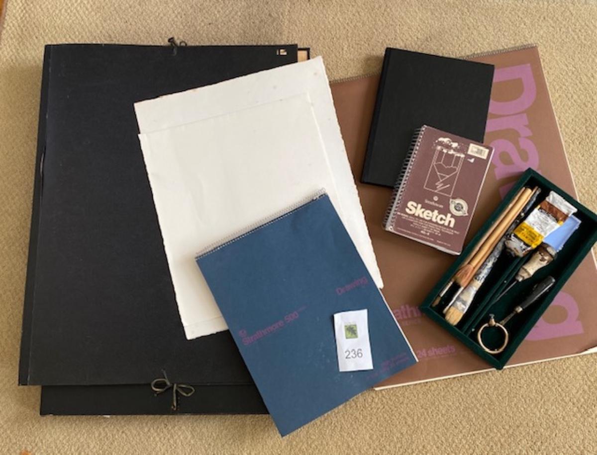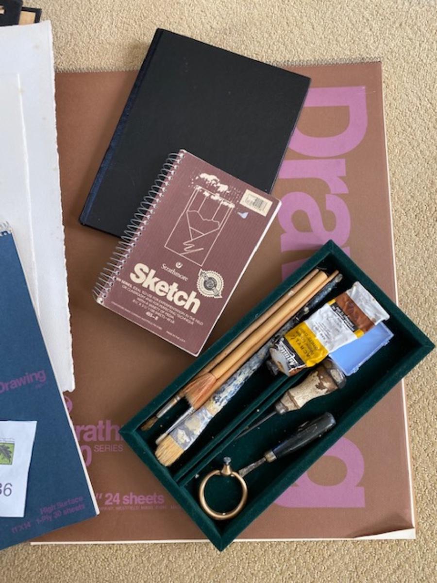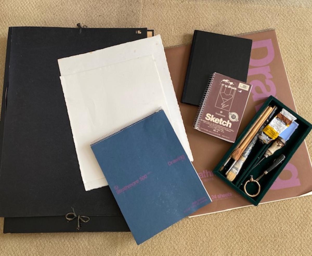 Drawing pads, paint brushes, cardboard portfolio, watercolor paper, and various art supplies