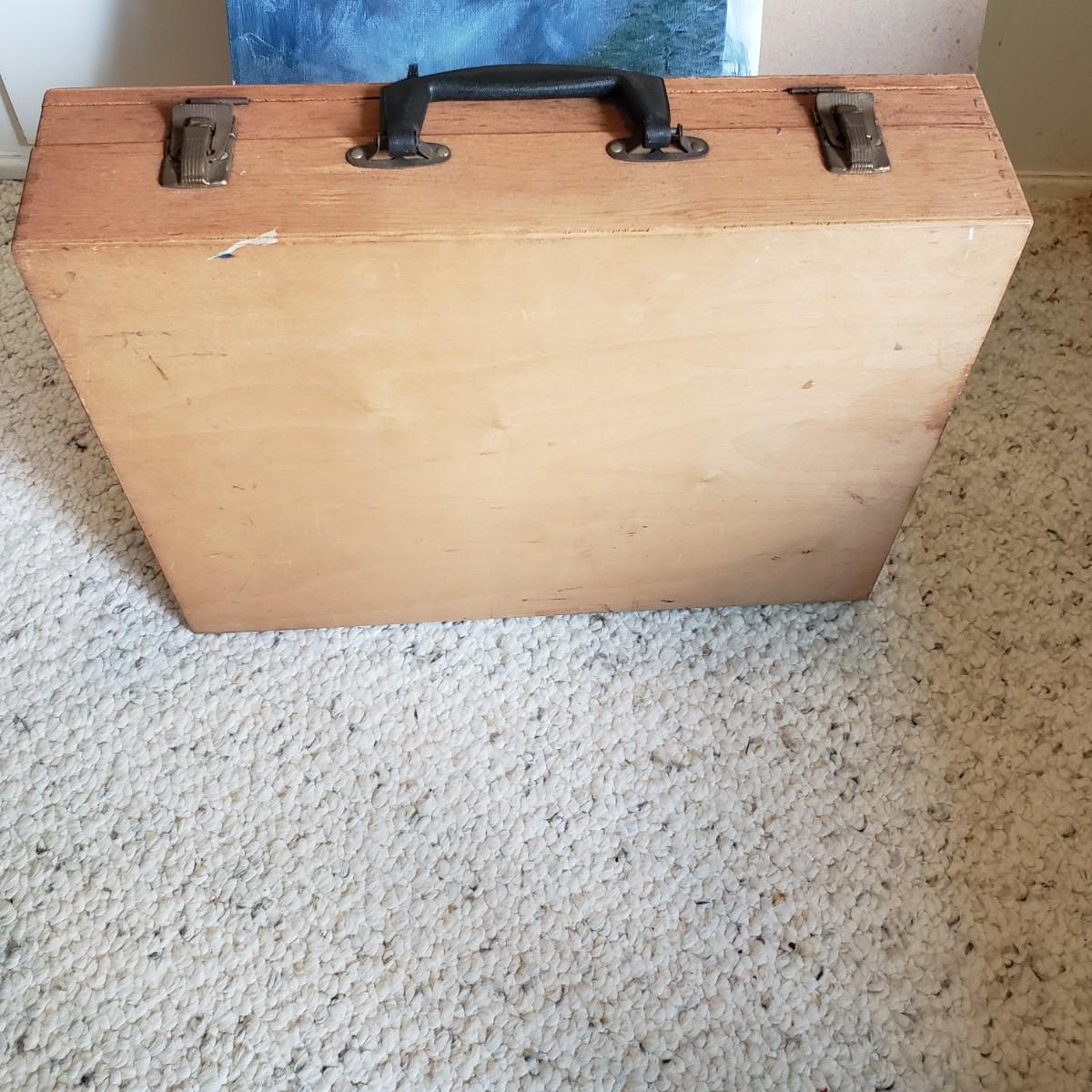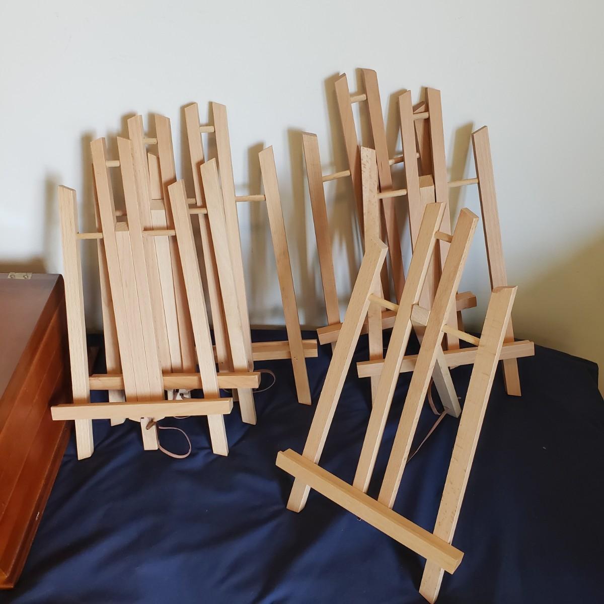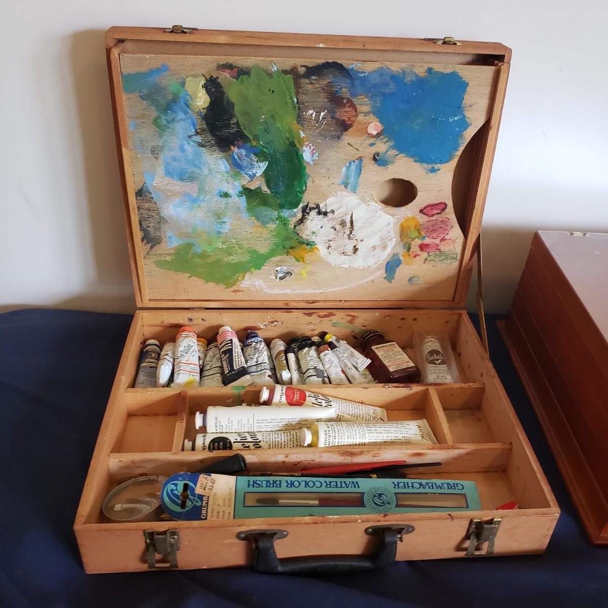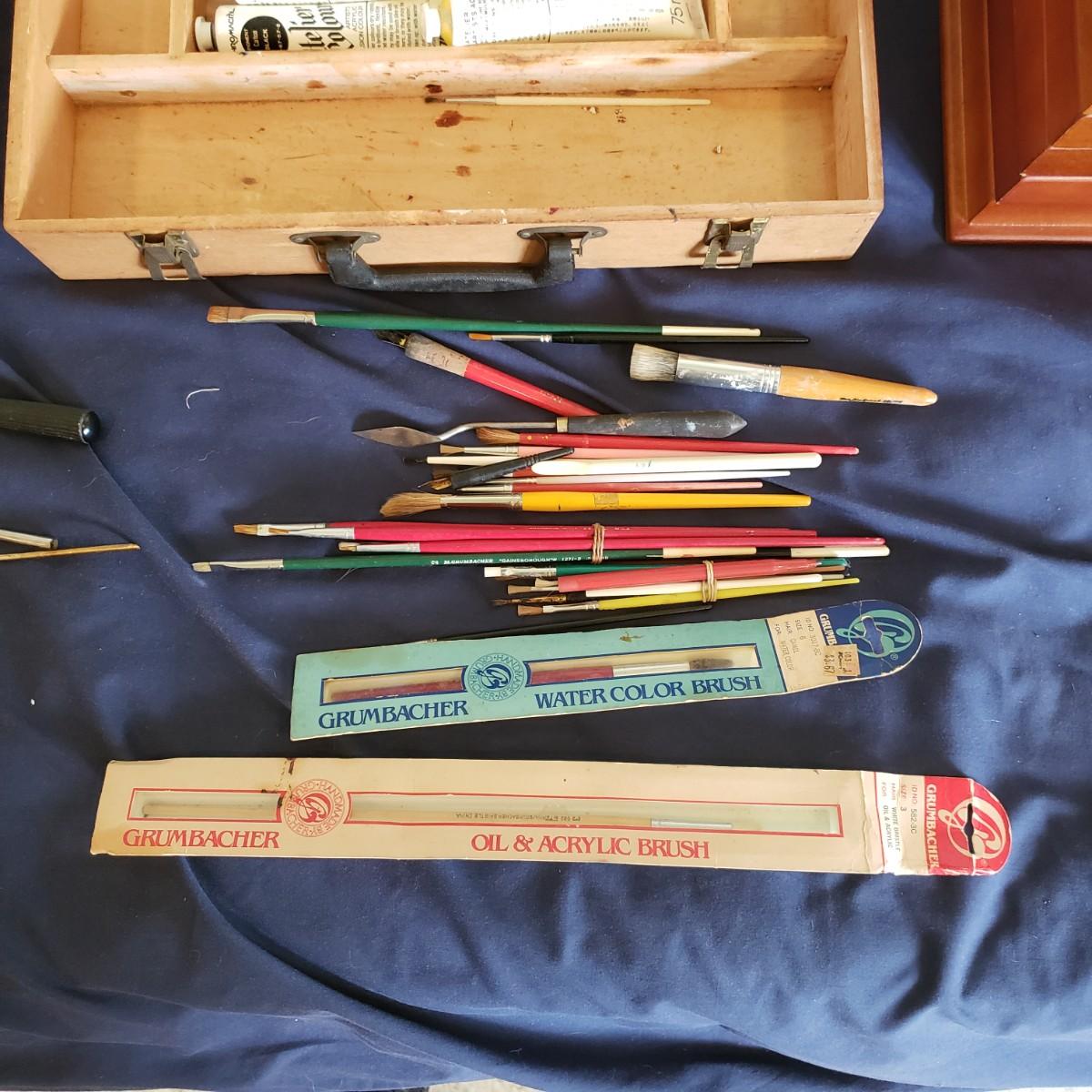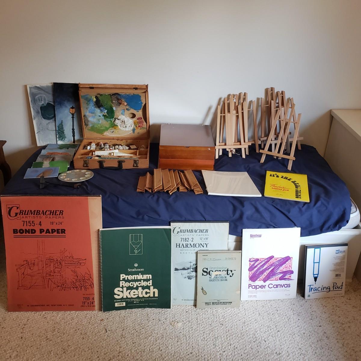 This art supply lot has a number of sketch books ready for your creativity! There are pictures of each book and a side view of how many pages are in each book. There is a brand new three pack of Fredrix 11" x 15" canvases. The six wooden easels measure 10" x 9" x 15"H when standing. The wood case with locks and a handle contains paint and brushes. The contents/age of the paint tubes cannot be guaranteed, but they do feel soft. The five tiered wood box that swivels from one corner can hold all your artistic supplies! The box measures 14" x 14" x 7"H. The lid is made of clear plexiglass.