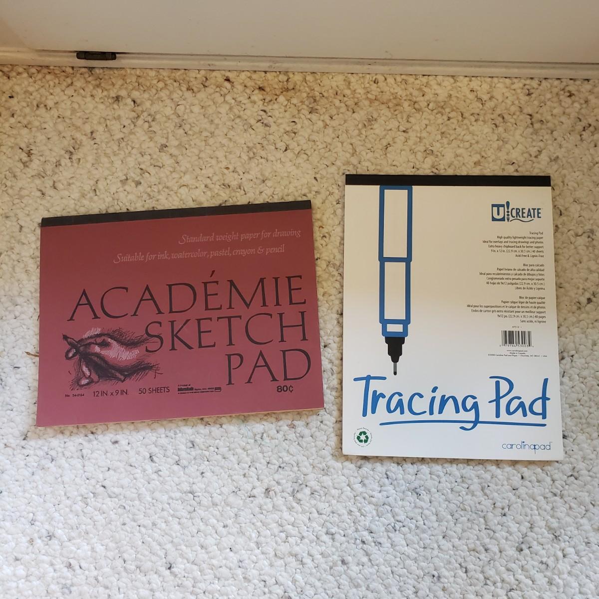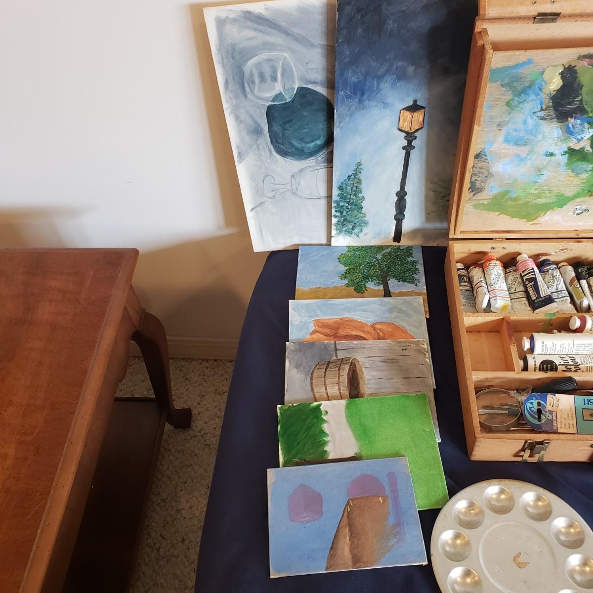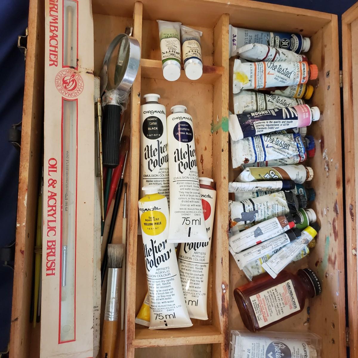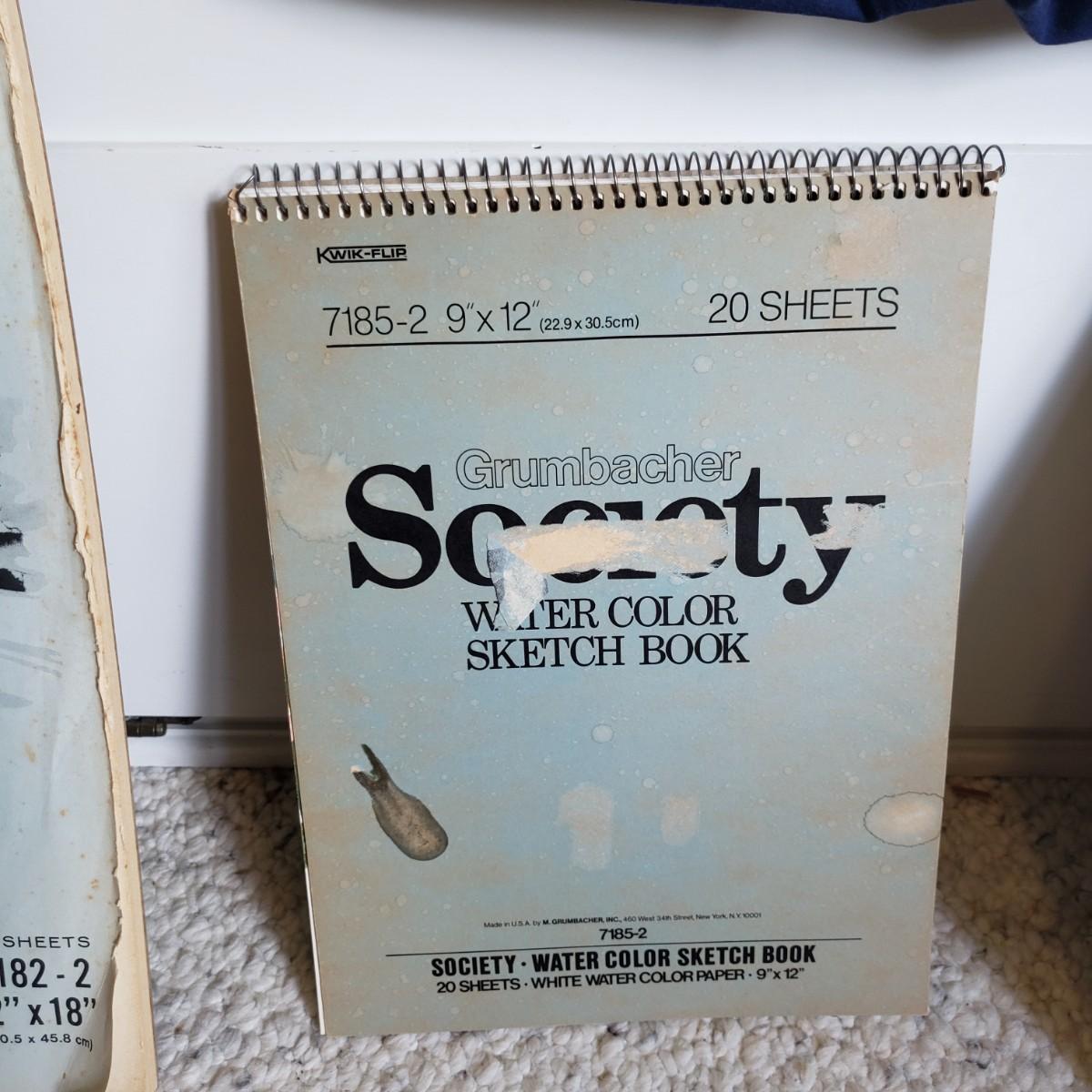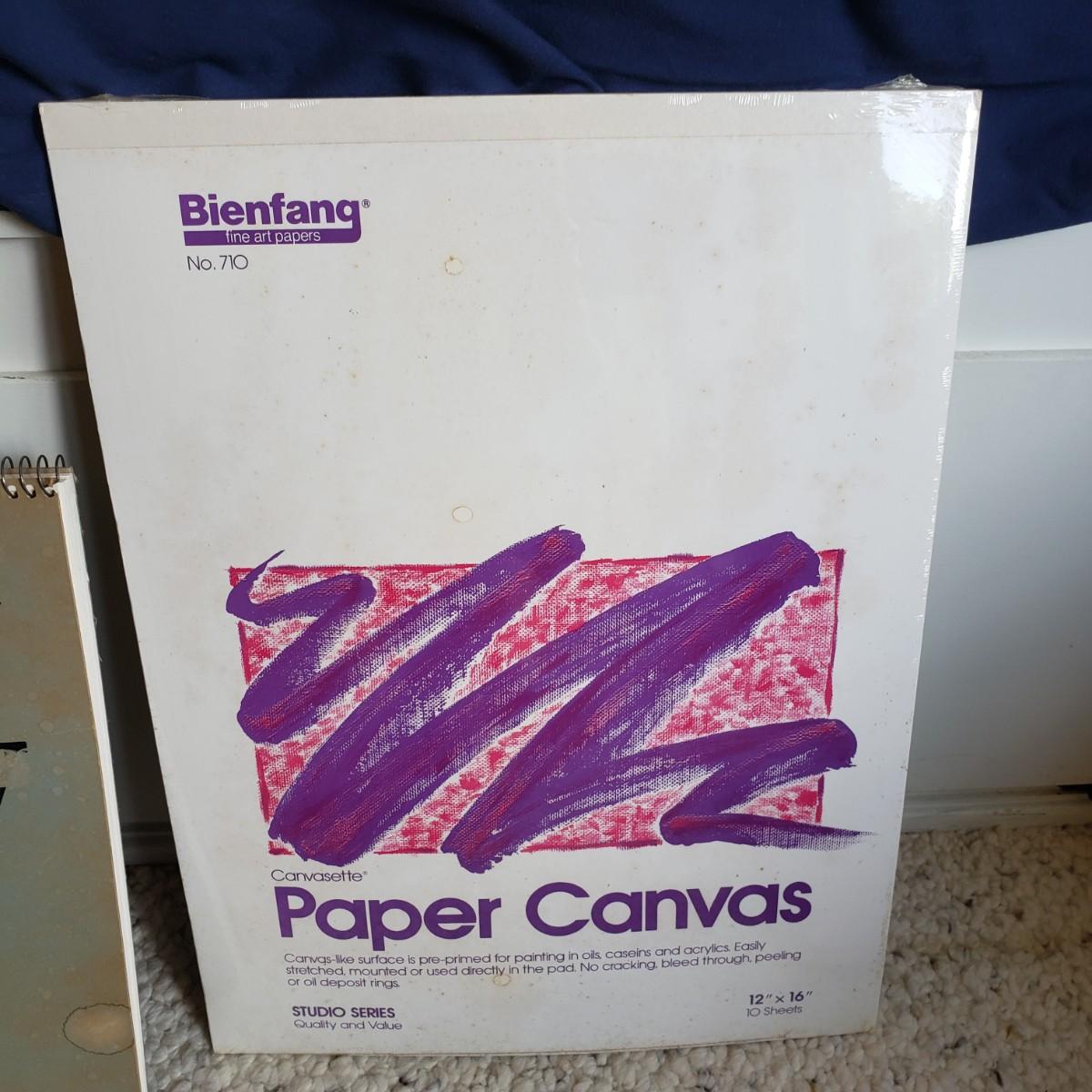 This art supply lot has a number of sketch books ready for your creativity! There are pictures of each book and a side view of how many pages are in each book. There is a brand new three pack of Fredrix 11" x 15" canvases. The six wooden easels measure 10" x 9" x 15"H when standing. The wood case with locks and a handle contains paint and brushes. The contents/age of the paint tubes cannot be guaranteed, but they do feel soft. The five tiered wood box that swivels from one corner can hold all your artistic supplies! The box measures 14" x 14" x 7"H. The lid is made of clear plexiglass.