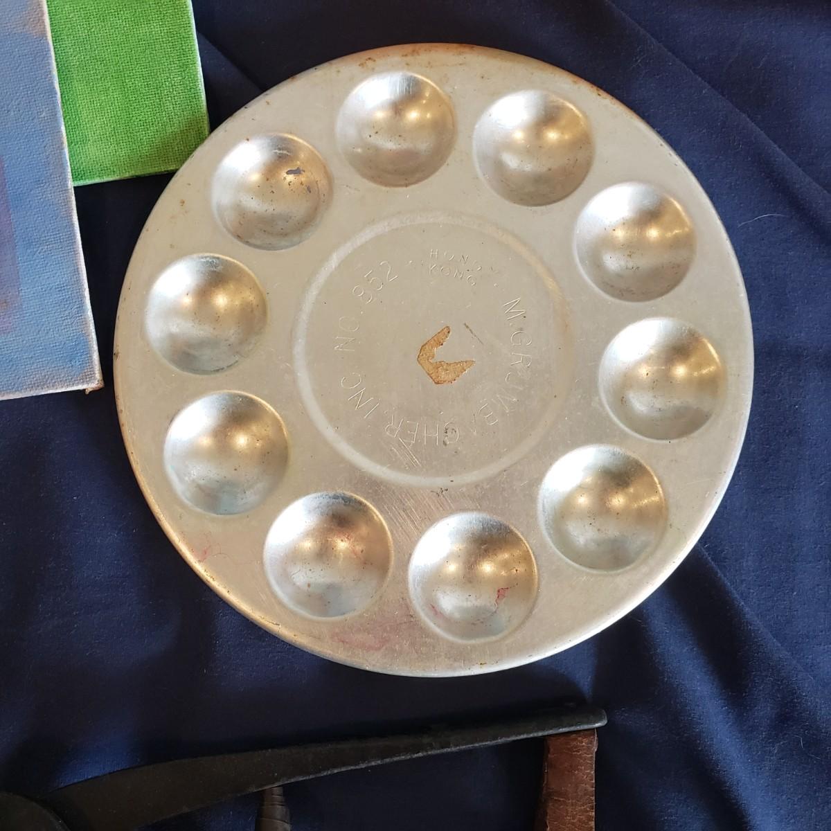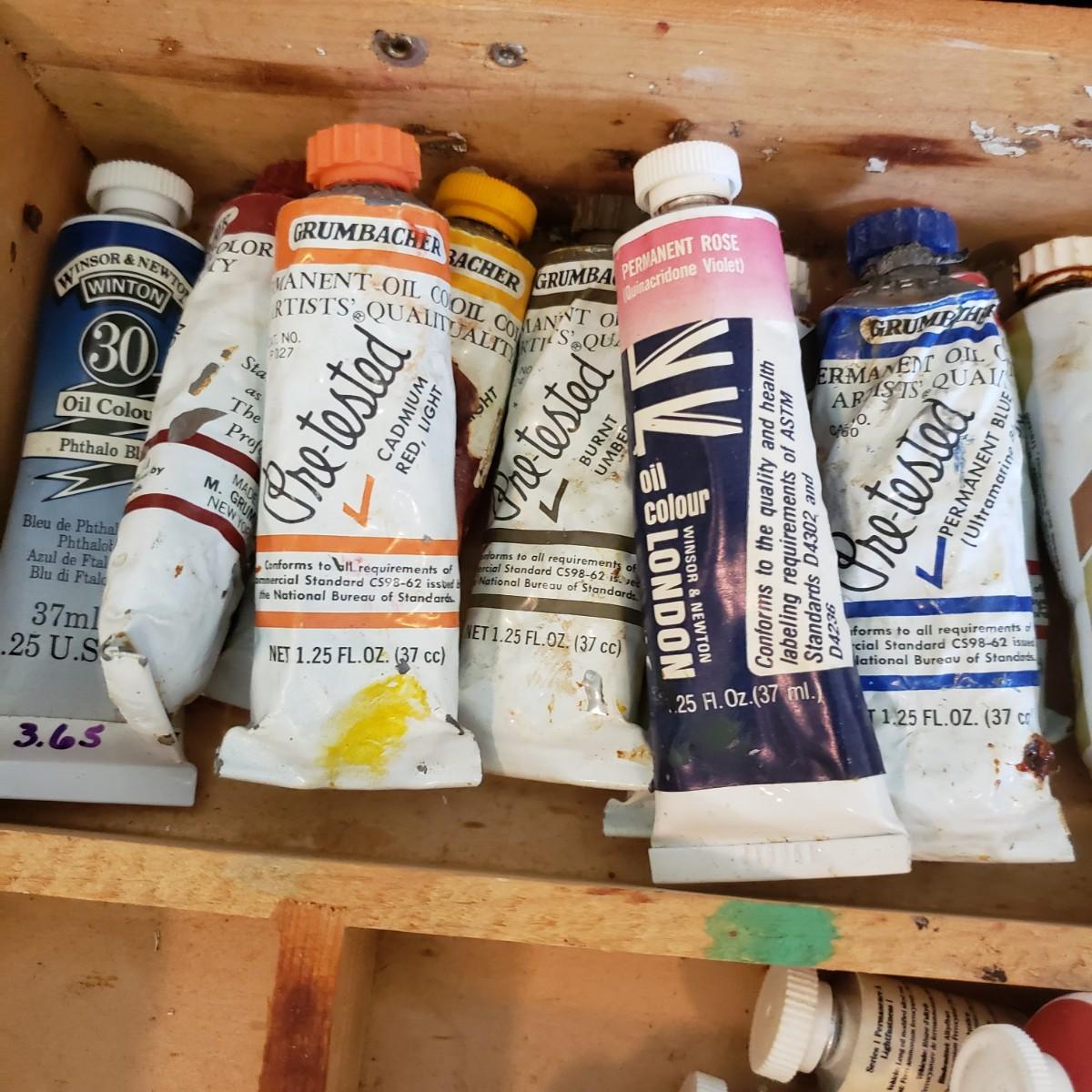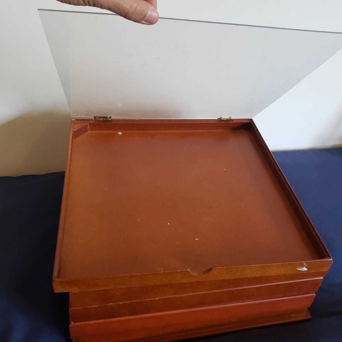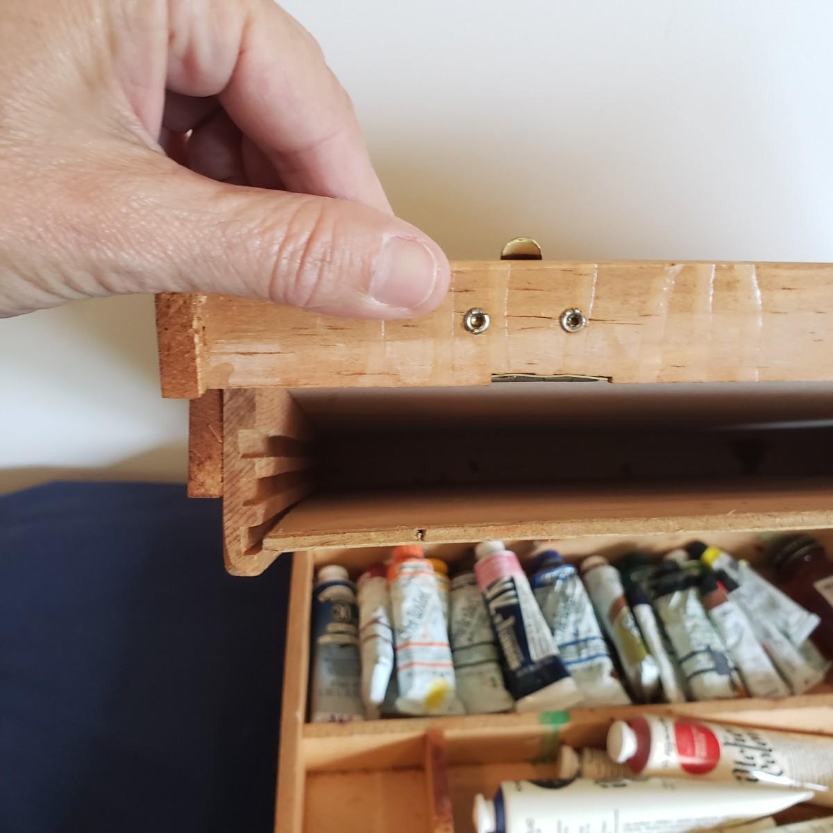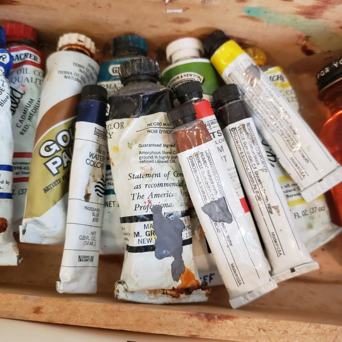 This art supply lot has a number of sketch books ready for your creativity! There are pictures of each book and a side view of how many pages are in each book. There is a brand new three pack of Fredrix 11" x 15" canvases. The six wooden easels measure 10" x 9" x 15"H when standing. The wood case with locks and a handle contains paint and brushes. The contents/age of the paint tubes cannot be guaranteed, but they do feel soft. The five tiered wood box that swivels from one corner can hold all your artistic supplies! The box measures 14" x 14" x 7"H. The lid is made of clear plexiglass.