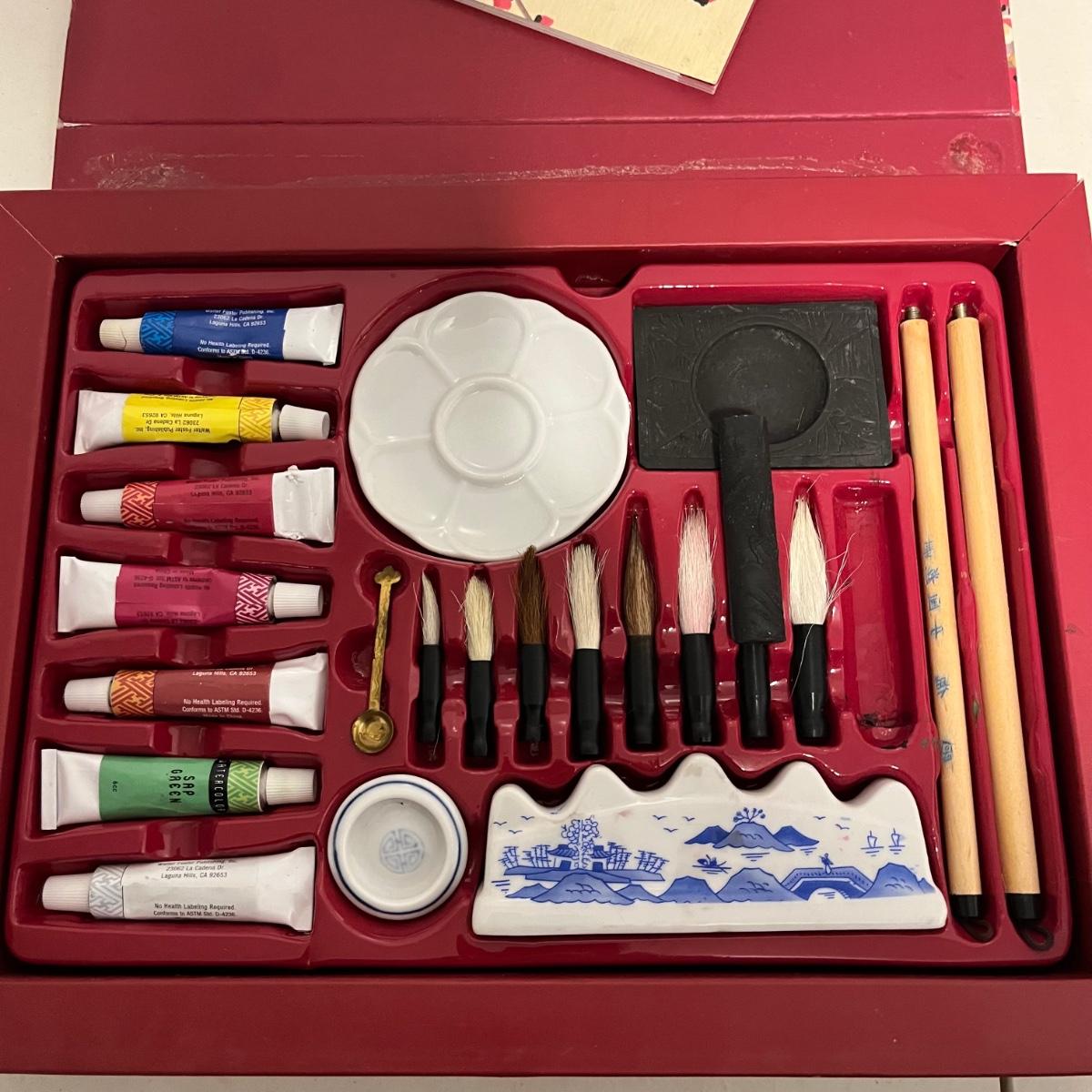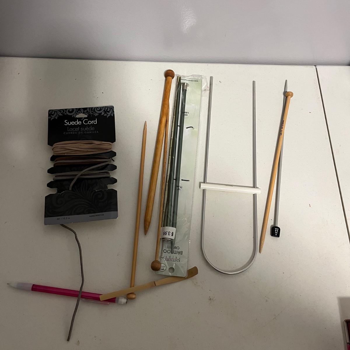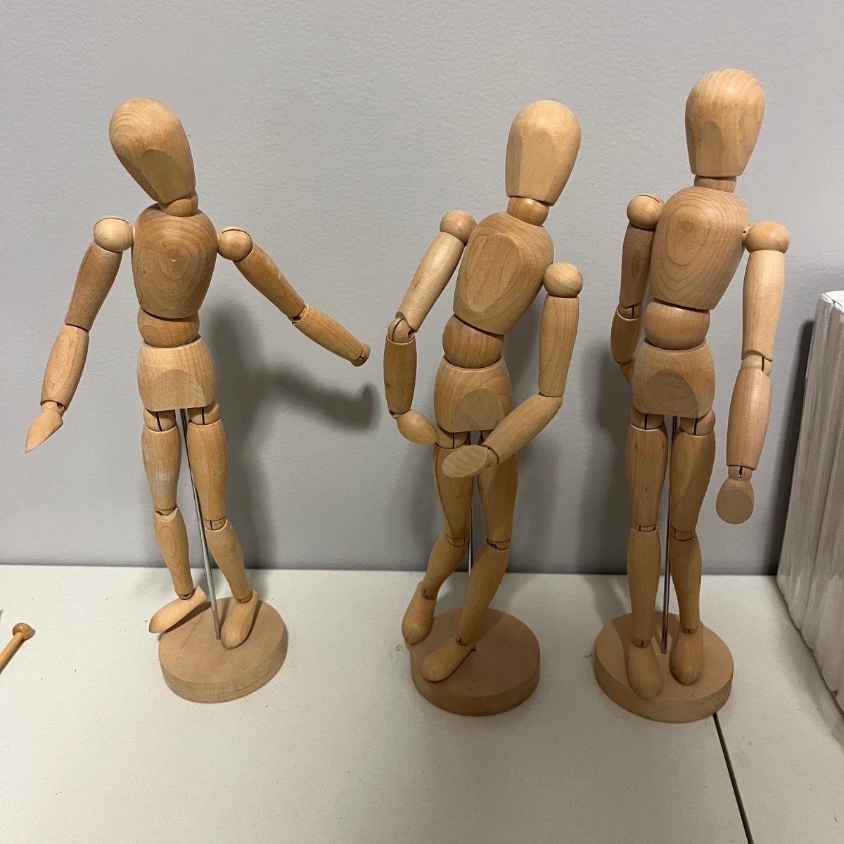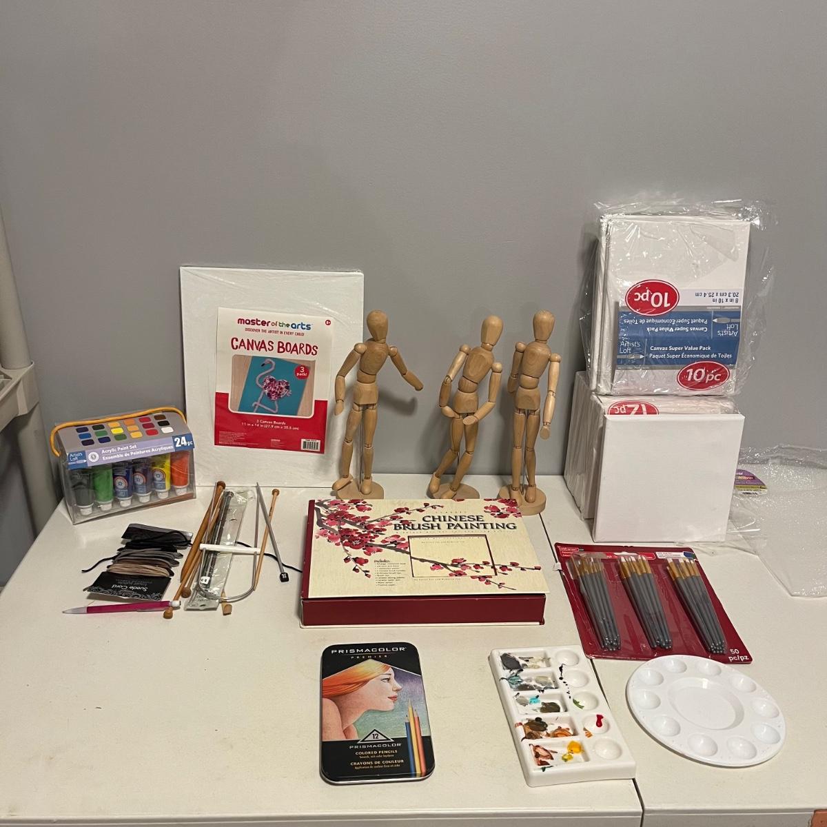 Lot includes Prismacolor pencils, set of brushes, canvas, Chinese brush painting kit, trio of wooden human form models, knitting needles and more. Models measure 3”D x 12”H.