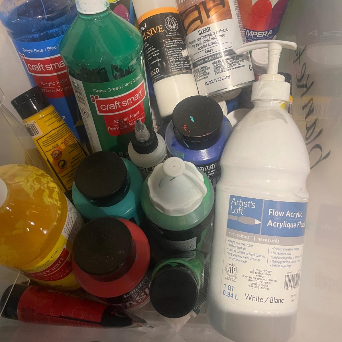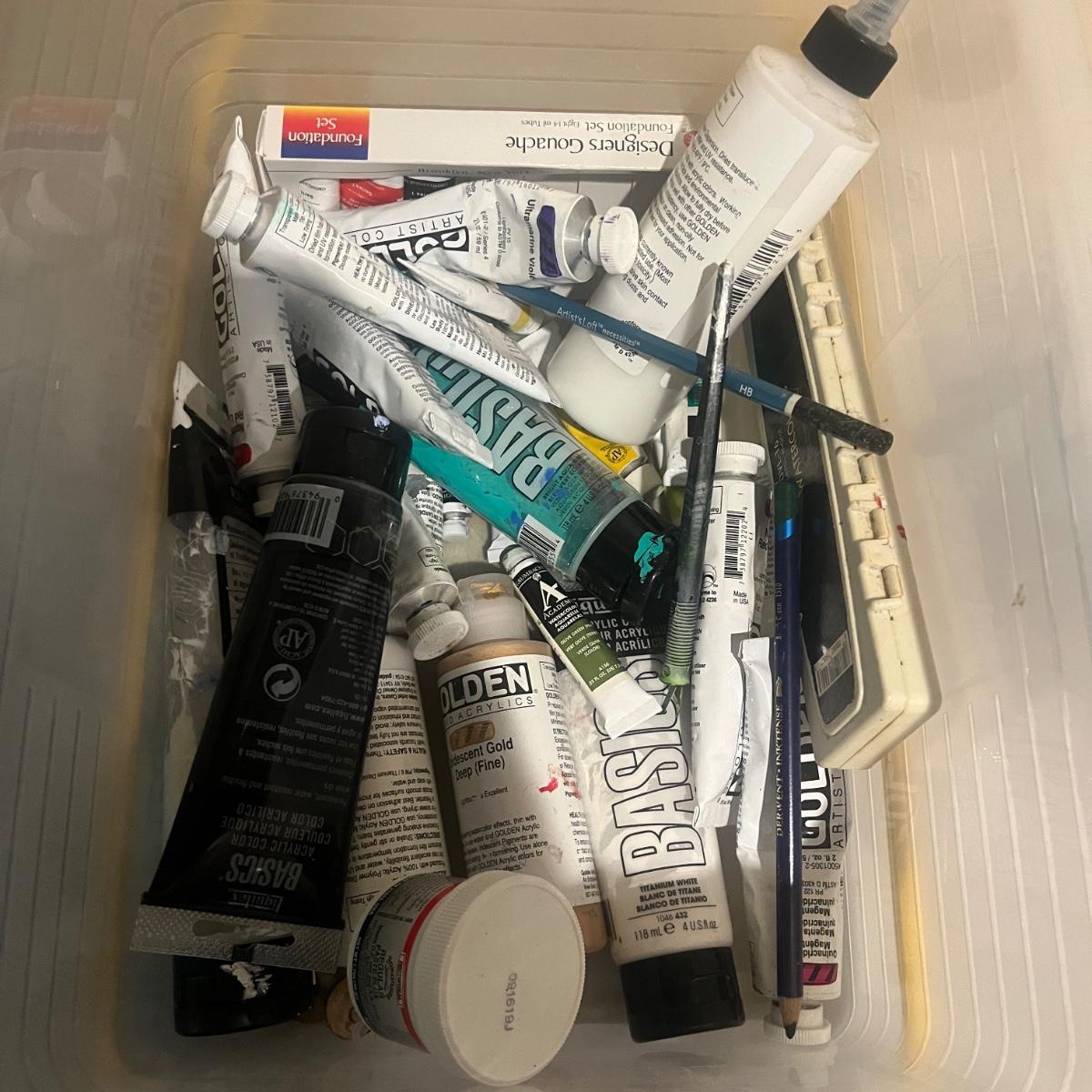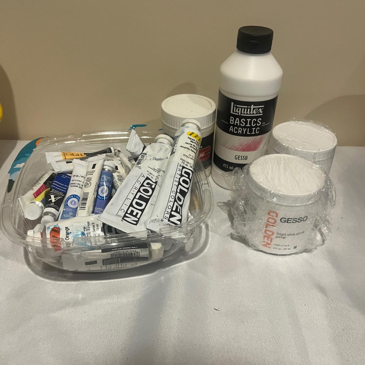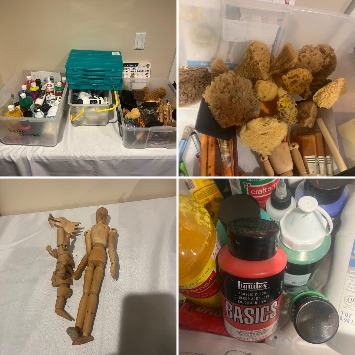 This collection of art supplies includes craft smart paint, tempera paint, Basics paint, Golden tube paint, Academy tube paint, natural sponges, paint brushes, pens, wooden figurines and more. Wooden figurine measures 12” long.