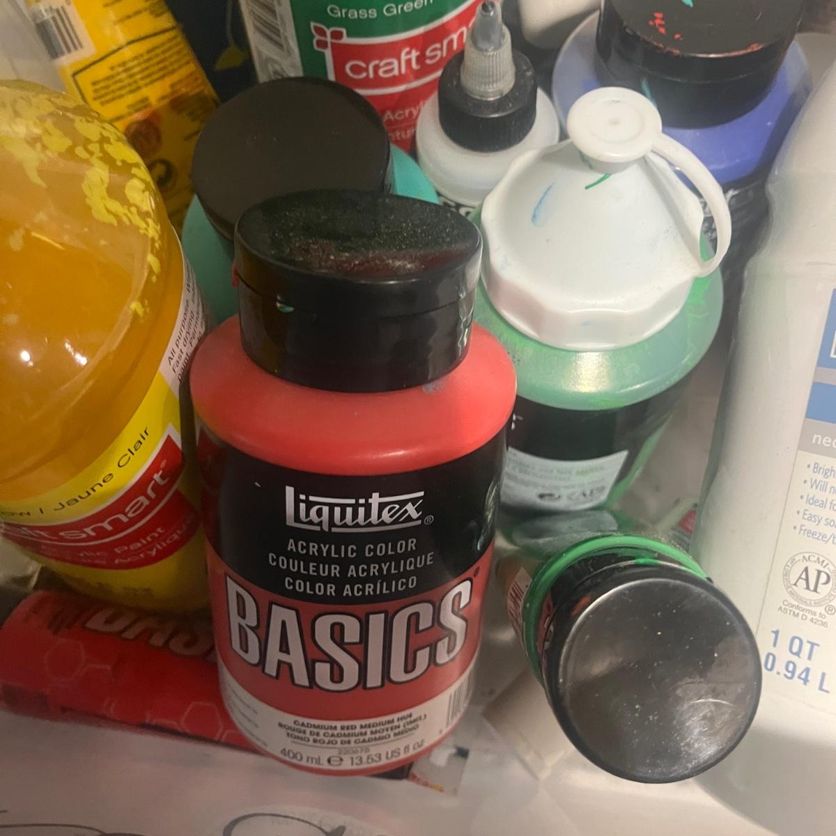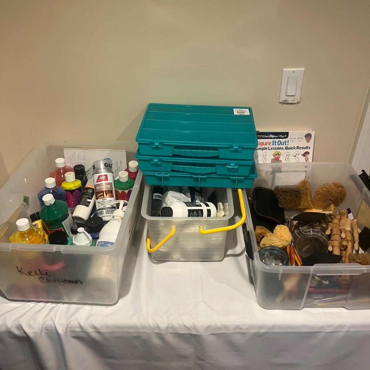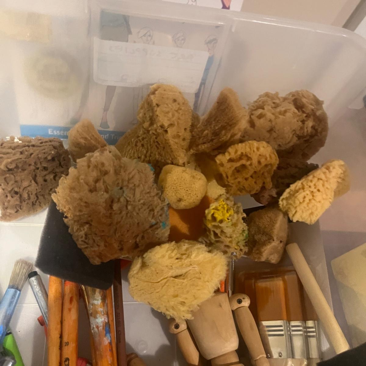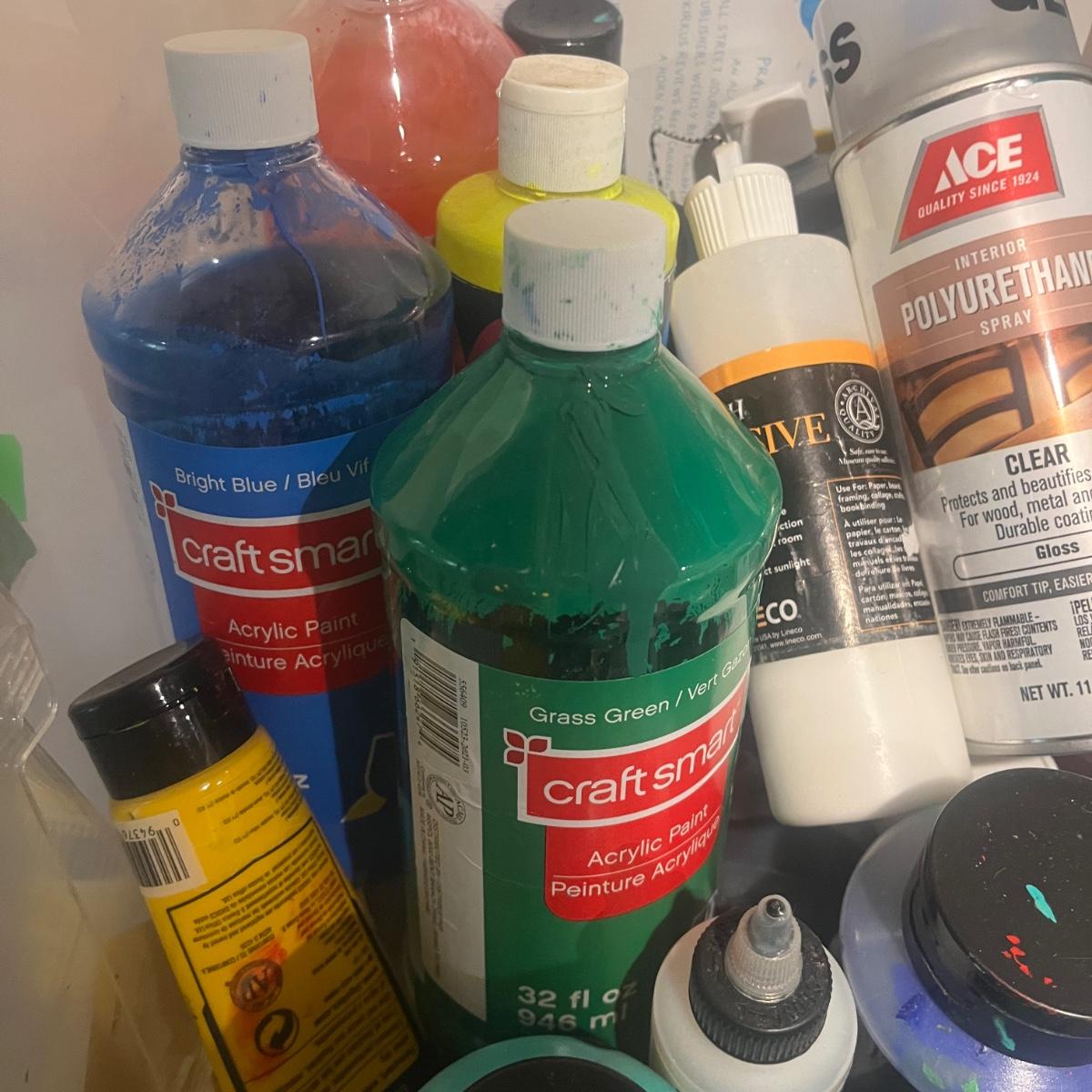 This collection of art supplies includes craft smart paint, tempera paint, Basics paint, Golden tube paint, Academy tube paint, natural sponges, paint brushes, pens, wooden figurines and more. Wooden figurine measures 12” long.