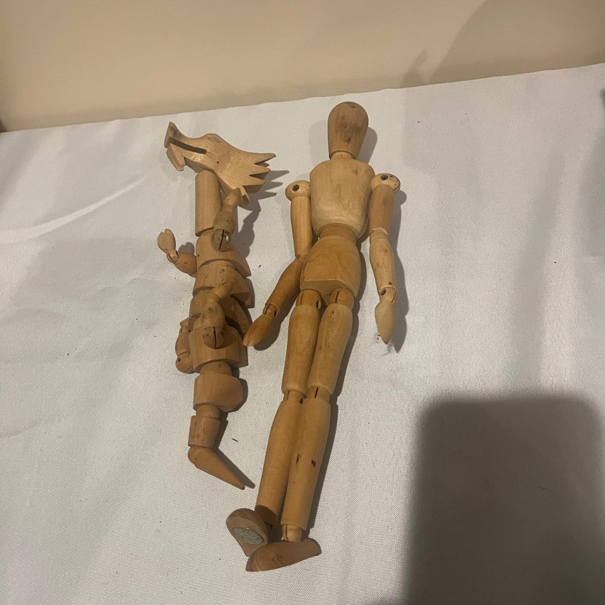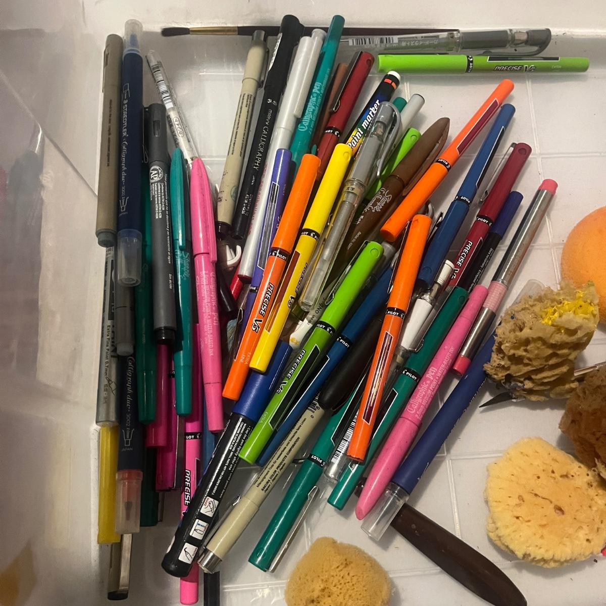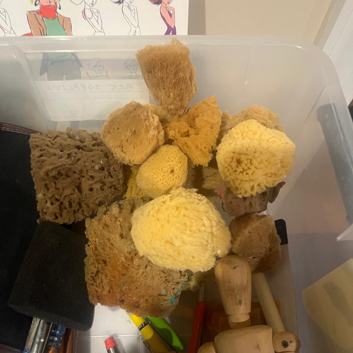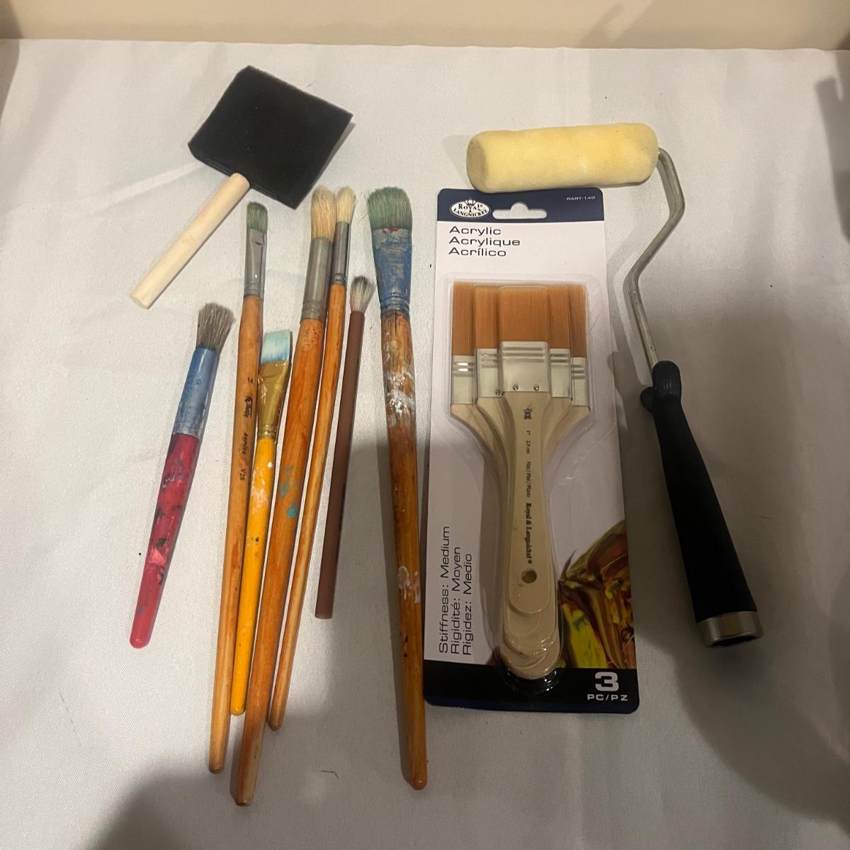This collection of art supplies includes craft smart paint, tempera paint, Basics paint, Golden tube paint, Academy tube paint, natural sponges, paint brushes, pens, wooden figurines and more. Wooden figurine measures 12” long.