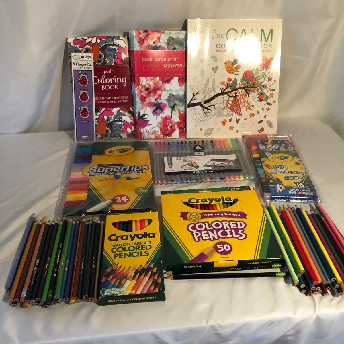 This Lot includes over sixty CraZart colored pencils, Crayola colored pencils in fifty and twenty four packs, Crayola markers in sixteen and twenty four packs, Staedtler twenty pack of porous point pens, two adult coloring books and a large print crossword.