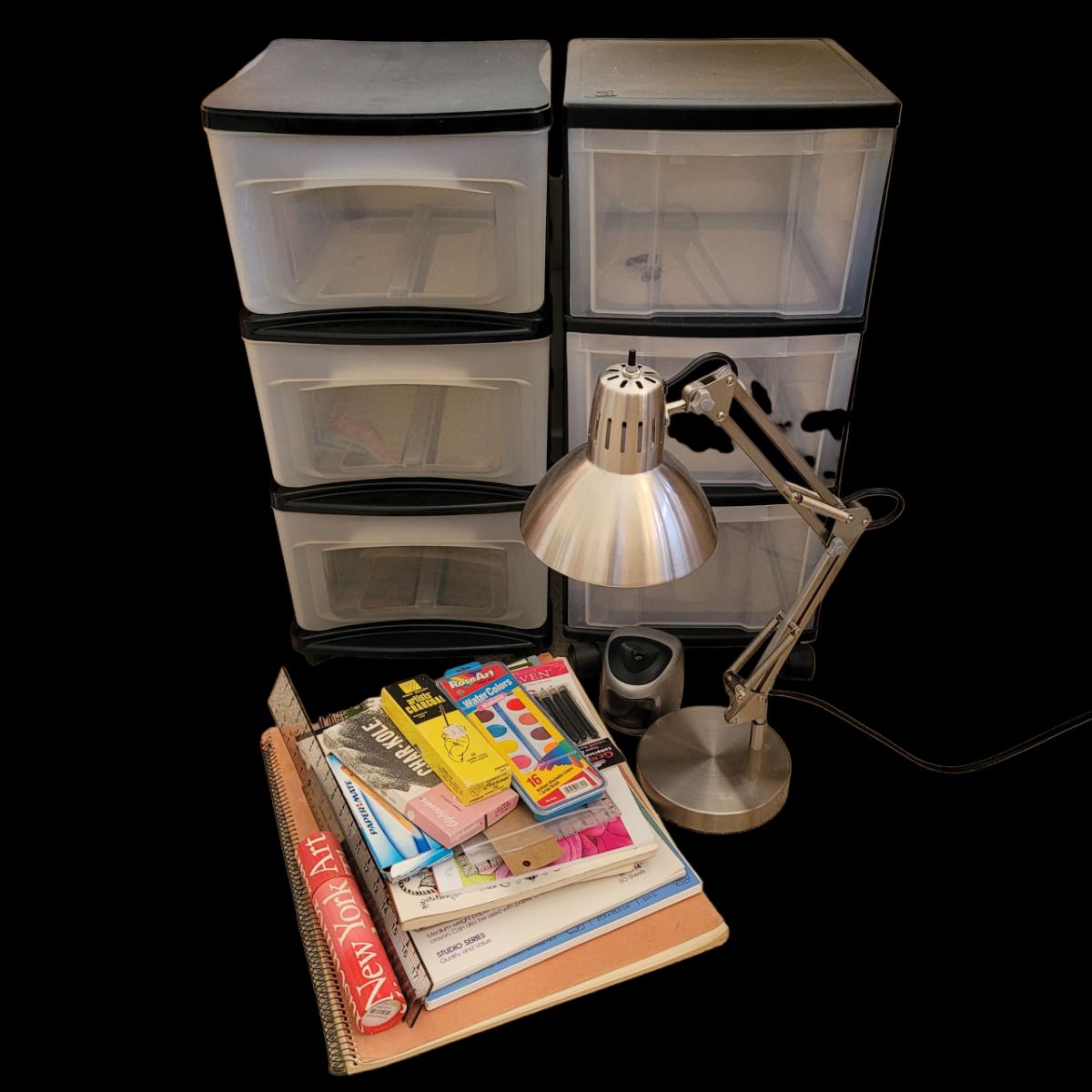 Art Supplies, Plastic Drawers, and Metal Table Lamp (BR2-EL)