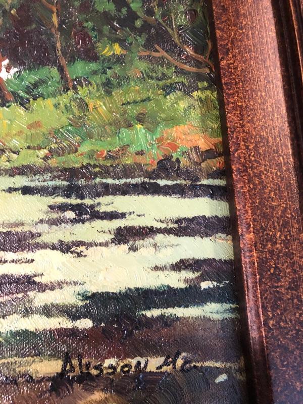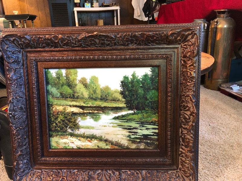 Hand painted Original Artwork: wooded forest and stream with beautiful ornate brown frame. 25 1/2 x