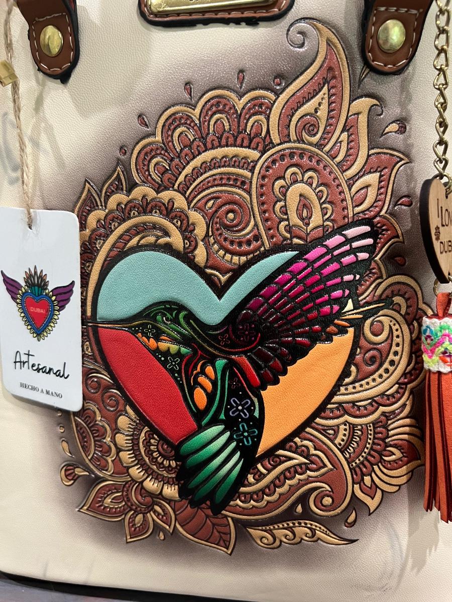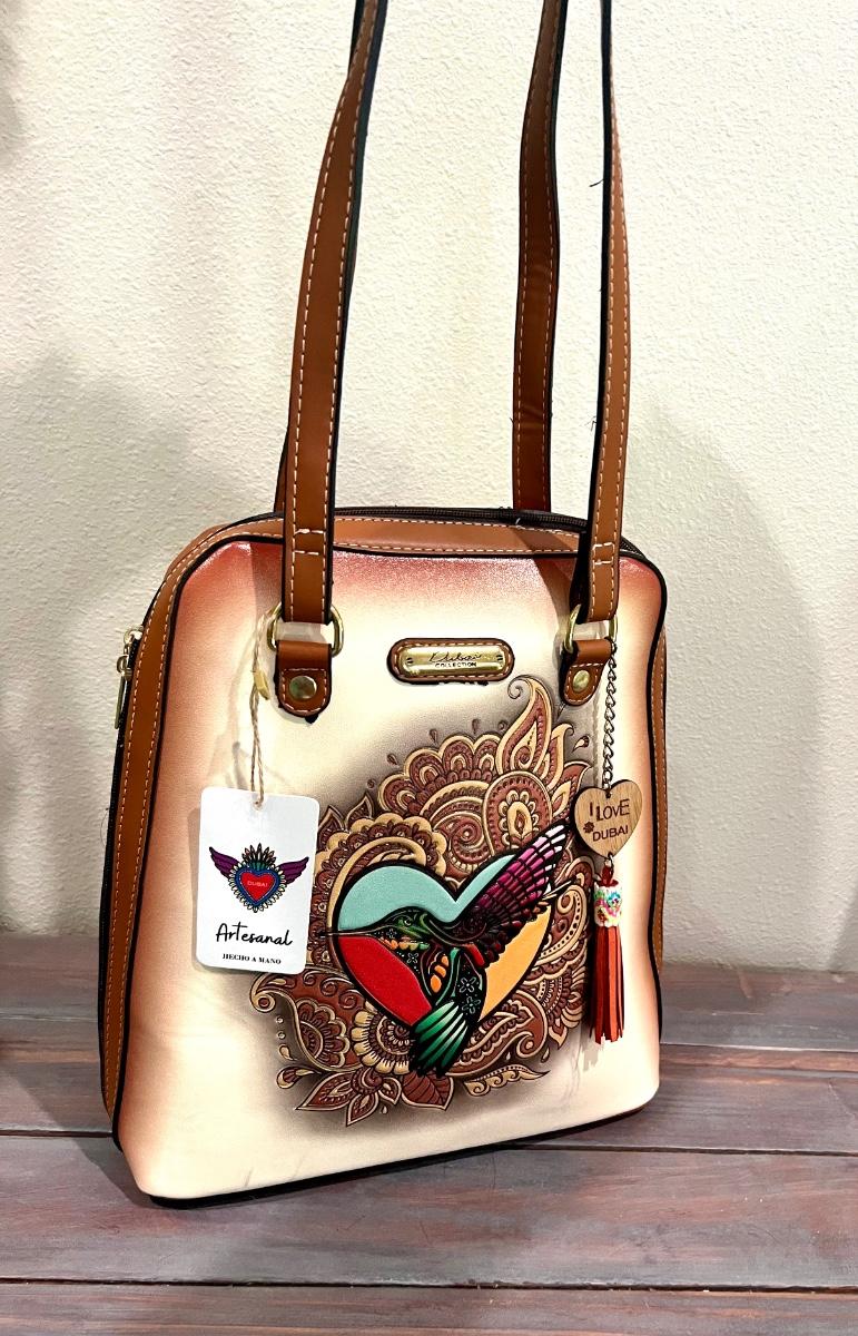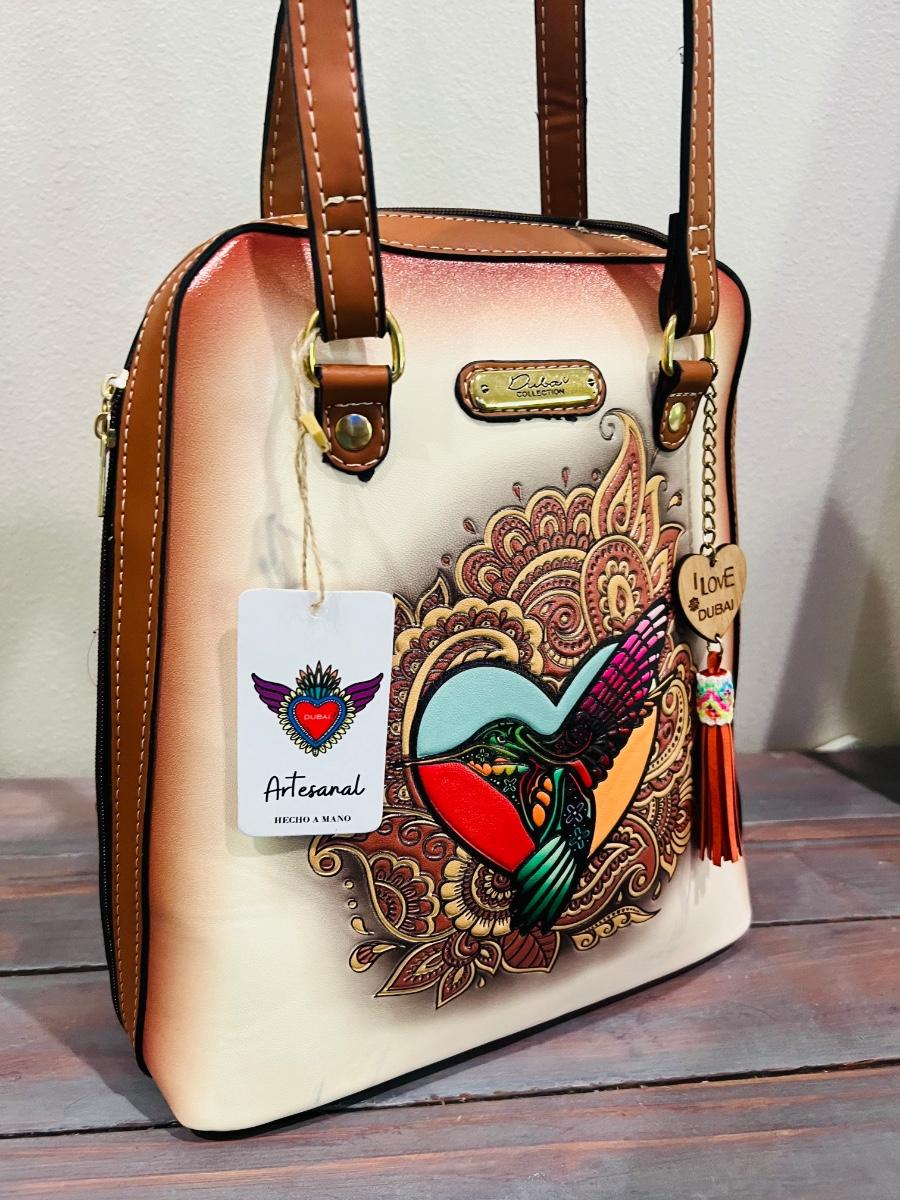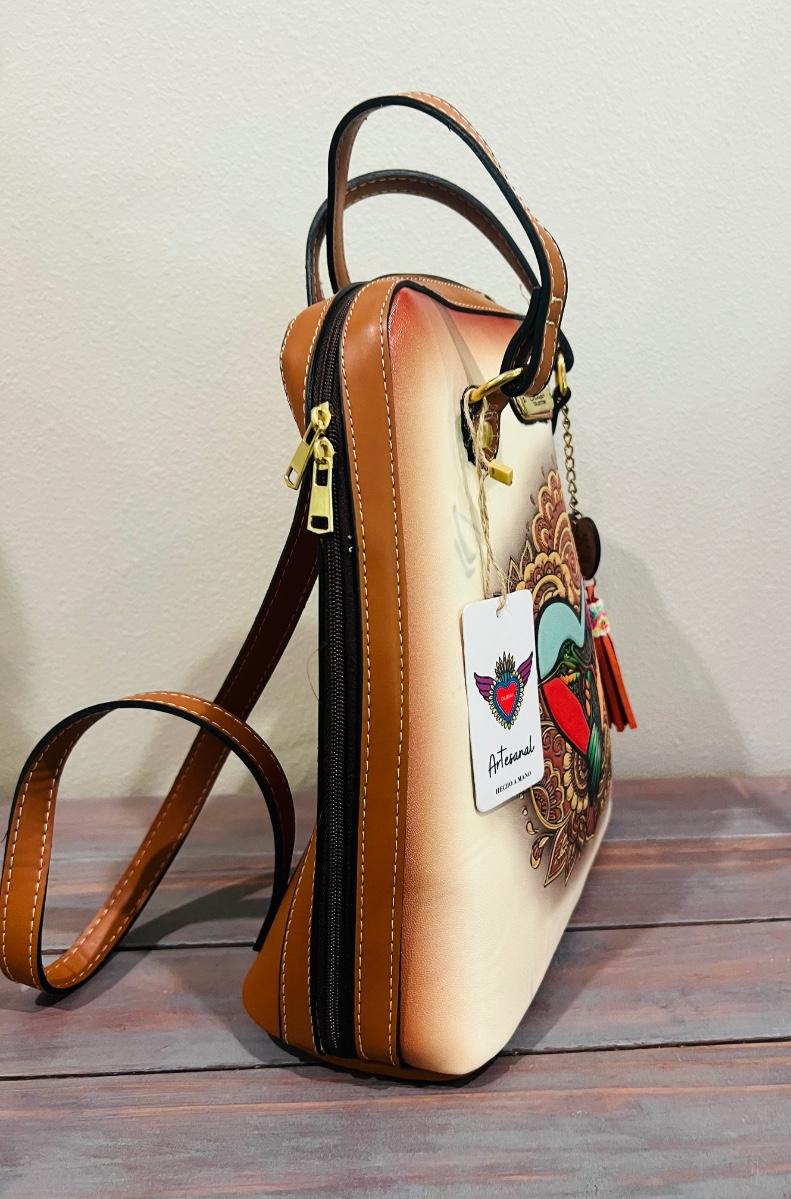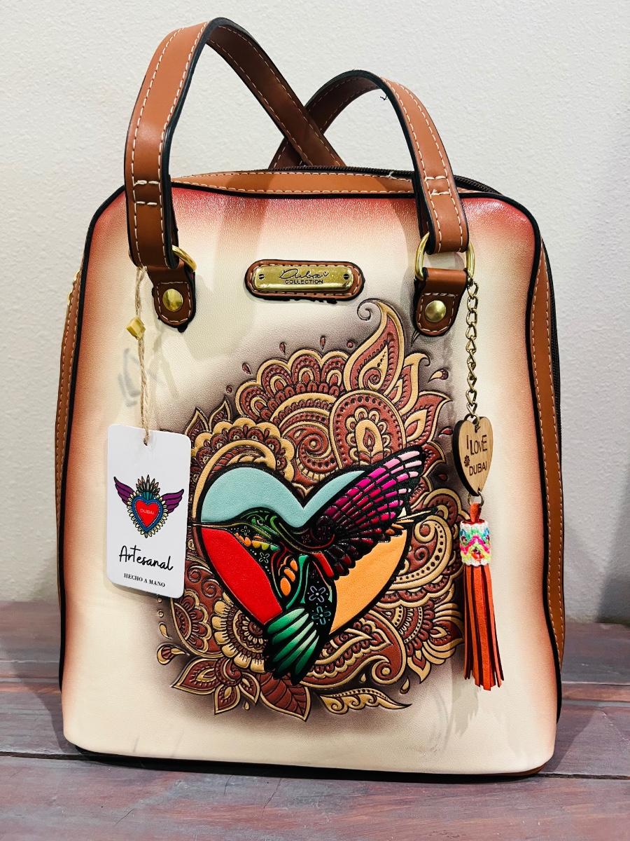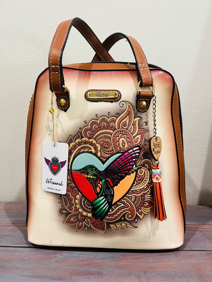 Brand new ARTESANAL Hummingbird Embossed Bag Dubois with tags. Has a back zipper for extra storage. This can be worn as a backpack or as a shoulder strap. Measures approximately 12 1/2 inches tall and approximately 12 inches wide.