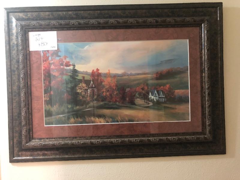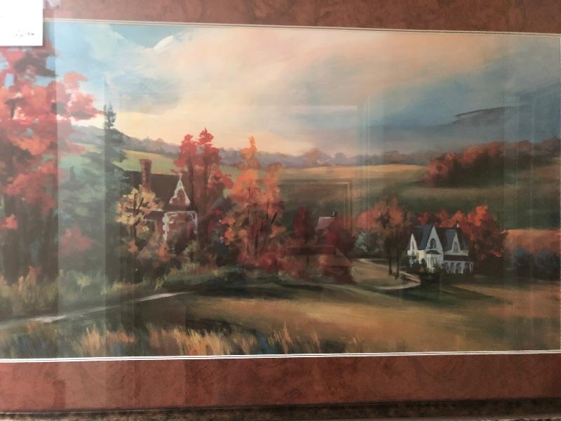 Large art piece featuring houses surrounded by fall trees. Dark frame with burgundy matting