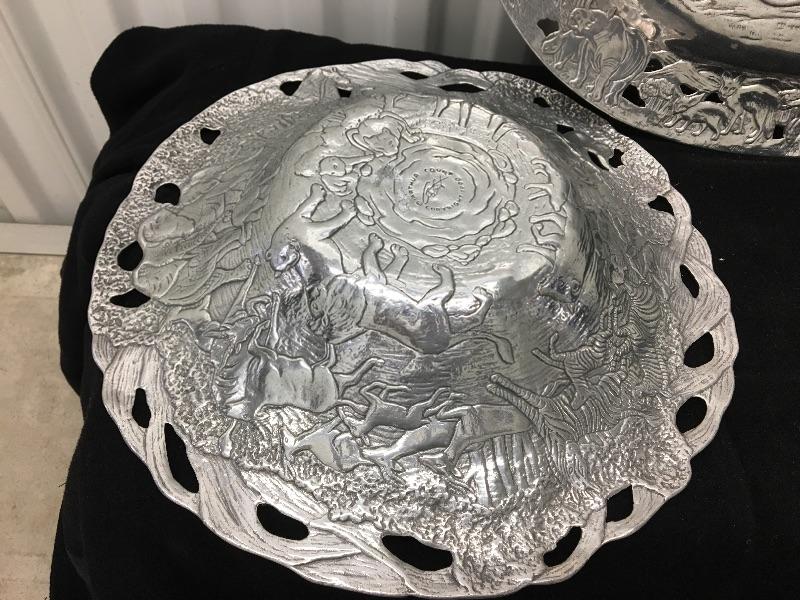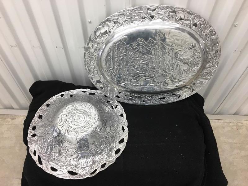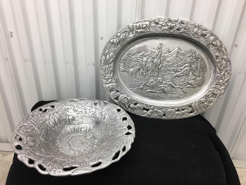 Designer set of serving pieces in excellent condition. Platter measures 19”w x 14”h. Bowl measures 14” across the top.
