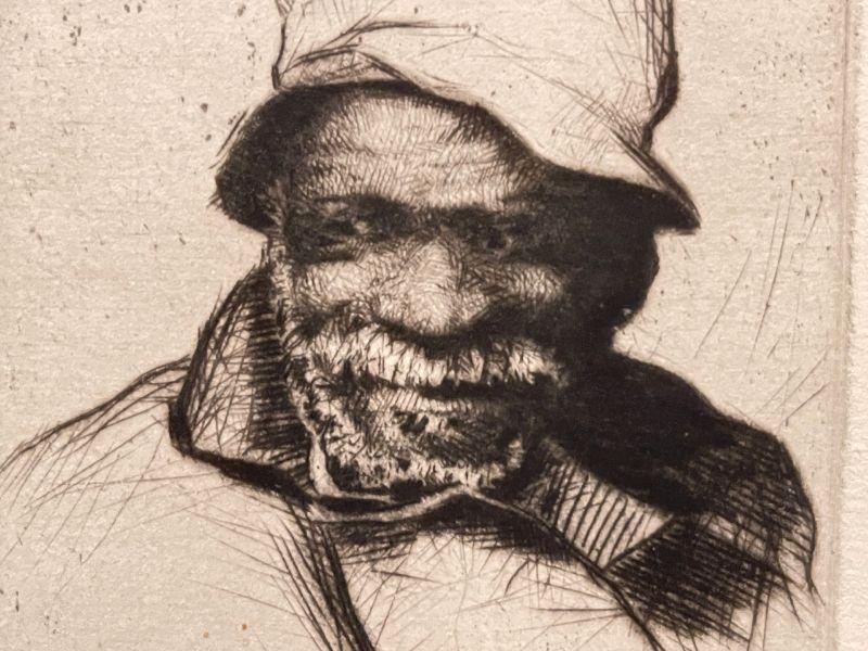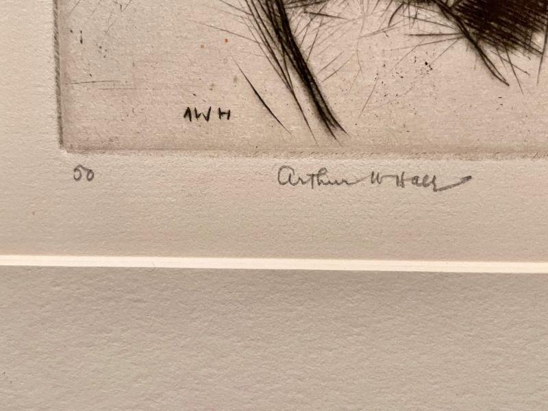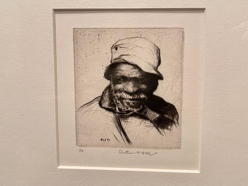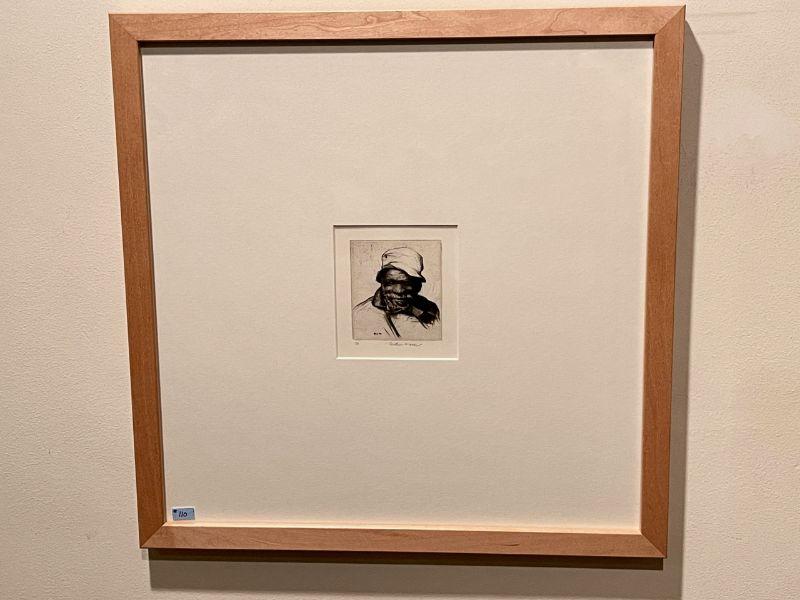 This is a small original print by founding Prairie Printmaker member Arthur W. Hall. The truly masterful rendering features a bust length portrait of an older, former slave, black gentleman wearing a heavy coat and well-worn hat. Appraised at $495.