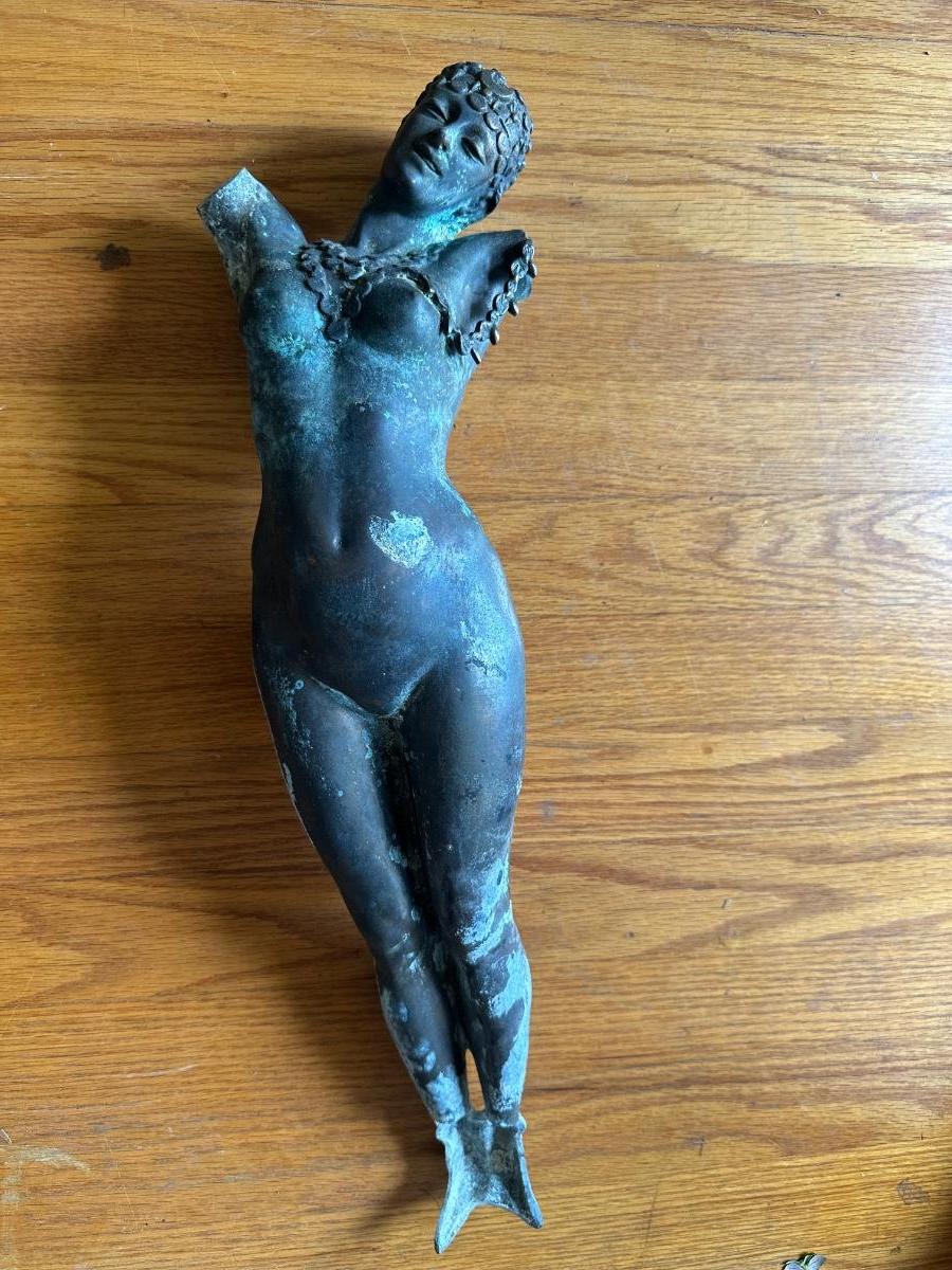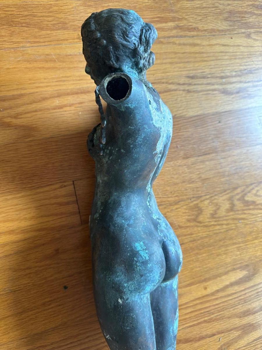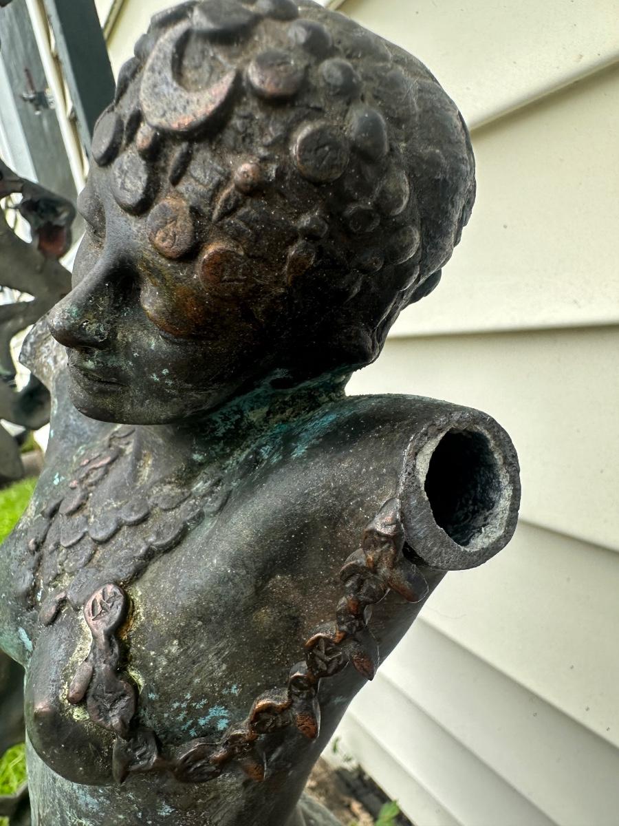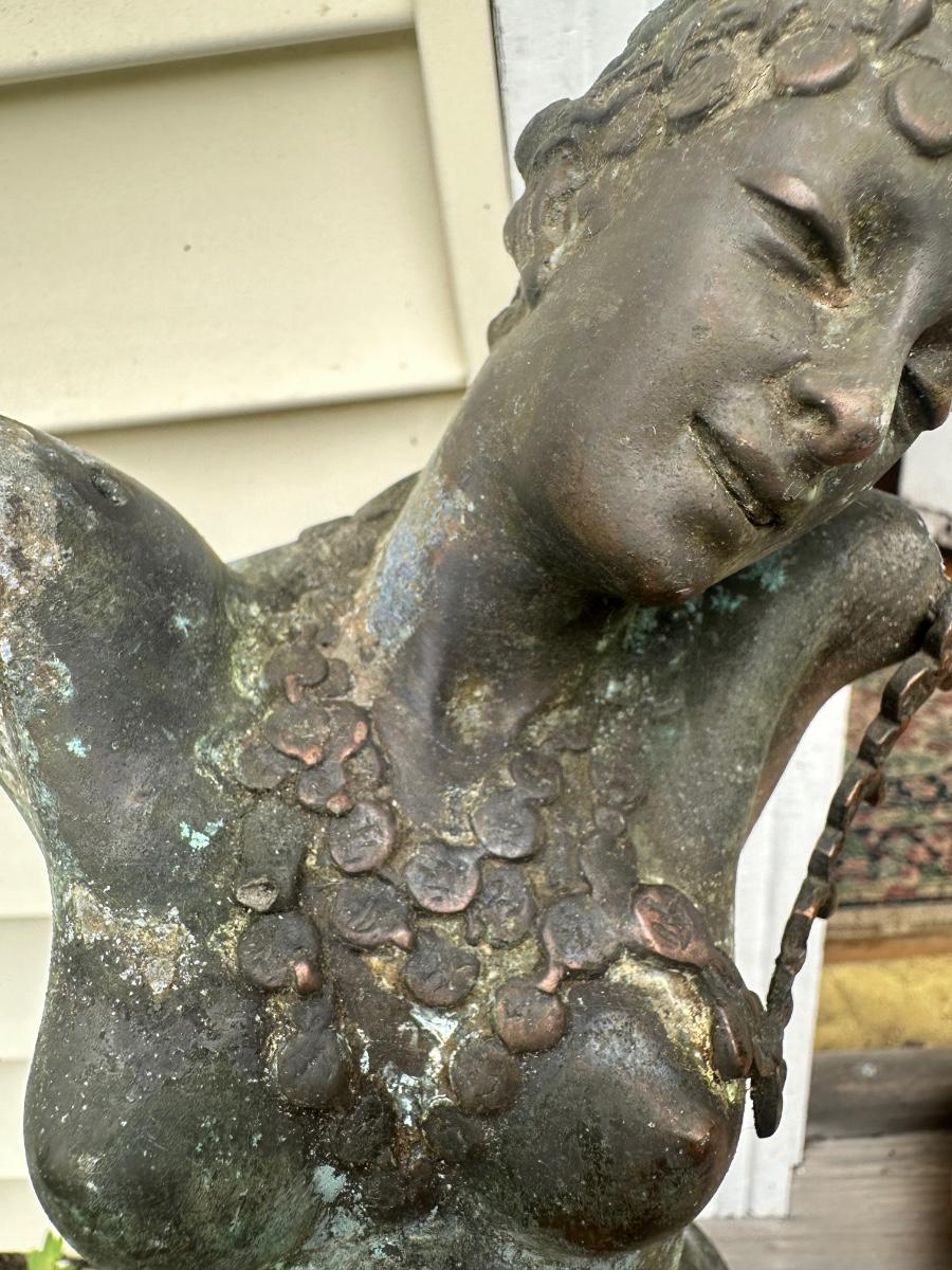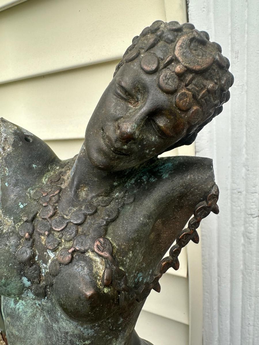 This beautiful piece needs to be repaired! The arms and base of her feet need to be reattached. Her fingers need some repair, see pictures. She is also missing her tambourine which rests in her hand.