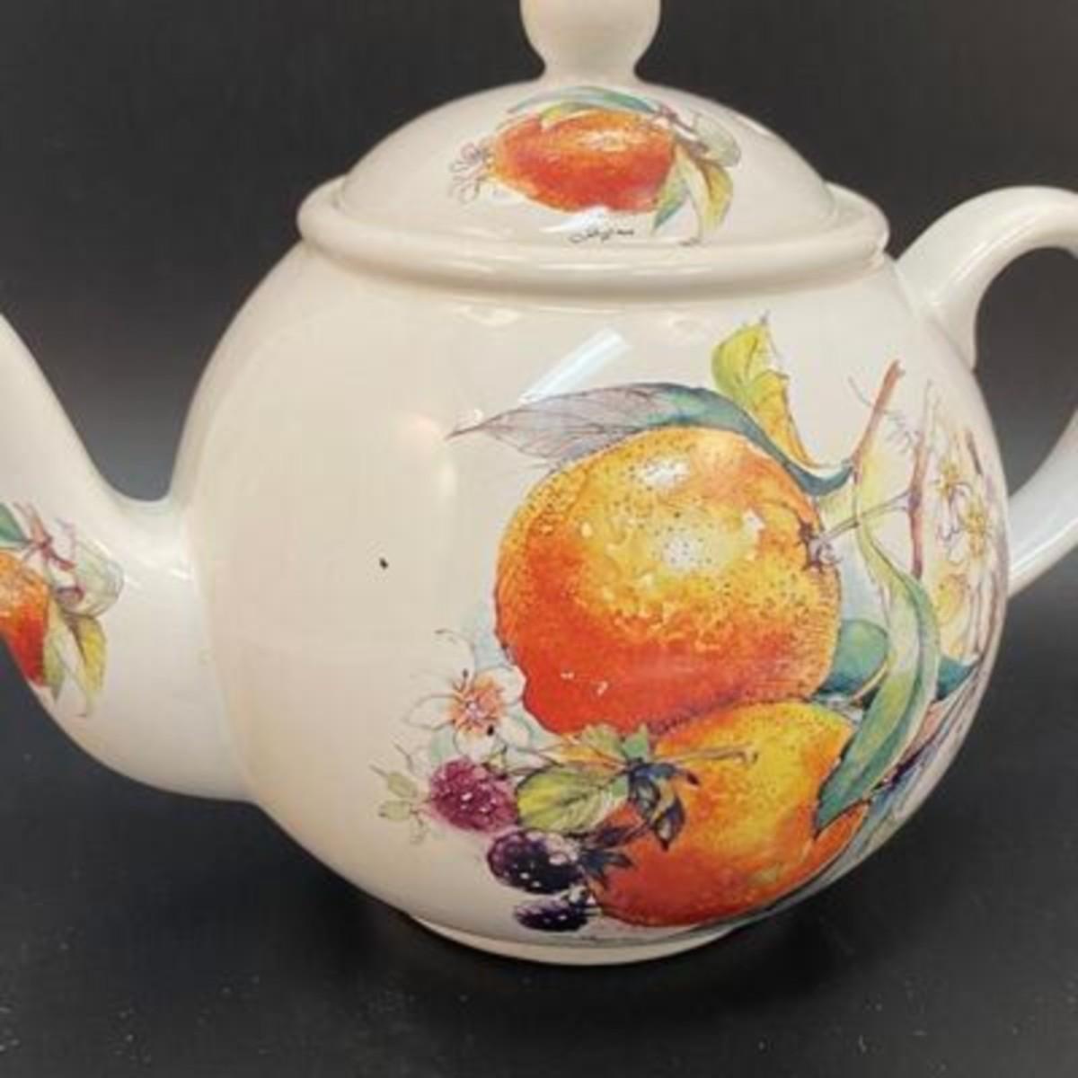 Arthur Wood Ceramic Teapot. Features citrus fruit and berries on one side and grapes and pears on the other. Good condition.