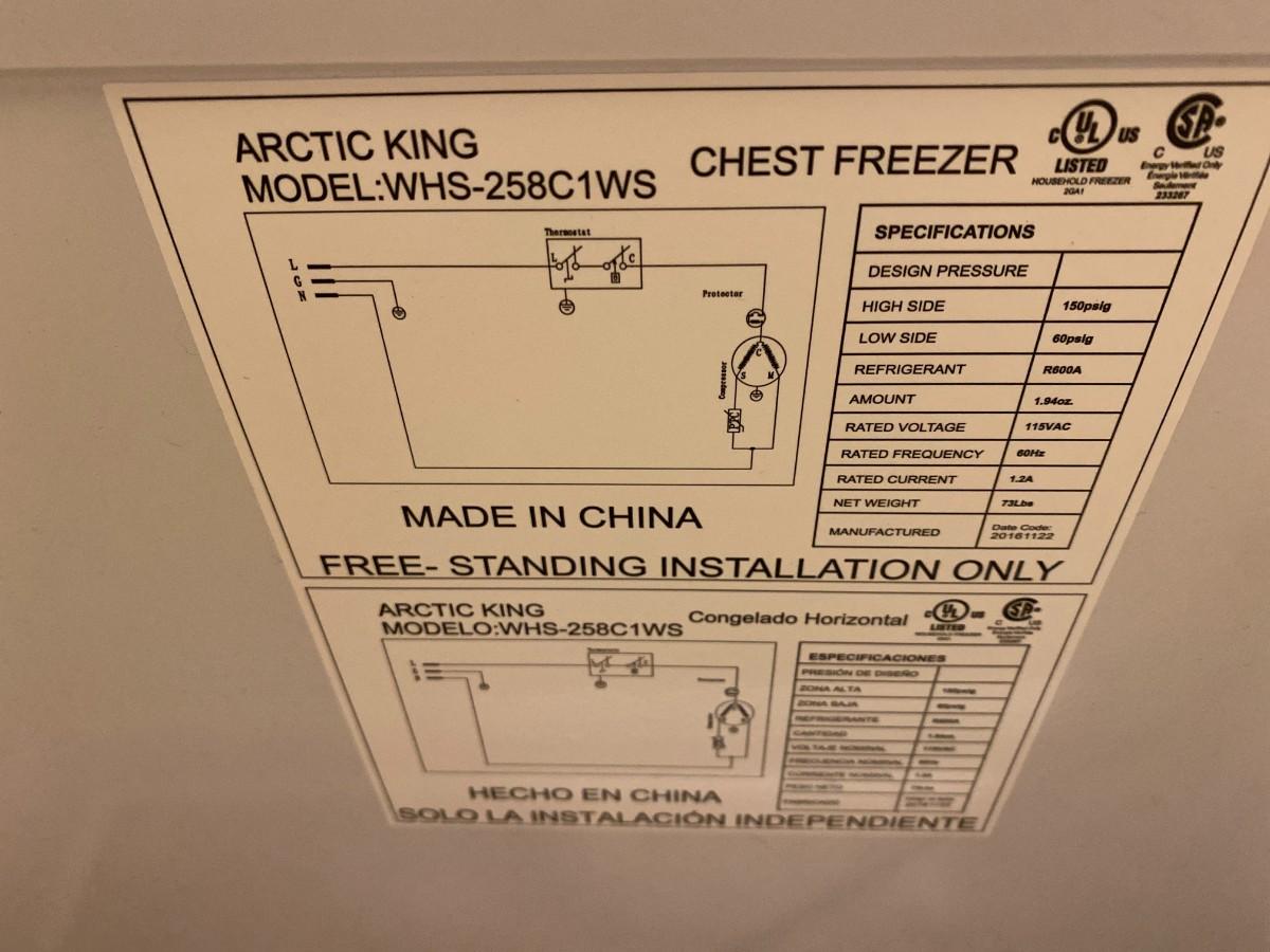 Artic King chest frezzer. Model no. WHS-258C1WS. Approx. 33" H x 37" W x 19-1/2" D