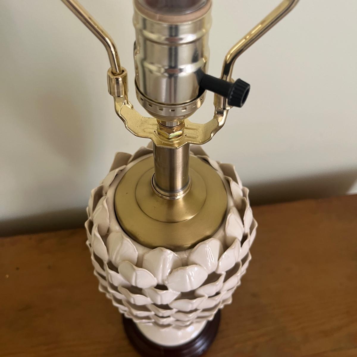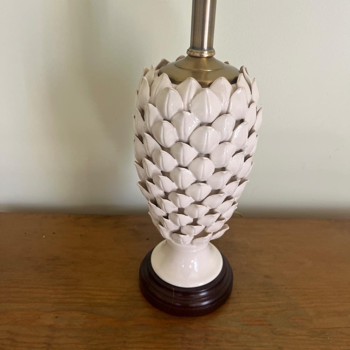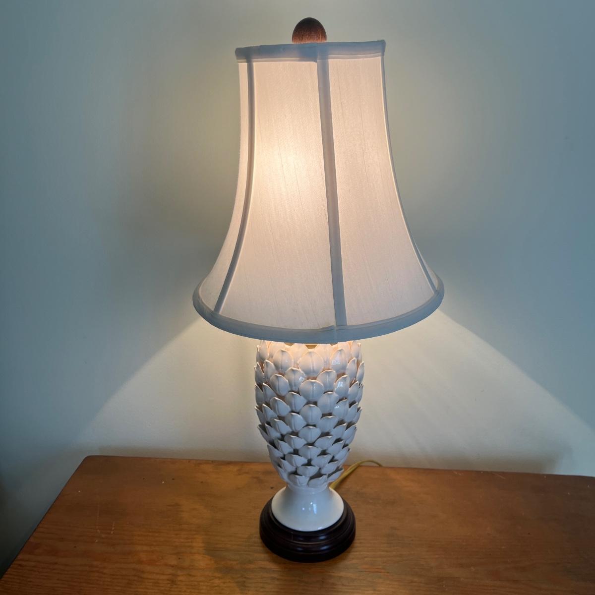 Lot includes a ceramic table lamp that appears to be shaped like an artichoke. Lamp measures 11”D x 25”H with shade. Lamp powered on when plugged in.
