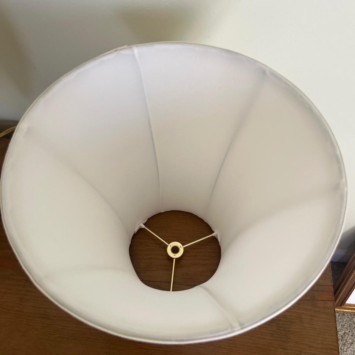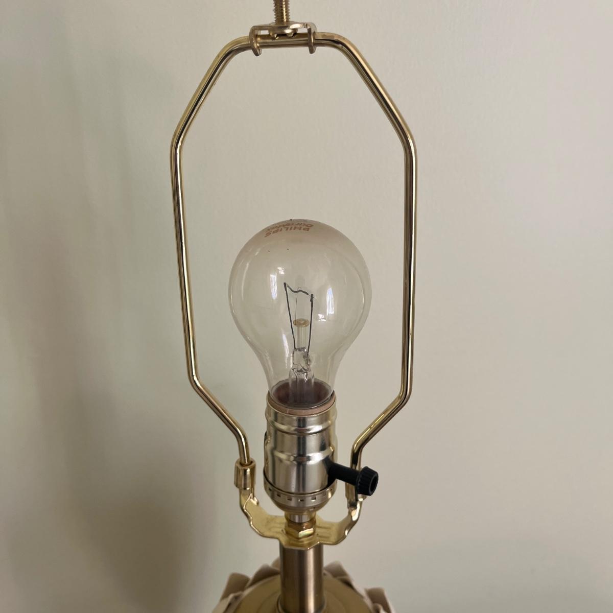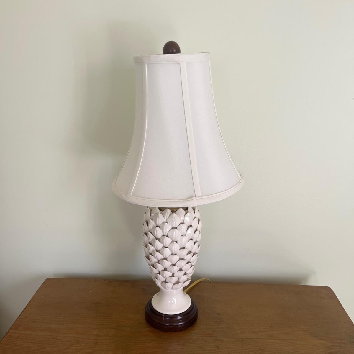 Lot includes a ceramic table lamp that appears to be shaped like an artichoke. Lamp measures 11”D x 25”H with shade. Lamp powered on when plugged in.