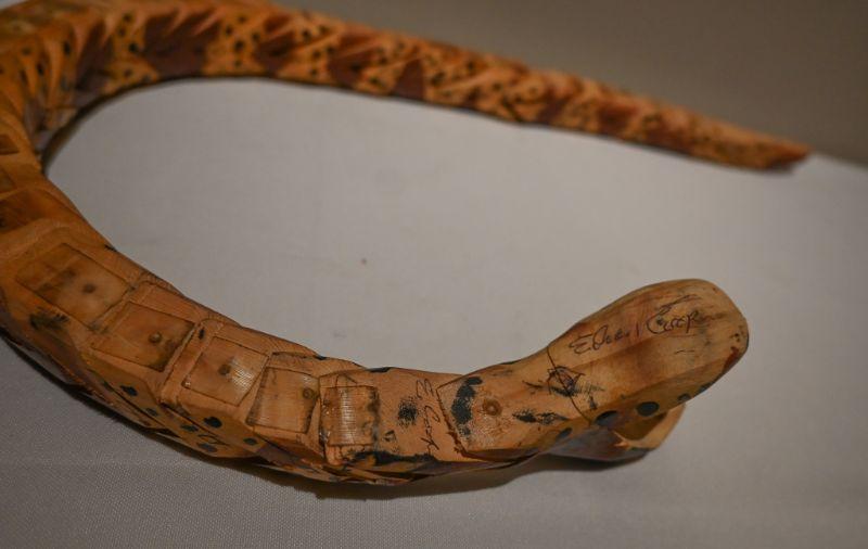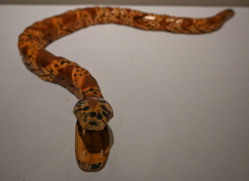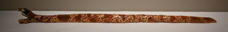 An articulated snake carving by Edward Cooper. Wood. Approx. 34.5" x 1.5" x 2.5". Please note, this piece is missing one tooth and one eye.