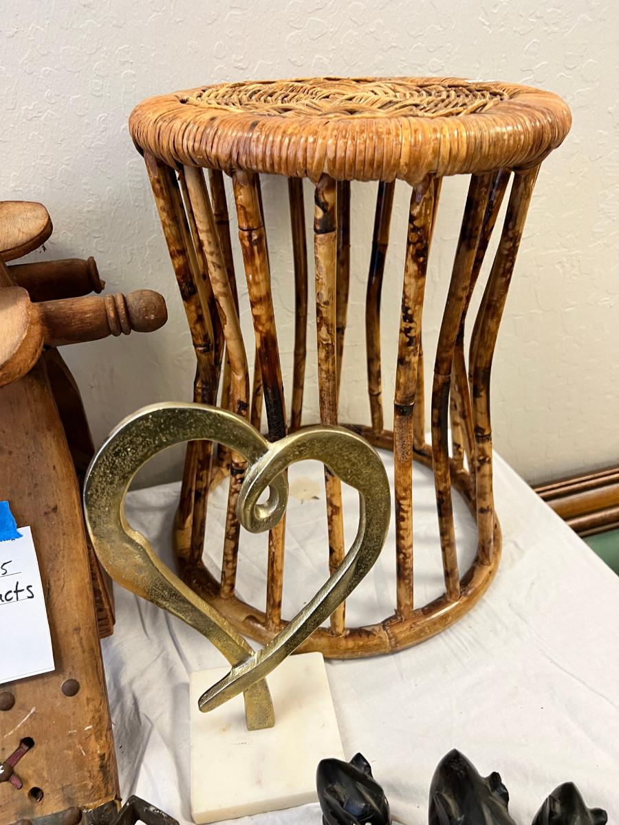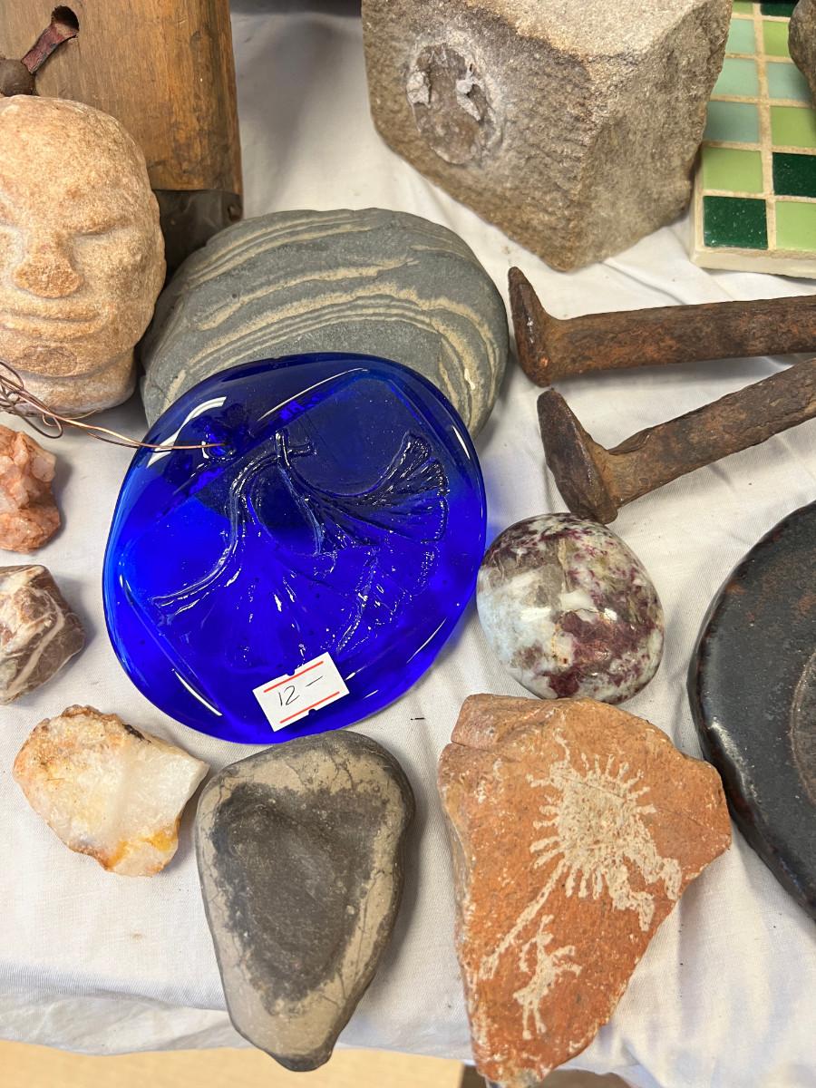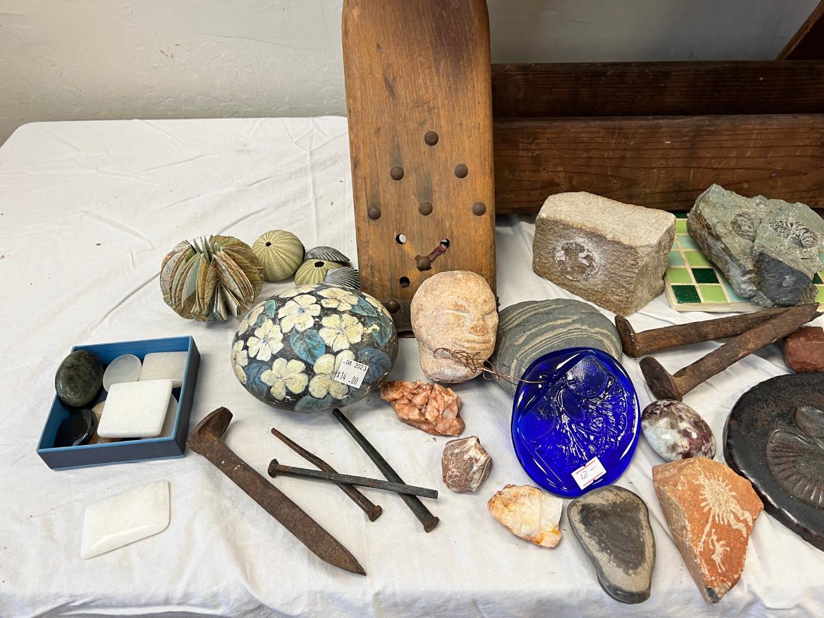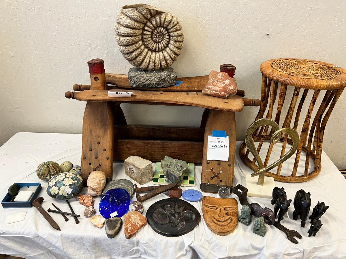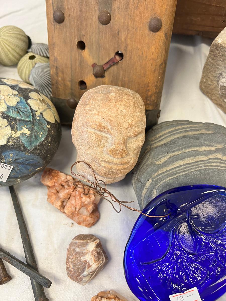 Camel Saddle, Pressed glass Ginko flower, Cobble Stone, Painted rock, Petroglyph etchings. Brass and Marble heart, Shell fossil planter, square nails, set of ebony elephants, rattan stool, (Africa) Model A wrench, shells.