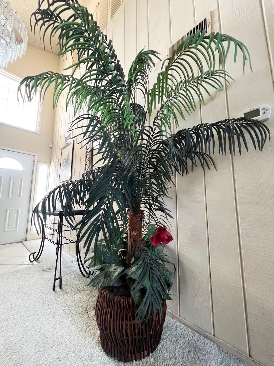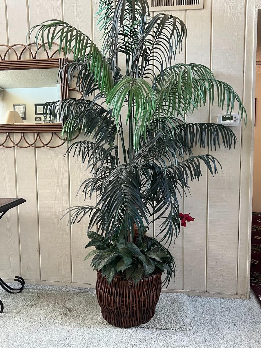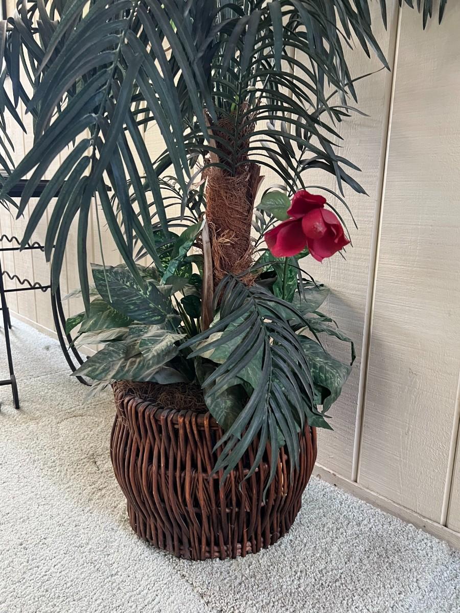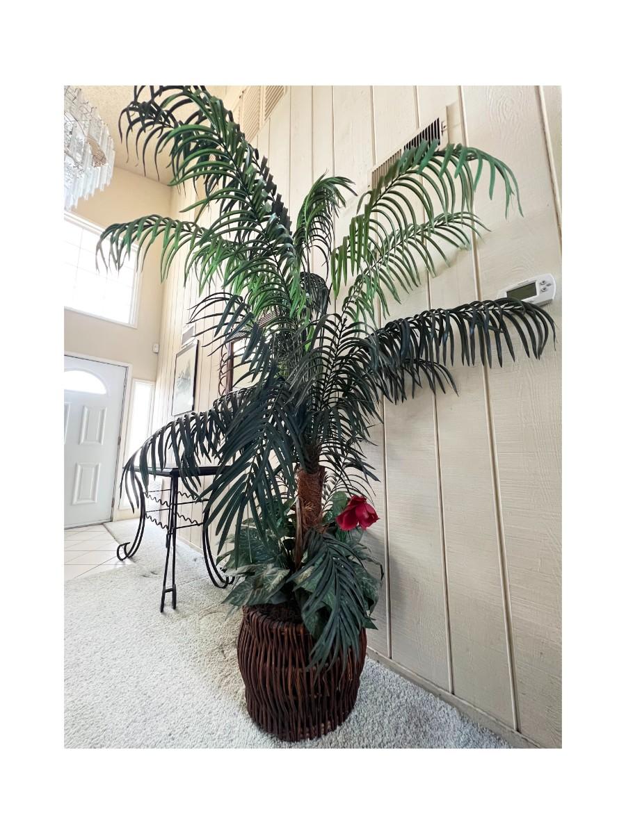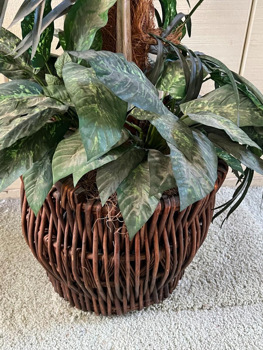Artificial Faux Palm Tree in Woven Branch Basket. Good condition may be dusty from age and display.