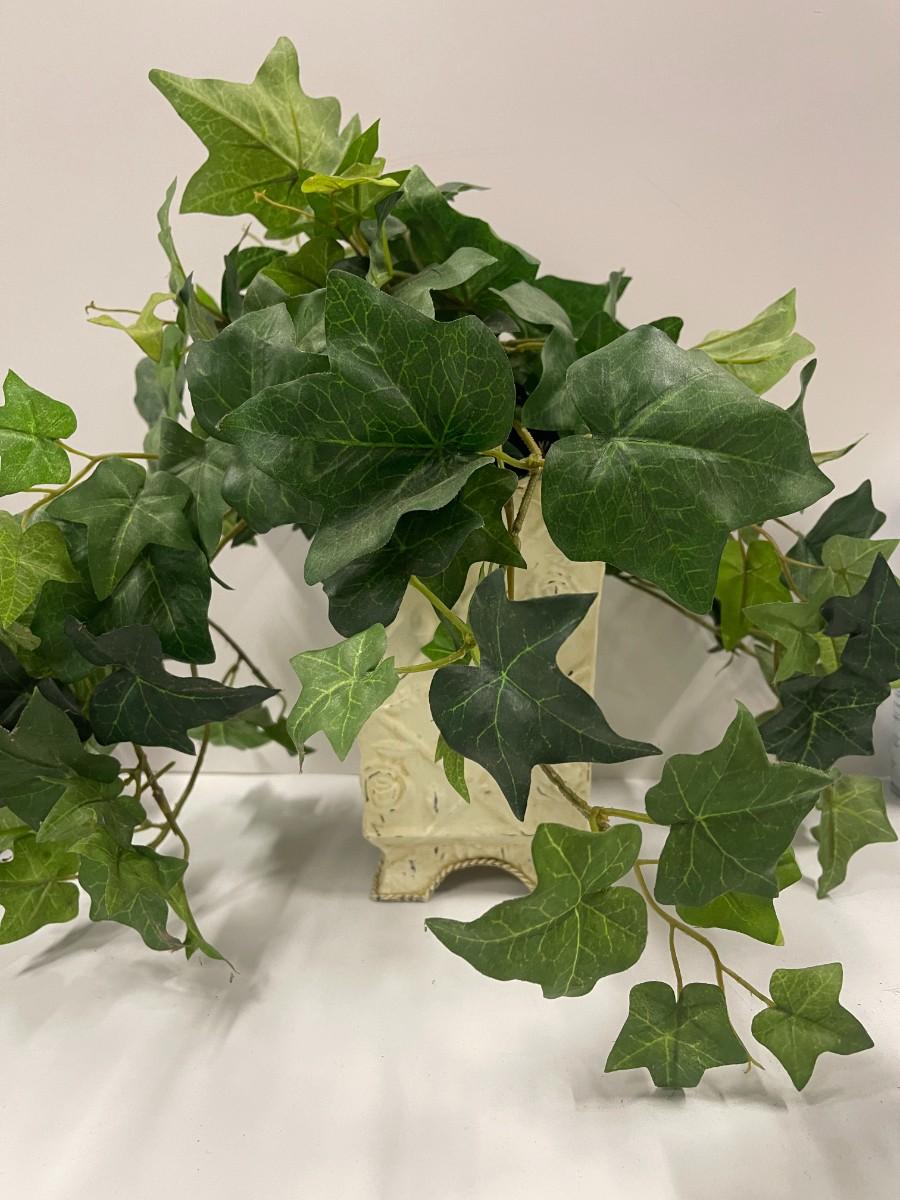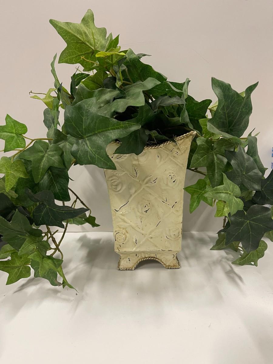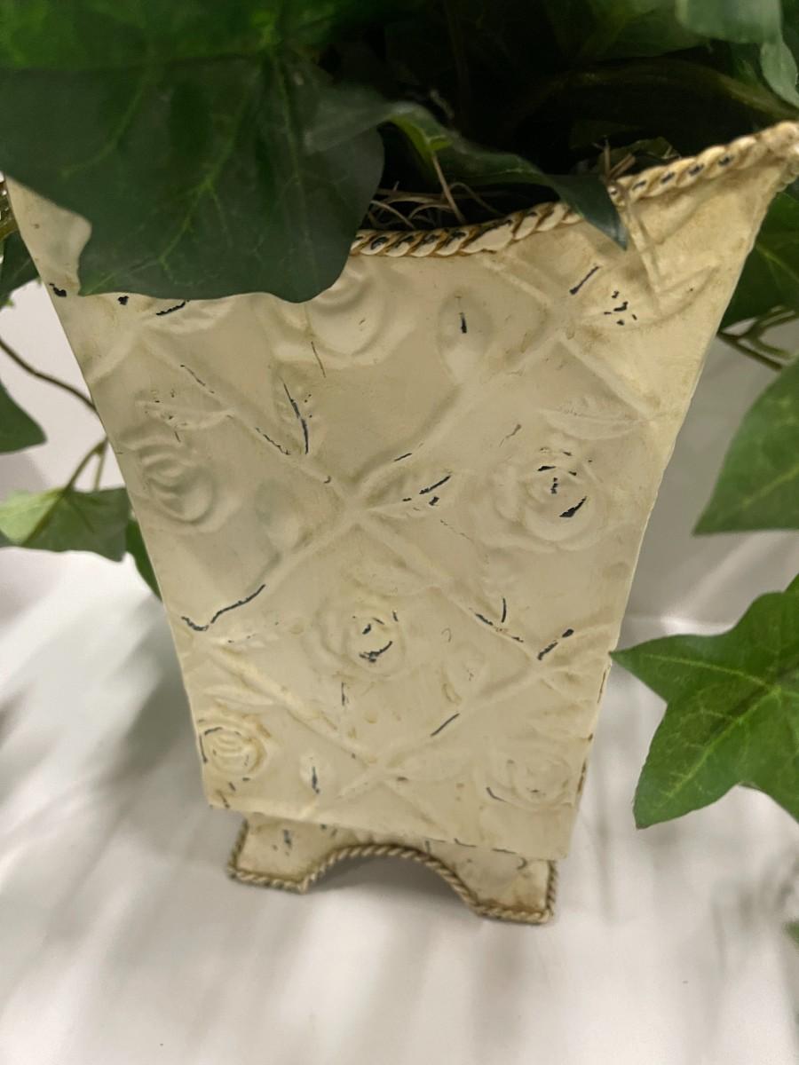 Artifical fern in rustic style antiqued white metal planter. Planter is approx 8" tall.
