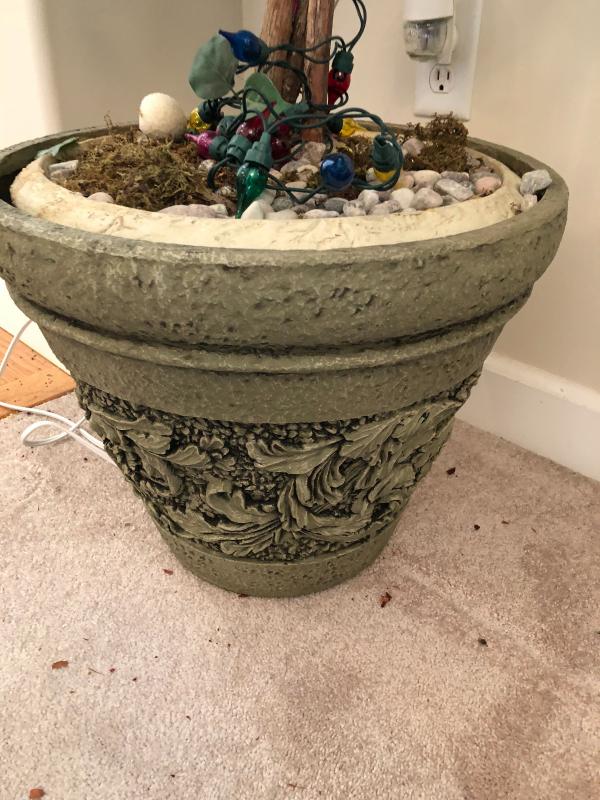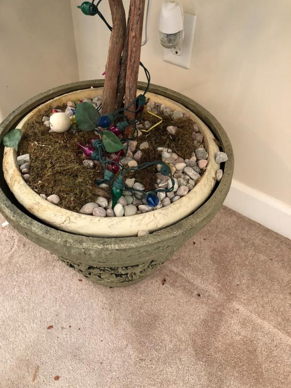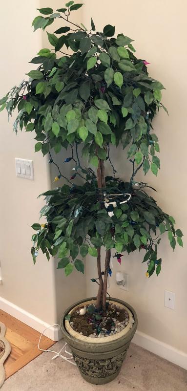 Artificial tree stands 68" tall includes lights and decorative pot.