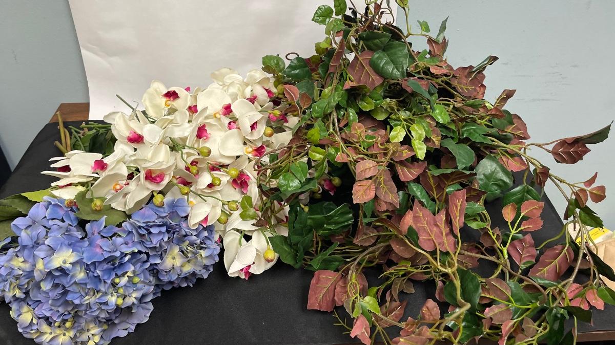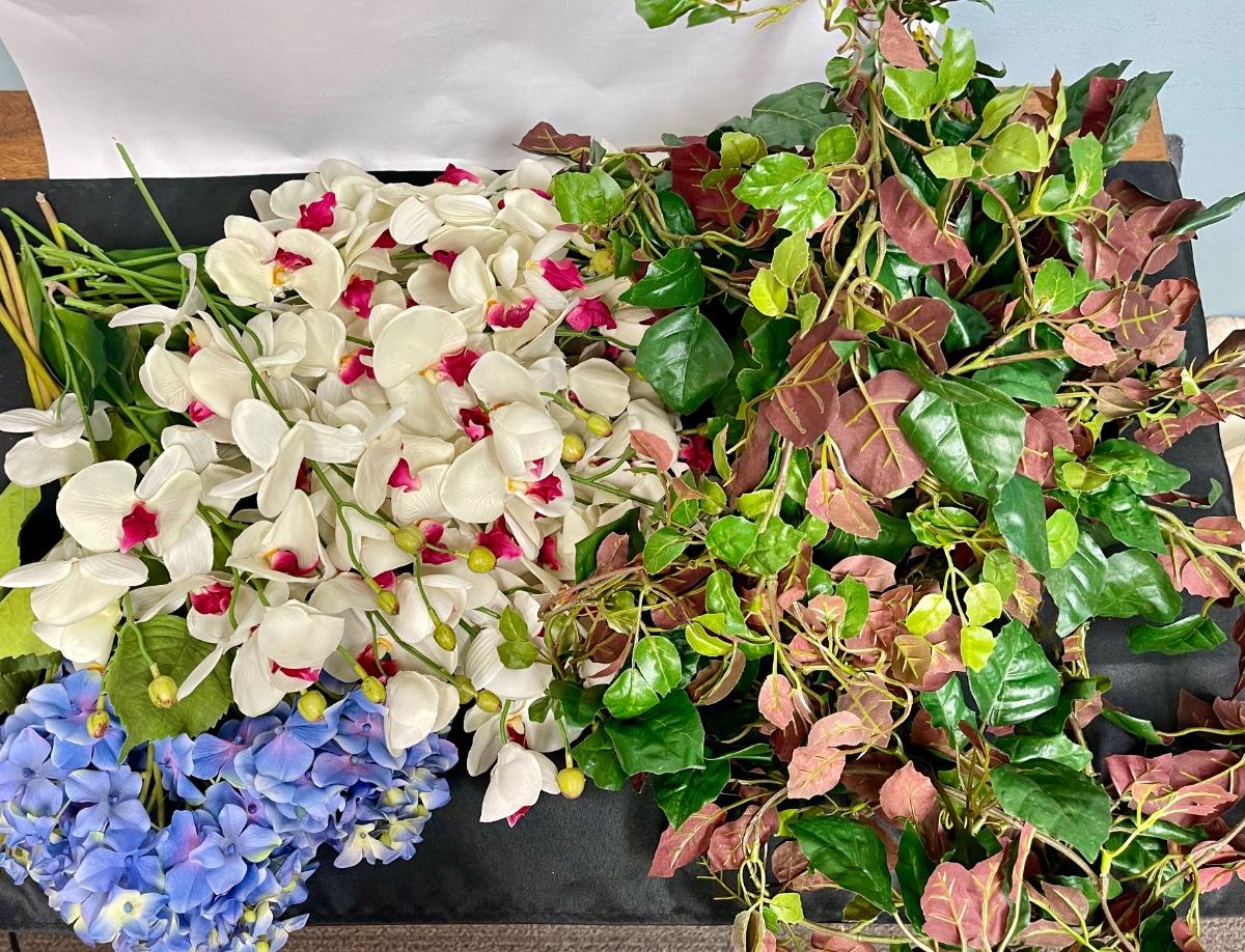 Hydrangea and orchids on stems and greenery in garland form. In good previously owned condition.