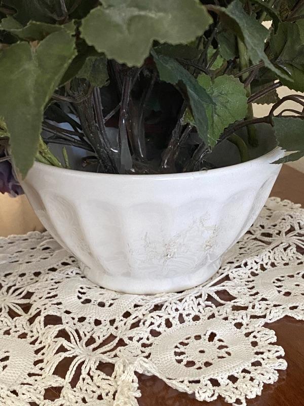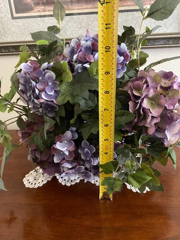 Purple artificial flower centerpiece. Sit in a white ceramic bowl. Some of the flowers are glued in place. About 11"