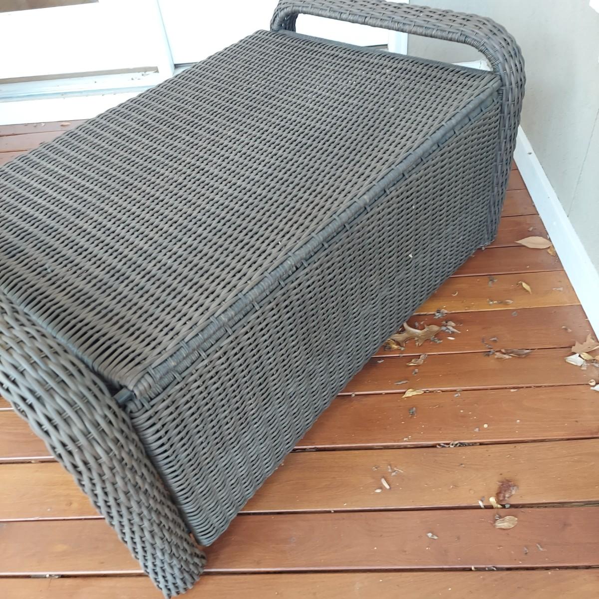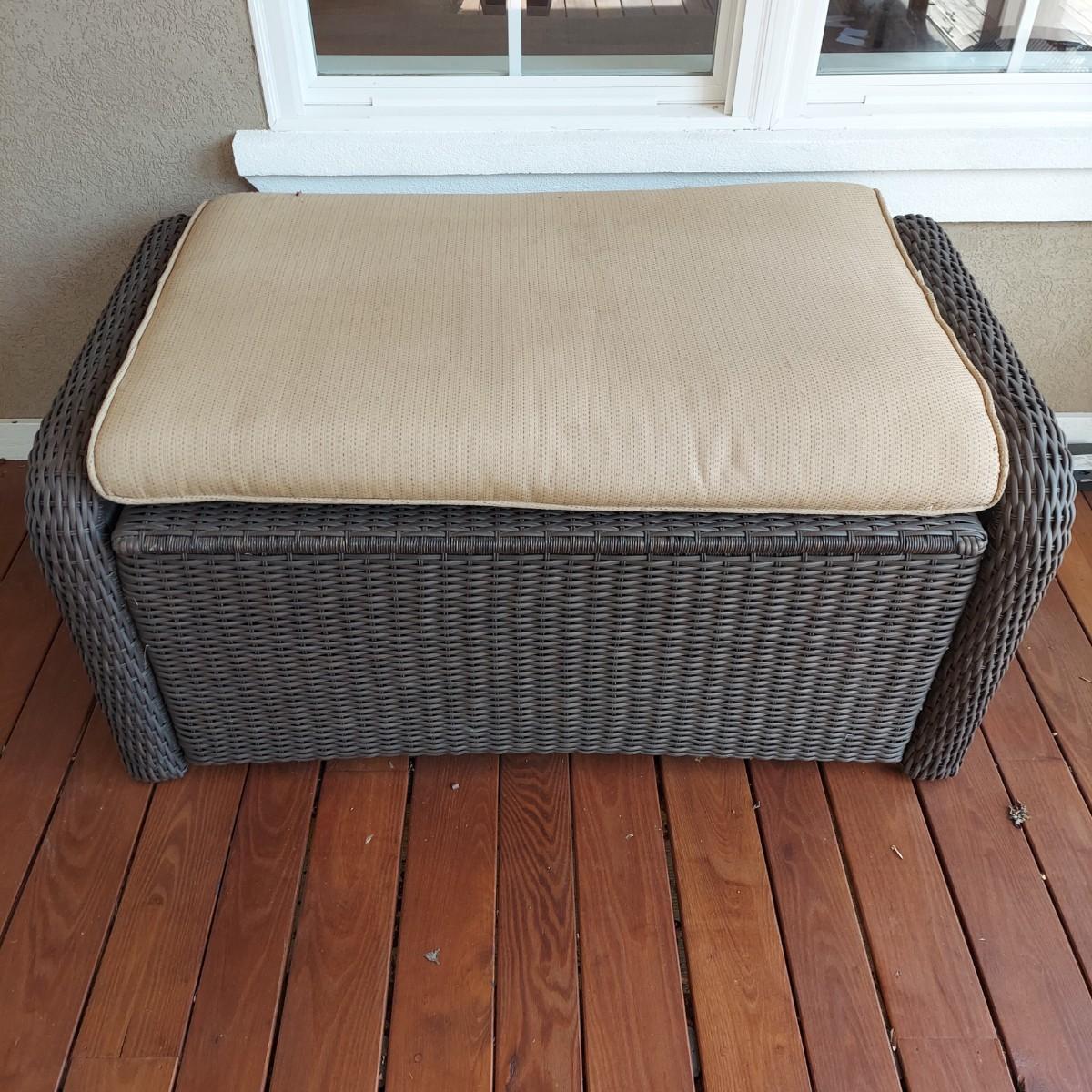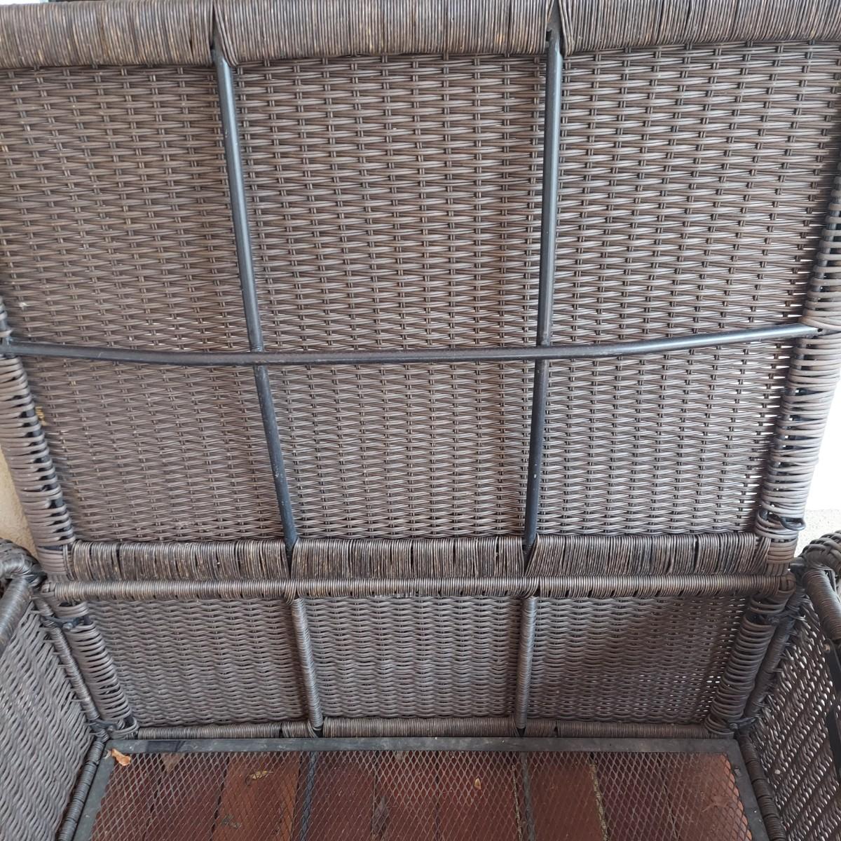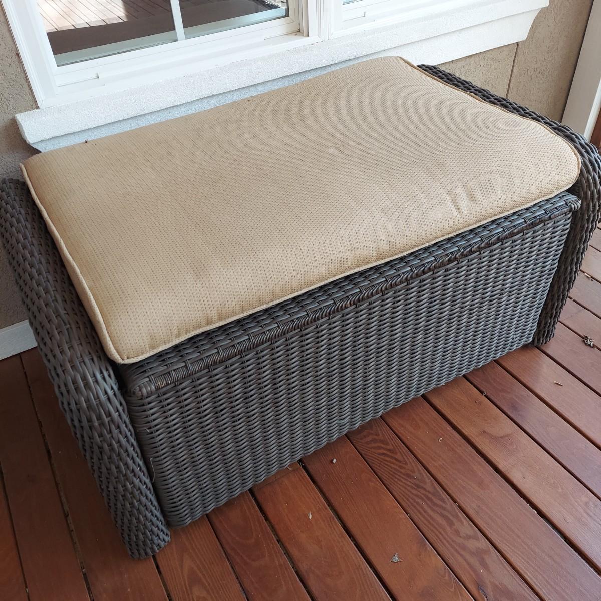 Large faux rattan in a woven wicker style with storage compartment below seat and a removable cushion. Piece measures approximately 48” x 30” x 23"H with a 24"H seat height. Cushion has signs of wear. Please see photos for details. Local Pickup Only. Winning bidder must bring assistance to help move and load this item due to its weight and/or size. This lot is located on a large deck with no stairs down the ground. There are two exits from this level of the home, each with 4 steps down leading to driveway.