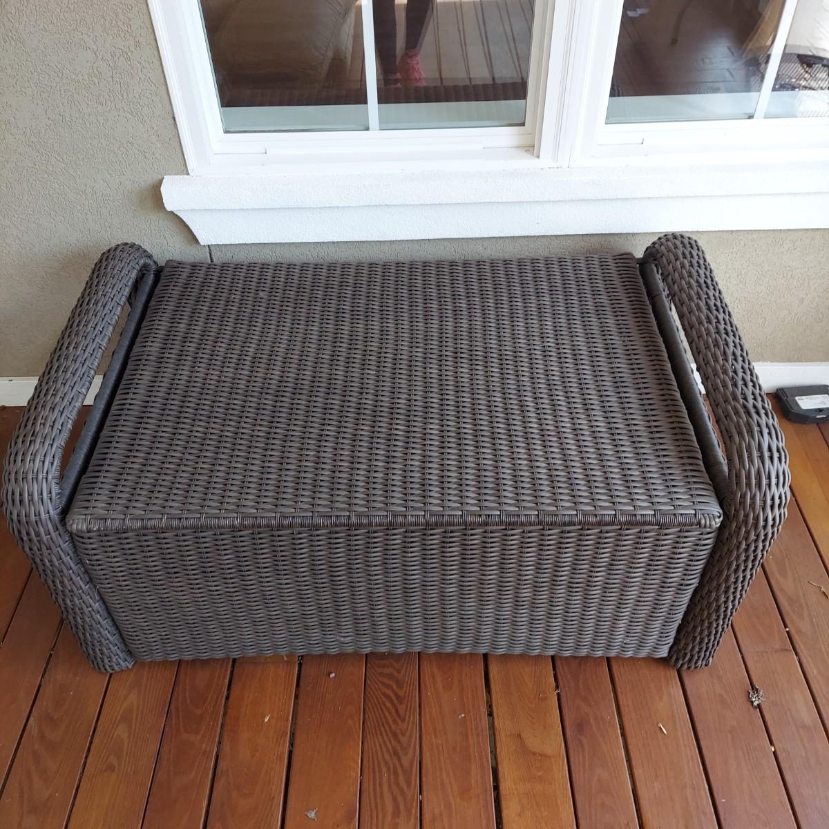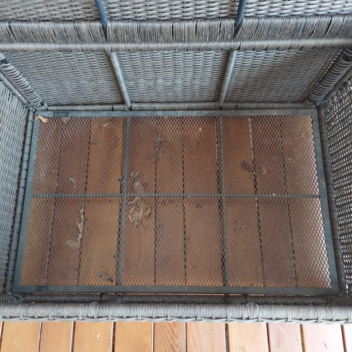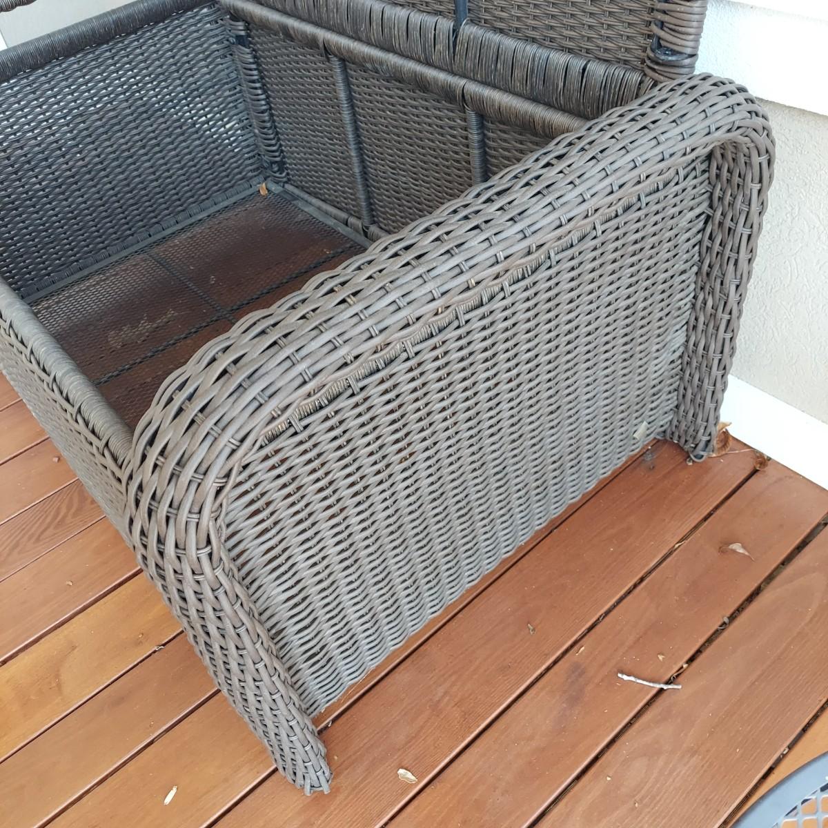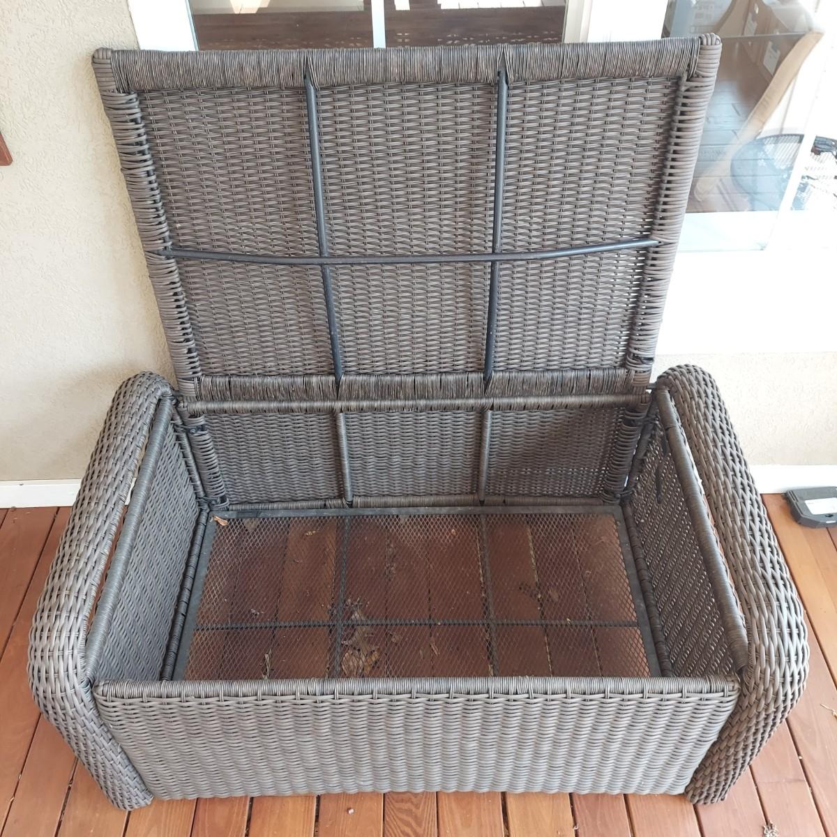 Large faux rattan in a woven wicker style with storage compartment below seat and a removable cushion. Piece measures approximately 48” x 30” x 23"H with a 24"H seat height. Cushion has signs of wear. Please see photos for details. Local Pickup Only. Winning bidder must bring assistance to help move and load this item due to its weight and/or size. This lot is located on a large deck with no stairs down the ground. There are two exits from this level of the home, each with 4 steps down leading to driveway.