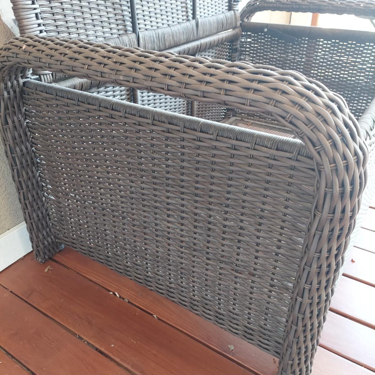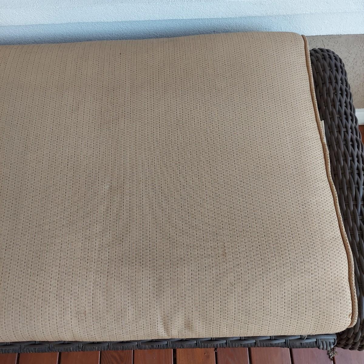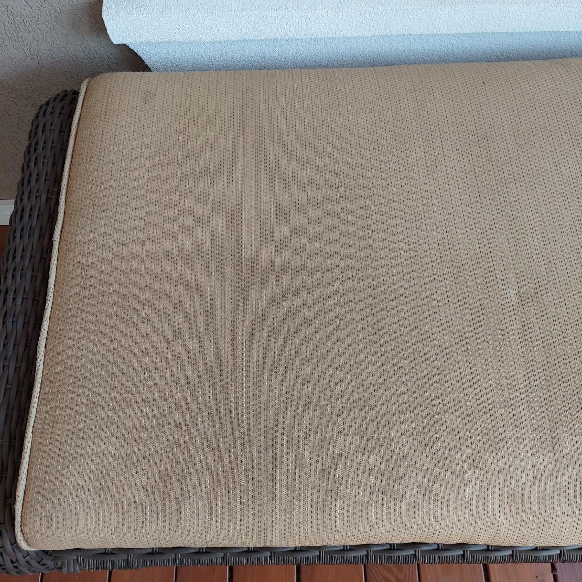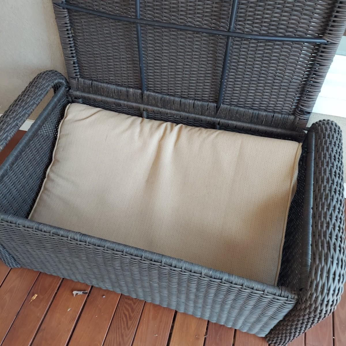 Large faux rattan in a woven wicker style with storage compartment below seat and a removable cushion. Piece measures approximately 48” x 30” x 23"H with a 24"H seat height. Cushion has signs of wear. Please see photos for details. Local Pickup Only. Winning bidder must bring assistance to help move and load this item due to its weight and/or size. This lot is located on a large deck with no stairs down the ground. There are two exits from this level of the home, each with 4 steps down leading to driveway.
