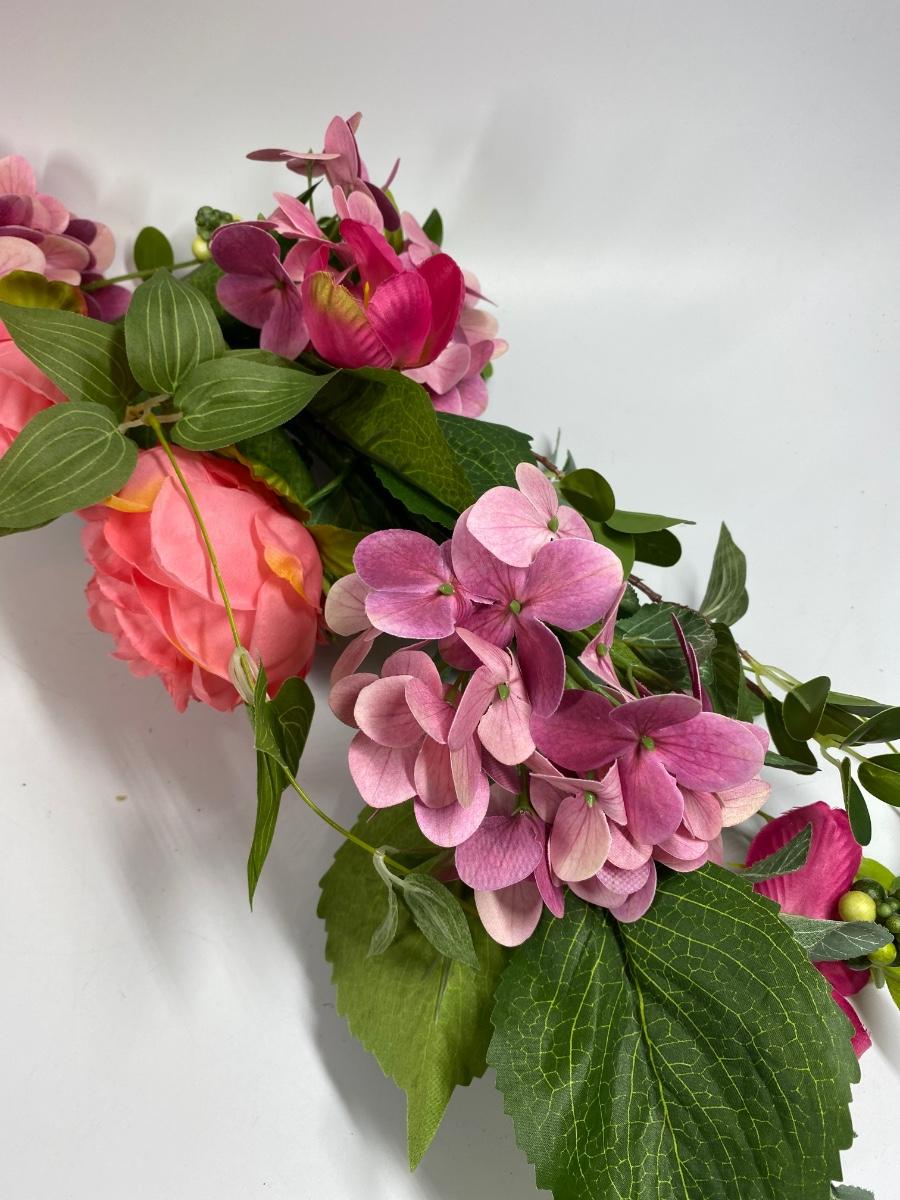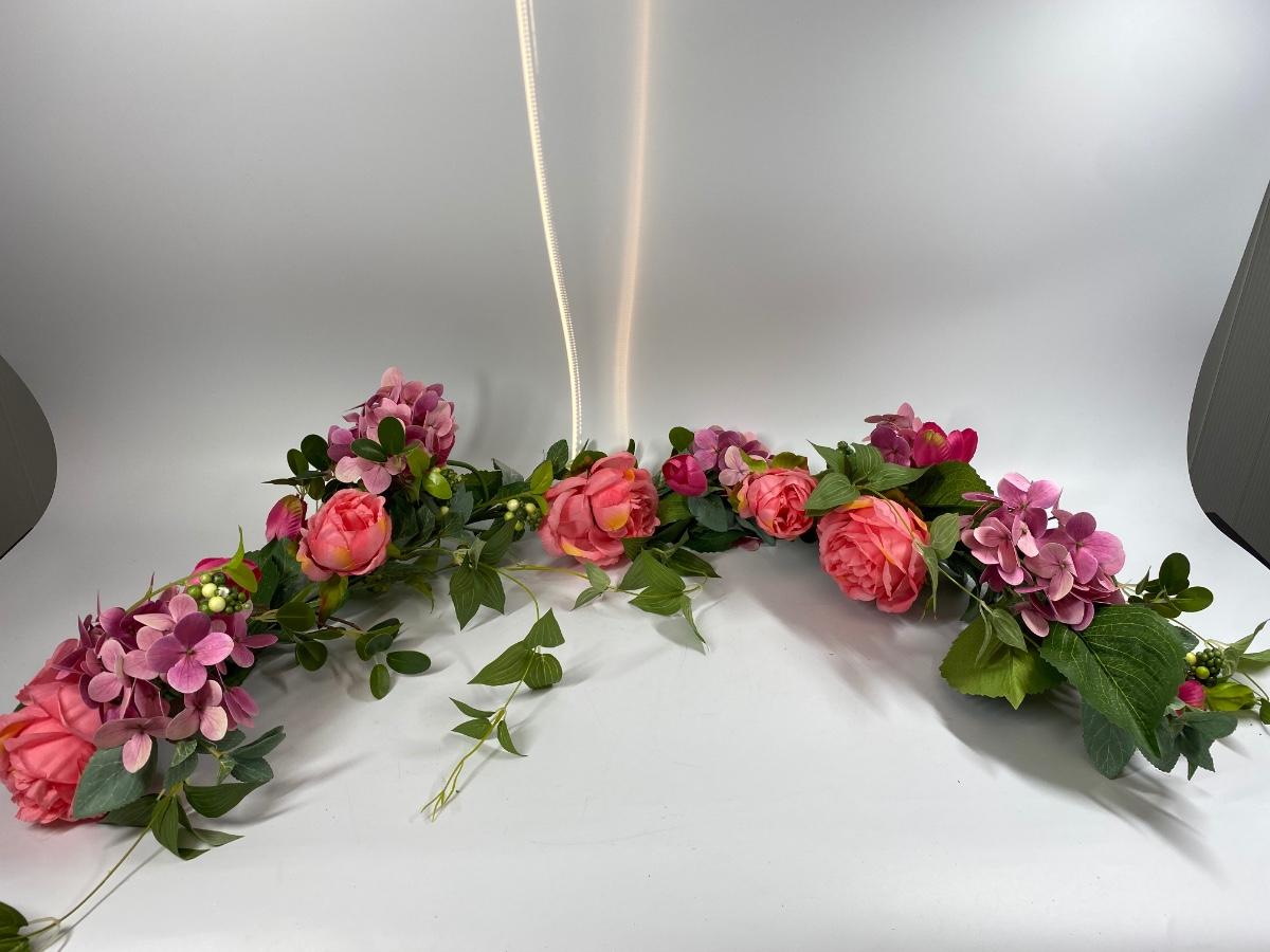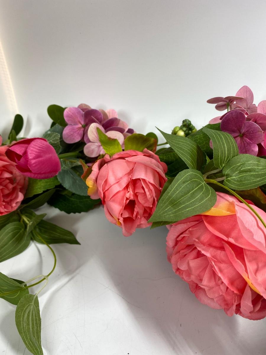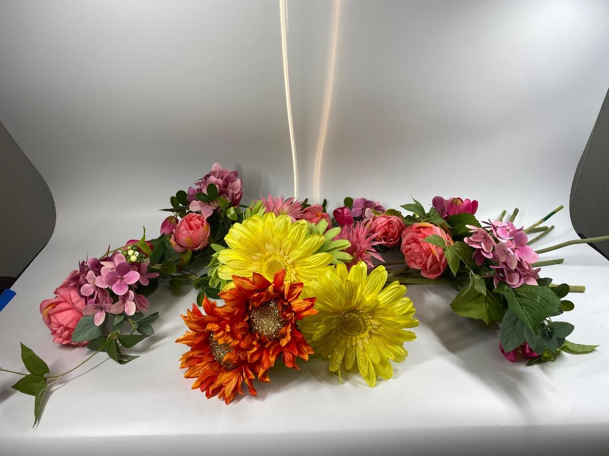 Lot of artificial springtime flowers. Beautiful pink colored floral garland and some long-stemmed daisy like flowers. Good condition, great for projects or decor.