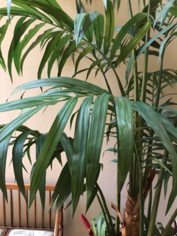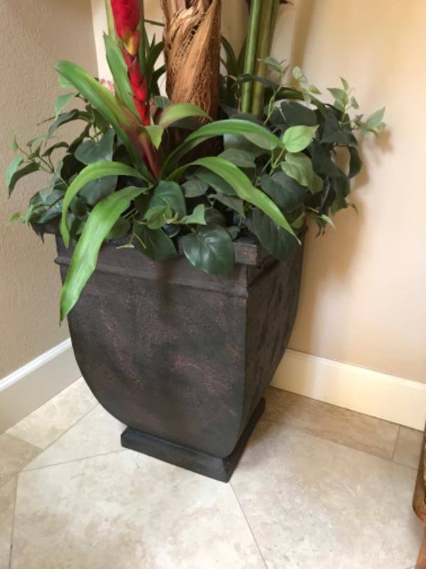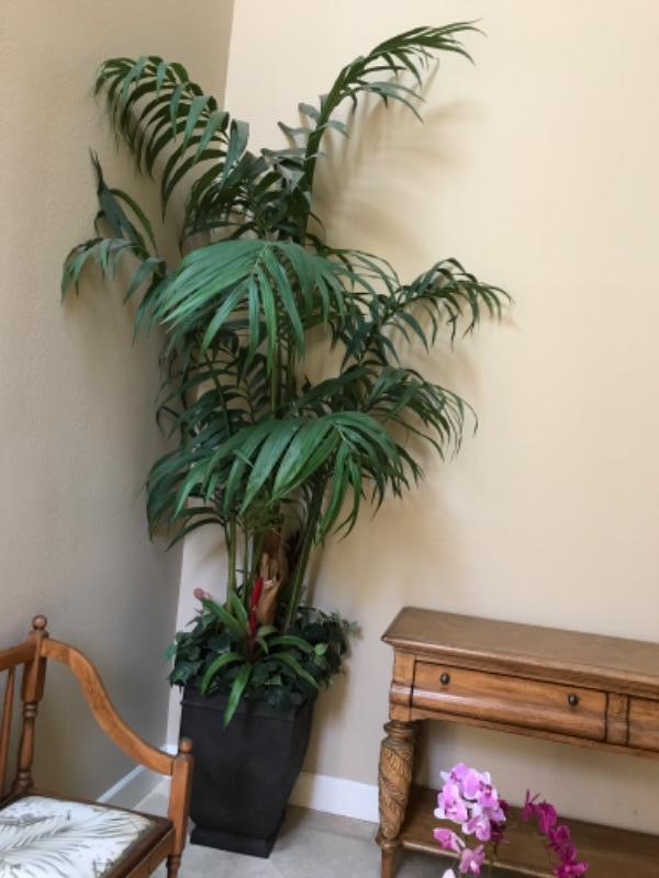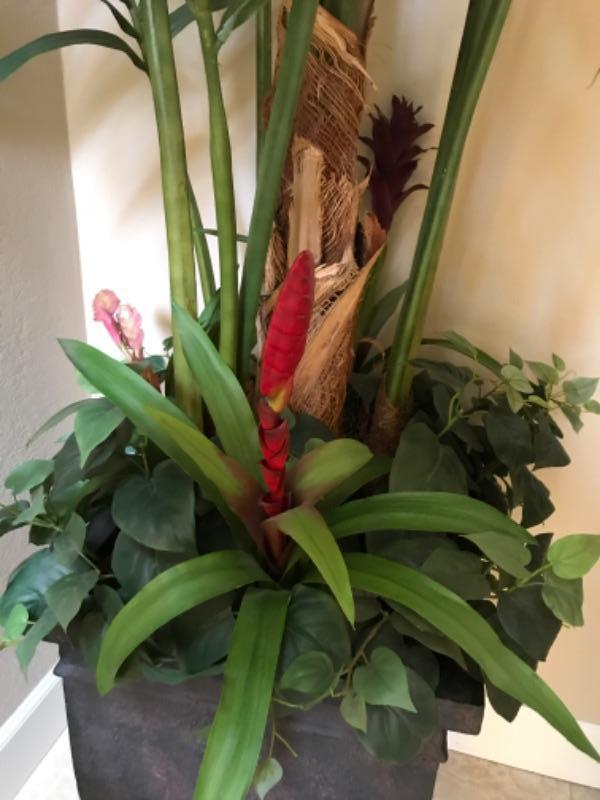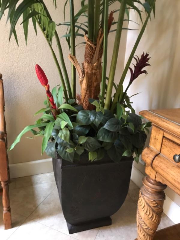 Artificial palm tree with tropical plants in a black urn-style planter pot.