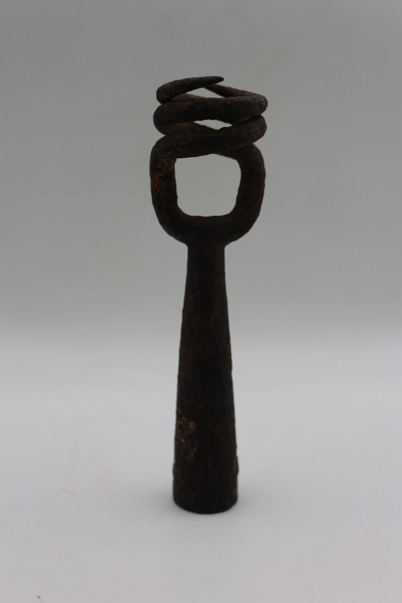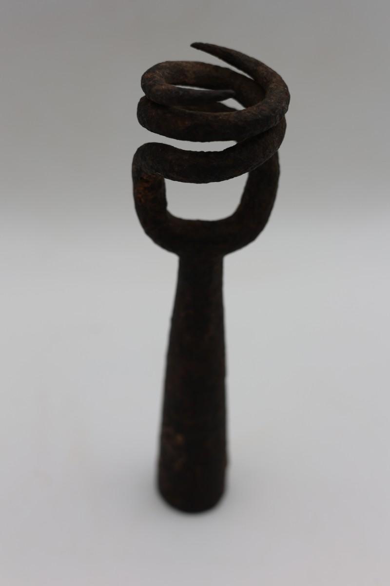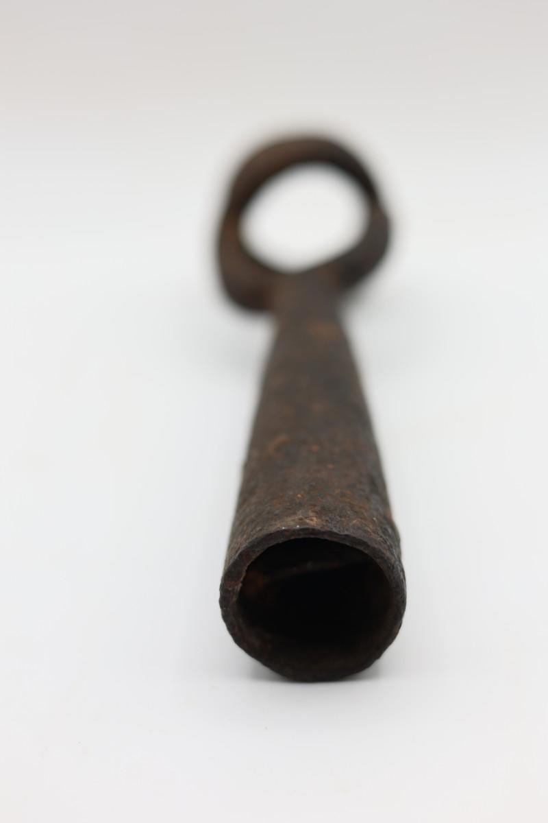 Made of iron and once was mounted to a wood shaft to remove debris from a cannon barrel.