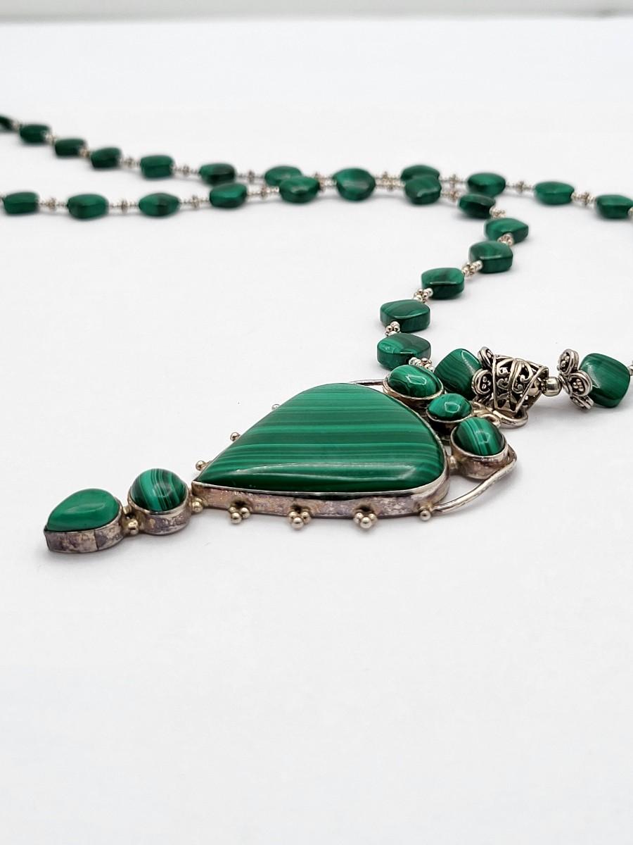 Hand crafted necklace with 28" Malachite bead and 925 silver. Even the clasp is handmade. Pendant drop is 3" long x 1.5" wide. Total weight is 60.4 grams