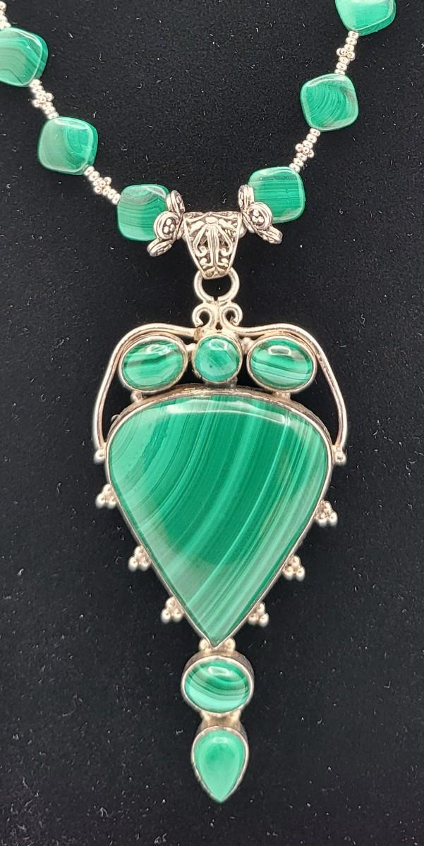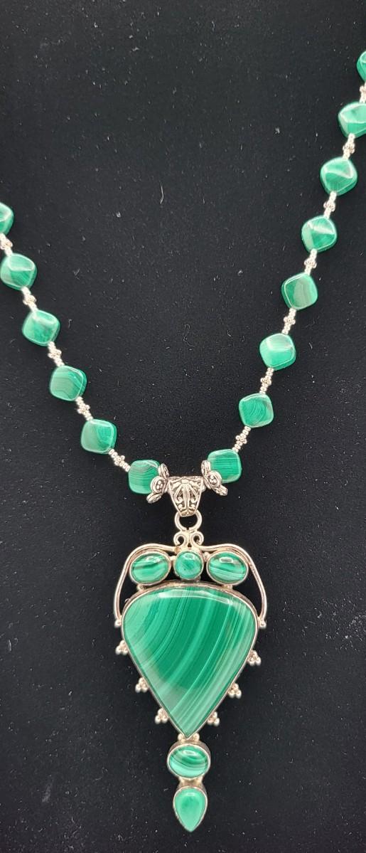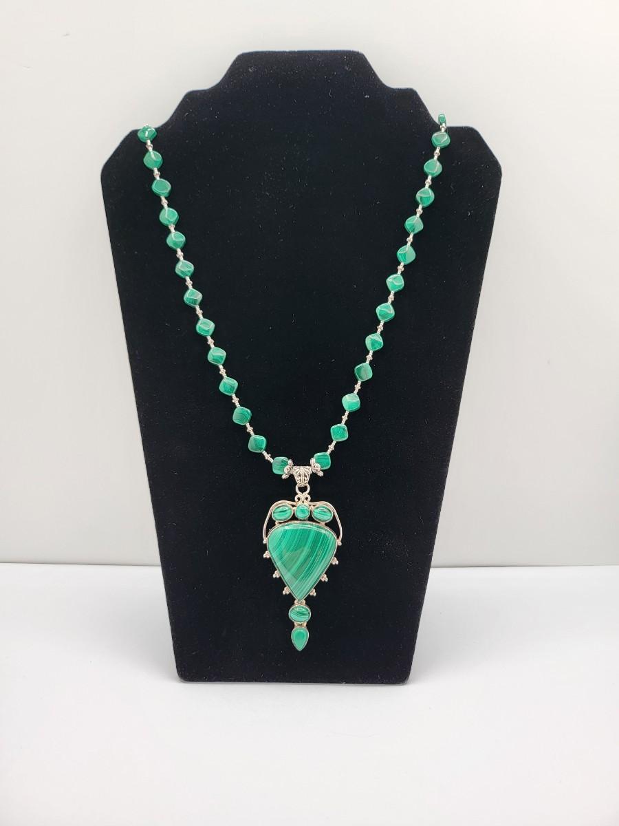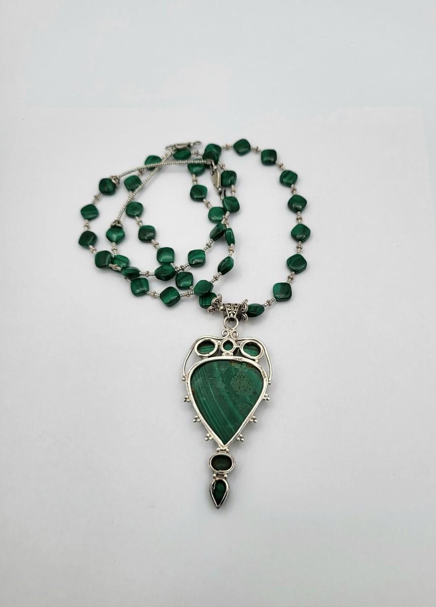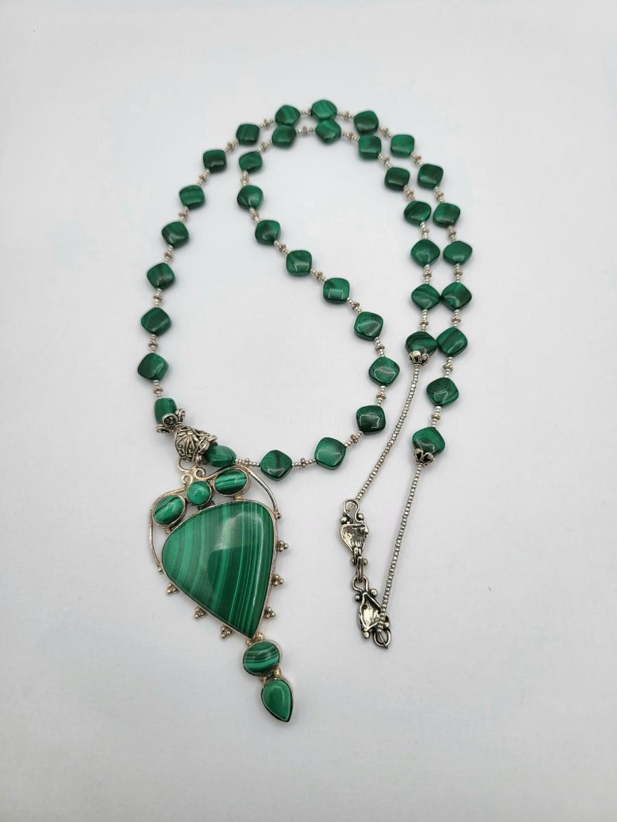 Hand crafted necklace with 28" Malachite bead and 925 silver. Even the clasp is handmade. Pendant drop is 3" long x 1.5" wide. Total weight is 60.4 grams