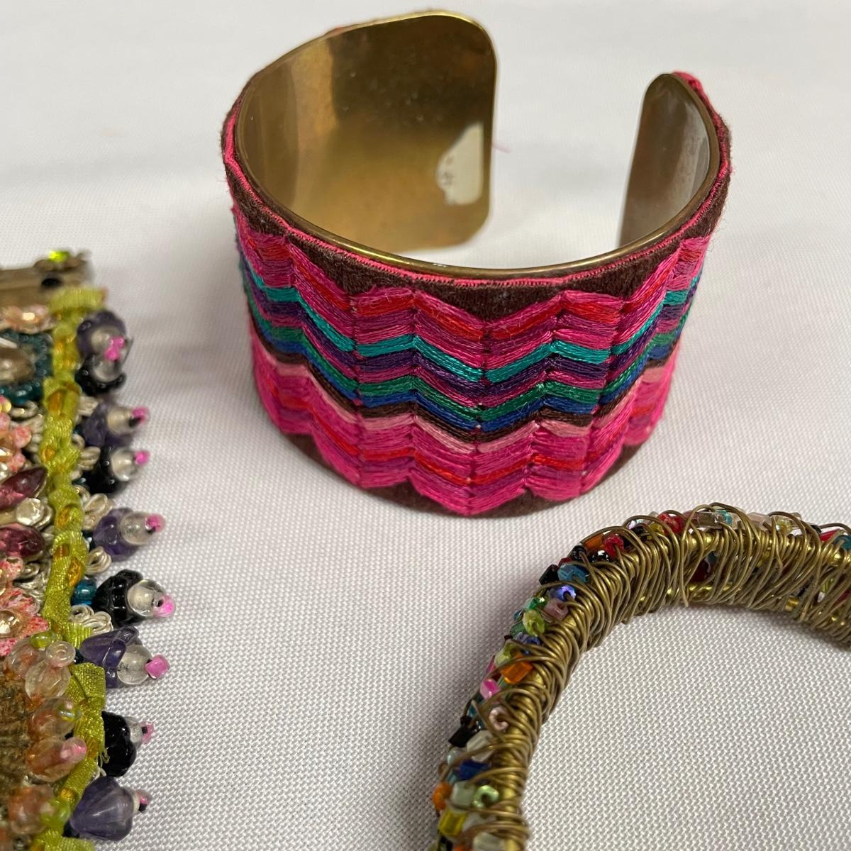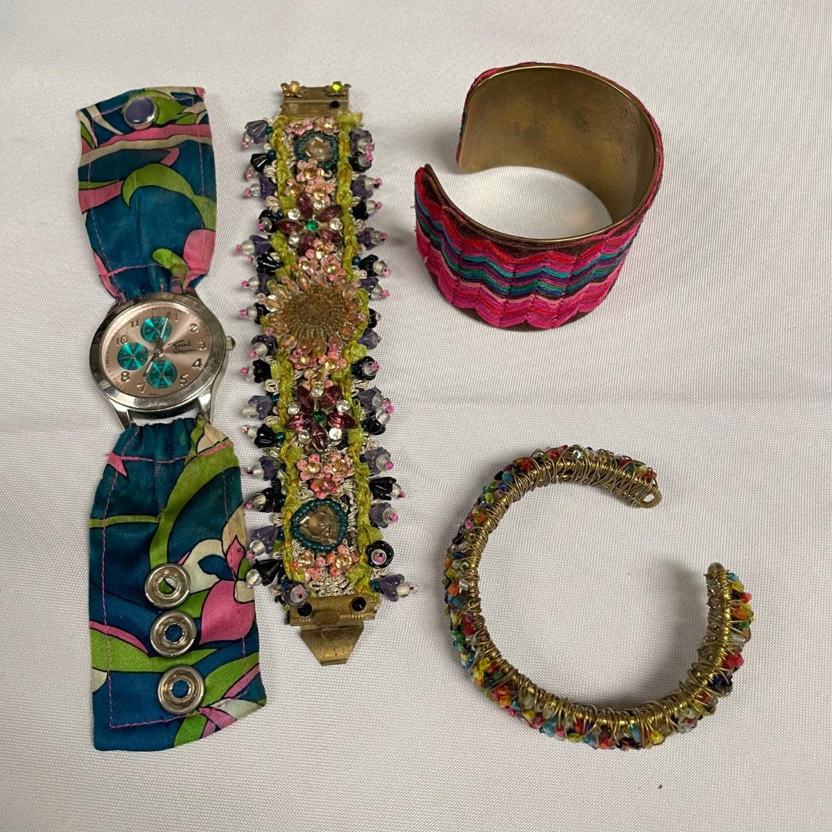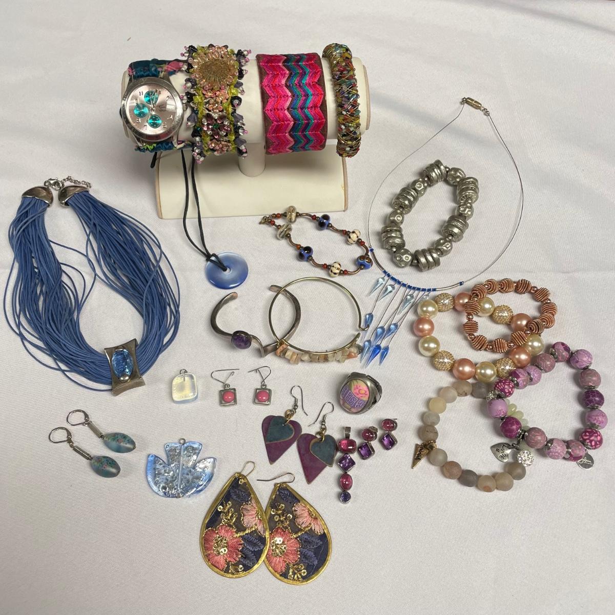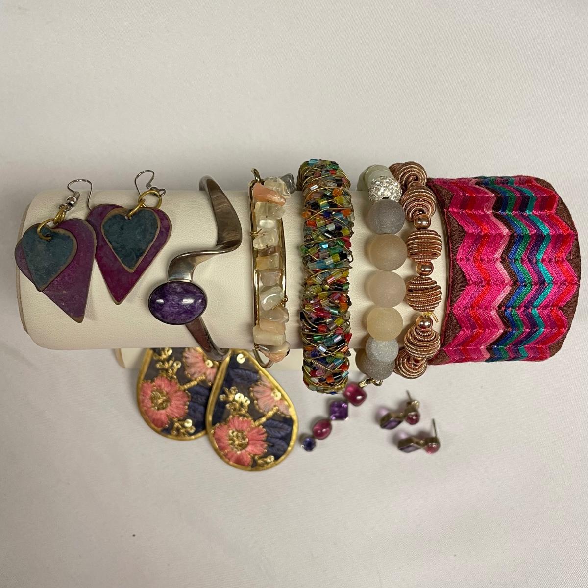 A bold colorful lot with a variety of statement pieces. Lot includes a sterling pendant and earring set, 11 bracelets, including a beautiful purple stoned sterling cuff and another colorful needle-work piece on a brass colored metal. Other items include a thick choker with sterling accents, a Rachel Wassman watch (watch is not currently working), a large teardrop pair of earrings which appears to have an embroidered design and much more. See images for lot inventory. One sterling earring doesn’t include its back. The ring is elastic and about a size 7 at its smallest. All sales are final. No returns or refunds. Please bid accordingly. Shipping available.