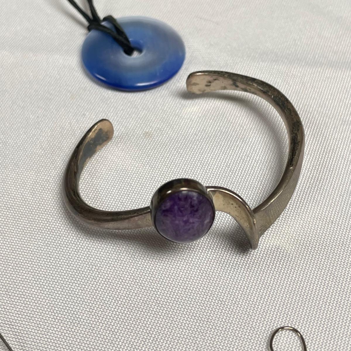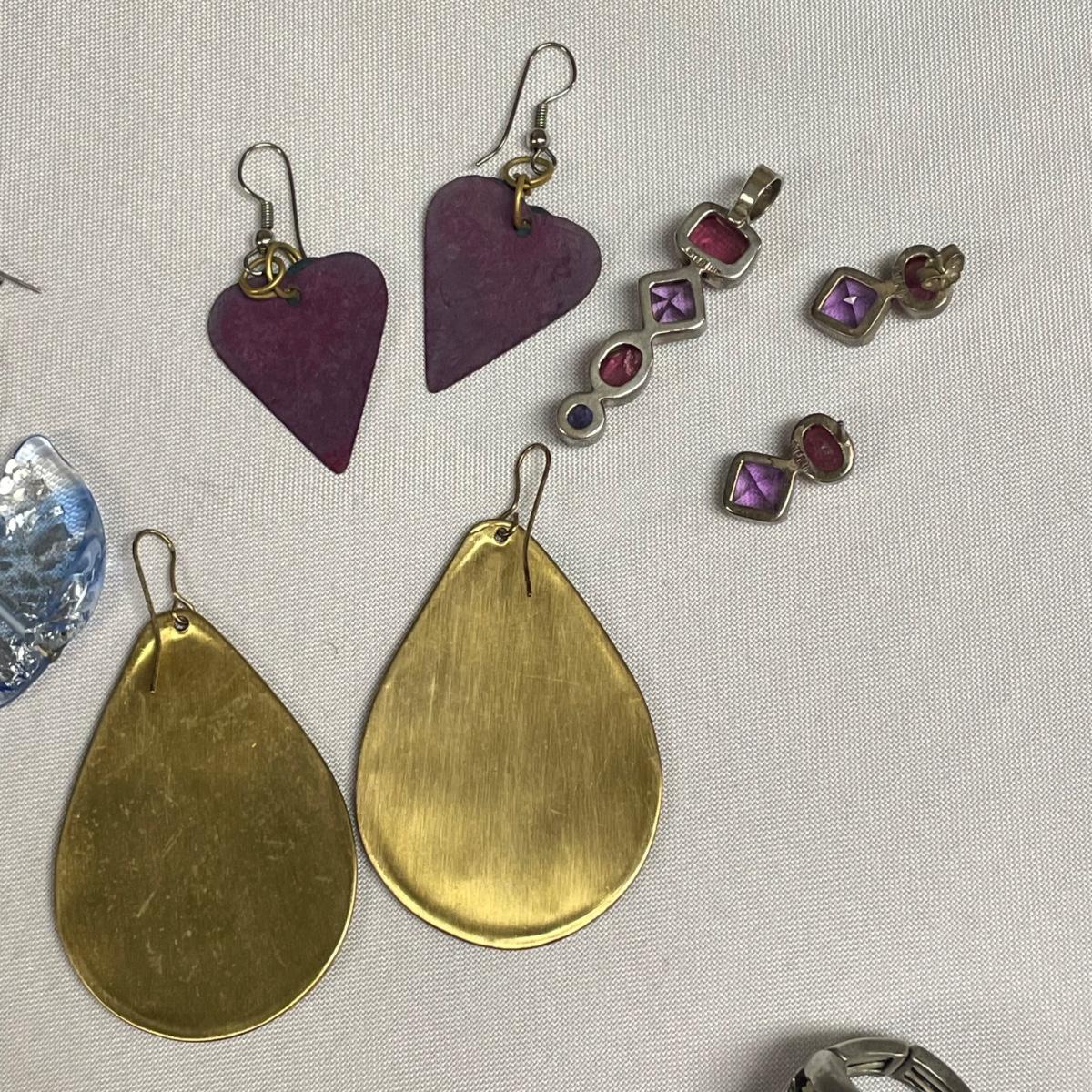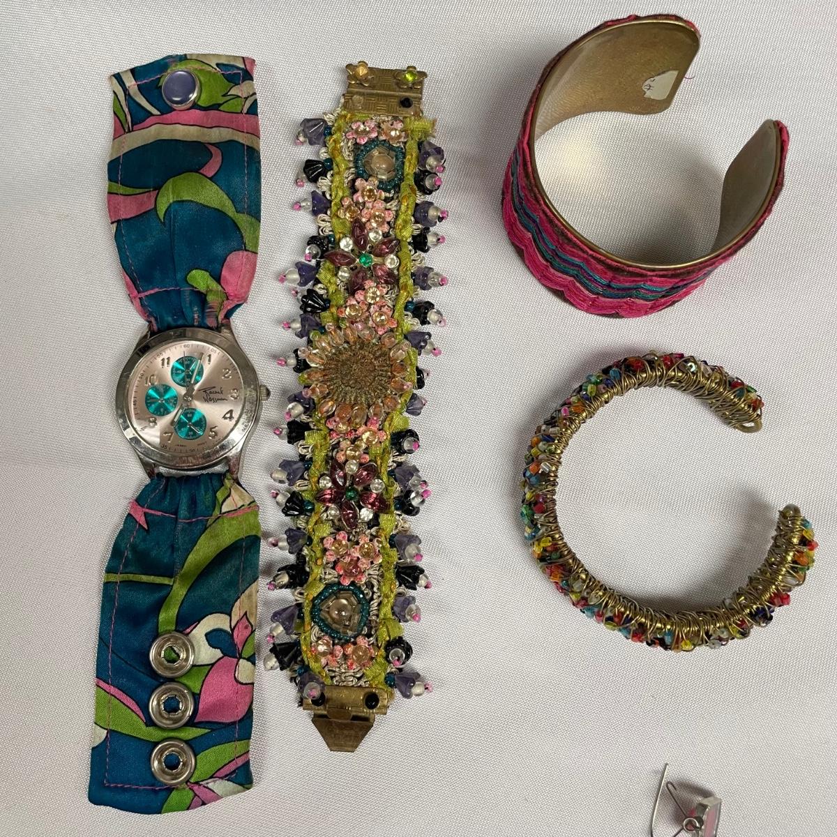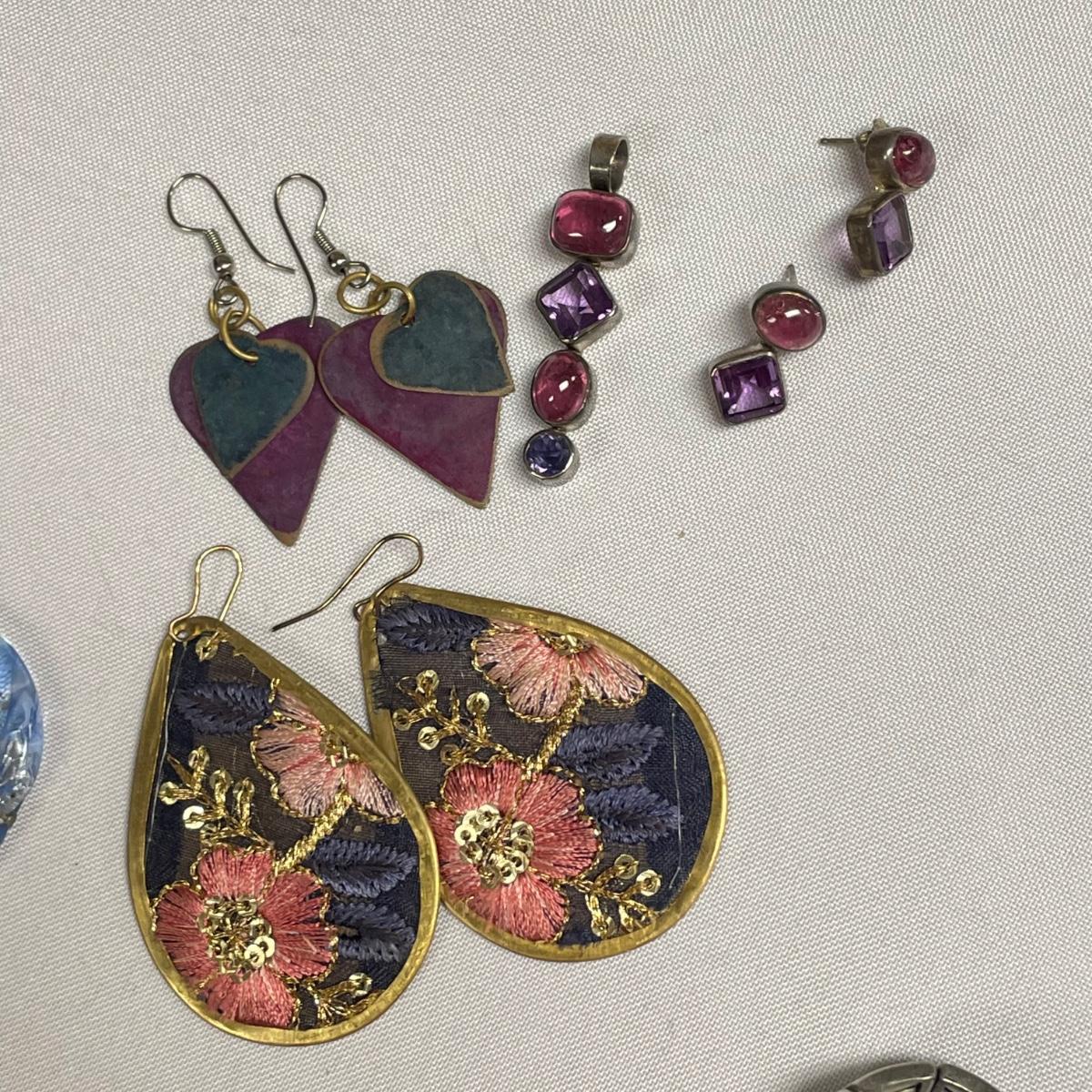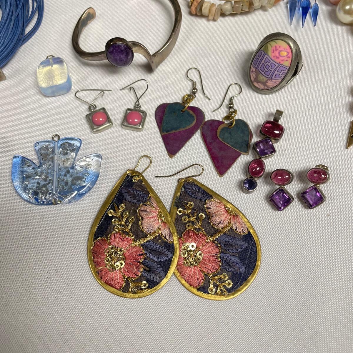 A bold colorful lot with a variety of statement pieces. Lot includes a sterling pendant and earring set, 11 bracelets, including a beautiful purple stoned sterling cuff and another colorful needle-work piece on a brass colored metal. Other items include a thick choker with sterling accents, a Rachel Wassman watch (watch is not currently working), a large teardrop pair of earrings which appears to have an embroidered design and much more. See images for lot inventory. One sterling earring doesn’t include its back. The ring is elastic and about a size 7 at its smallest. All sales are final. No returns or refunds. Please bid accordingly. Shipping available.