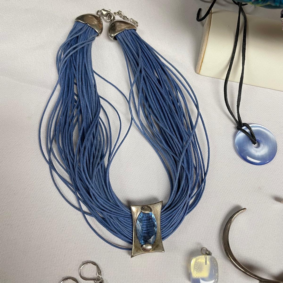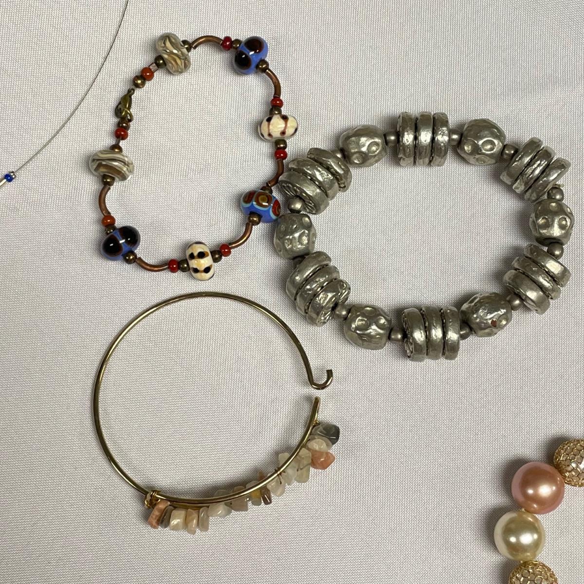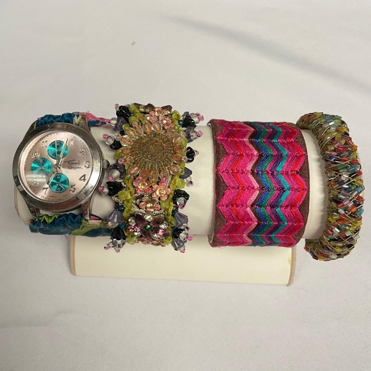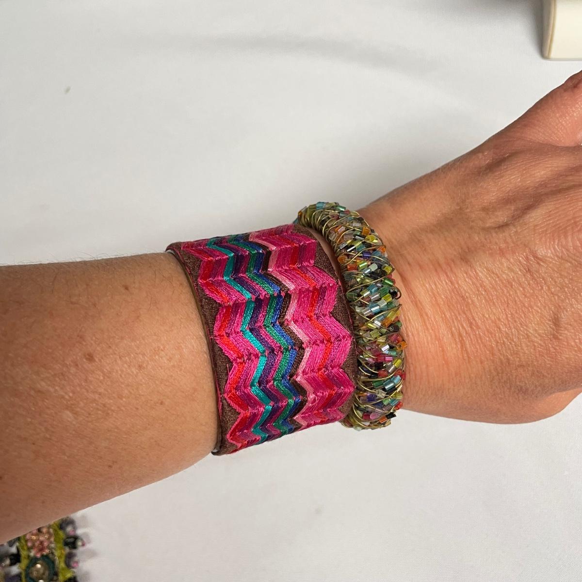A bold colorful lot with a variety of statement pieces. Lot includes a sterling pendant and earring set, 11 bracelets, including a beautiful purple stoned sterling cuff and another colorful needle-work piece on a brass colored metal. Other items include a thick choker with sterling accents, a Rachel Wassman watch (watch is not currently working), a large teardrop pair of earrings which appears to have an embroidered design and much more. See images for lot inventory. One sterling earring doesn’t include its back. The ring is elastic and about a size 7 at its smallest. All sales are final. No returns or refunds. Please bid accordingly. Shipping available.