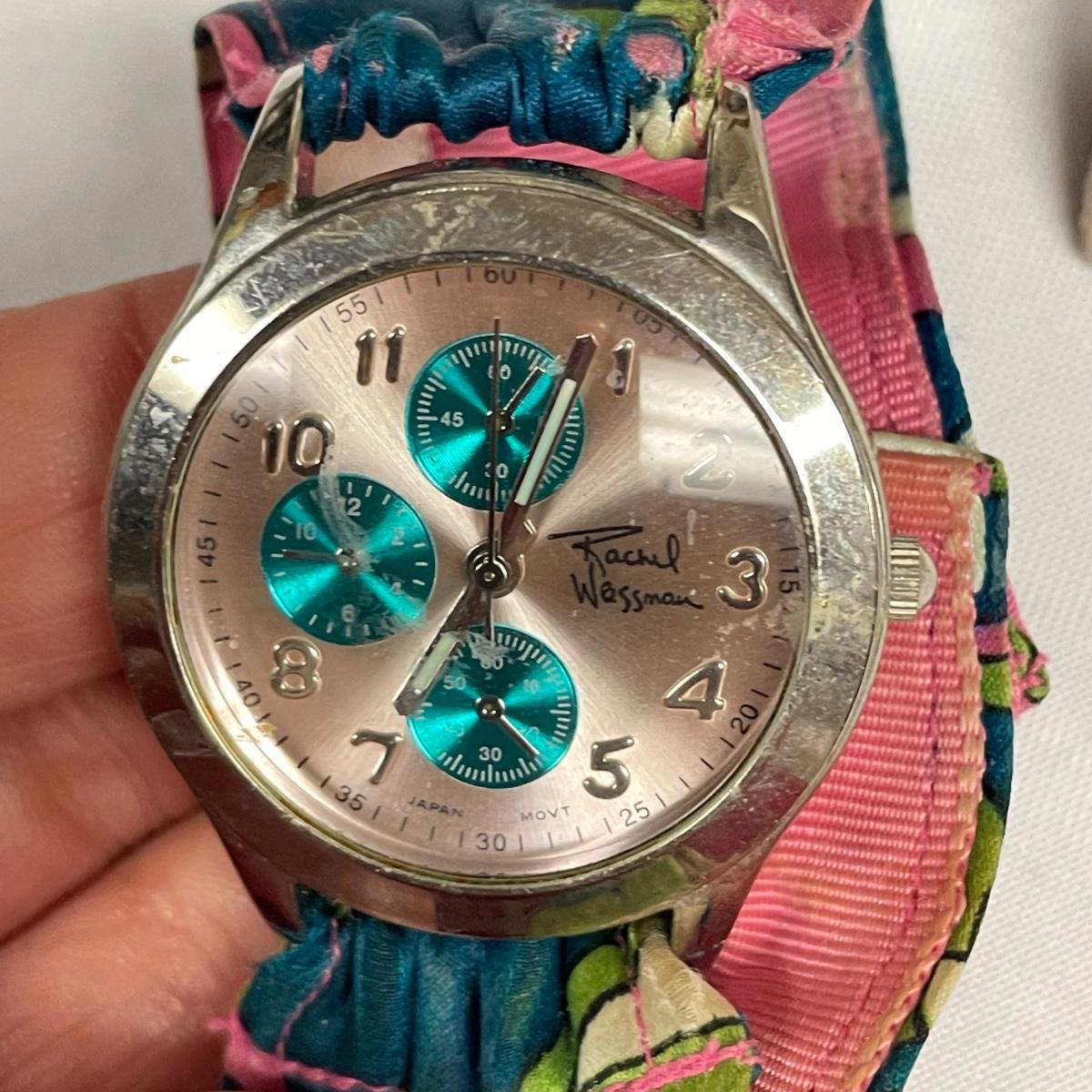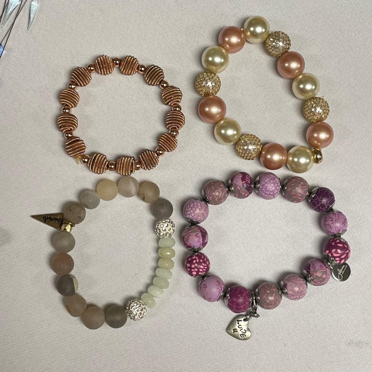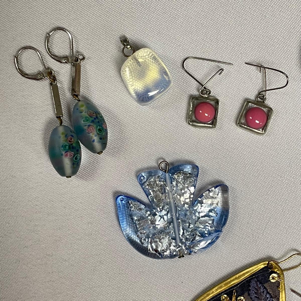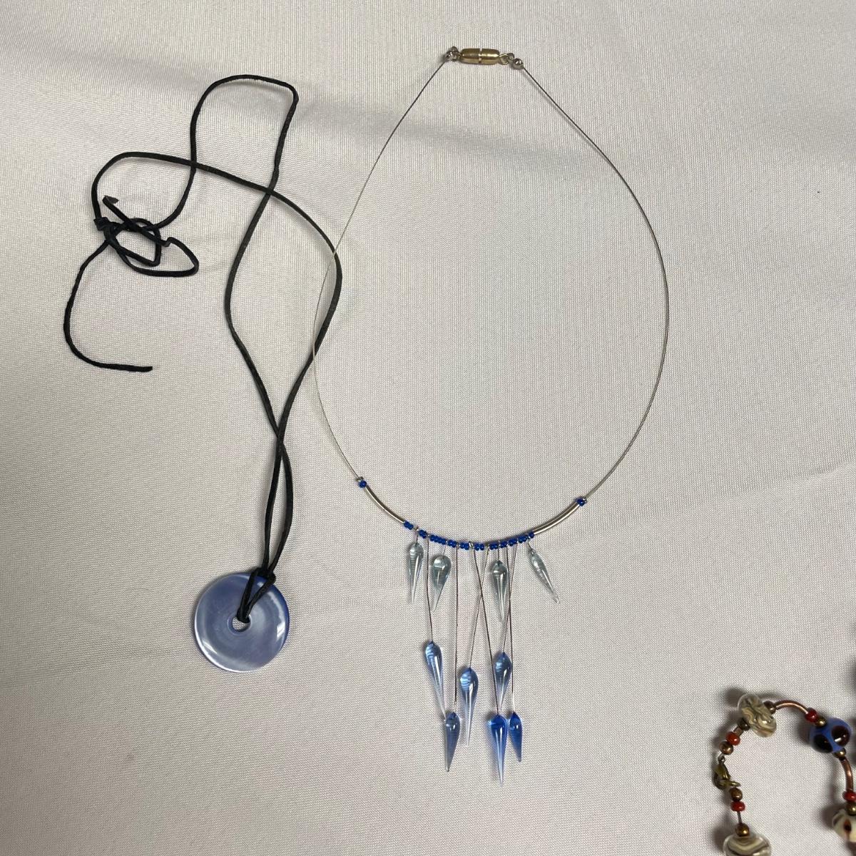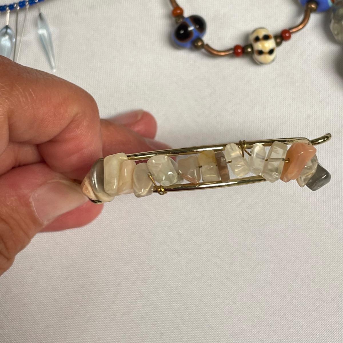 A bold colorful lot with a variety of statement pieces. Lot includes a sterling pendant and earring set, 11 bracelets, including a beautiful purple stoned sterling cuff and another colorful needle-work piece on a brass colored metal. Other items include a thick choker with sterling accents, a Rachel Wassman watch (watch is not currently working), a large teardrop pair of earrings which appears to have an embroidered design and much more. See images for lot inventory. One sterling earring doesn’t include its back. The ring is elastic and about a size 7 at its smallest. All sales are final. No returns or refunds. Please bid accordingly. Shipping available.