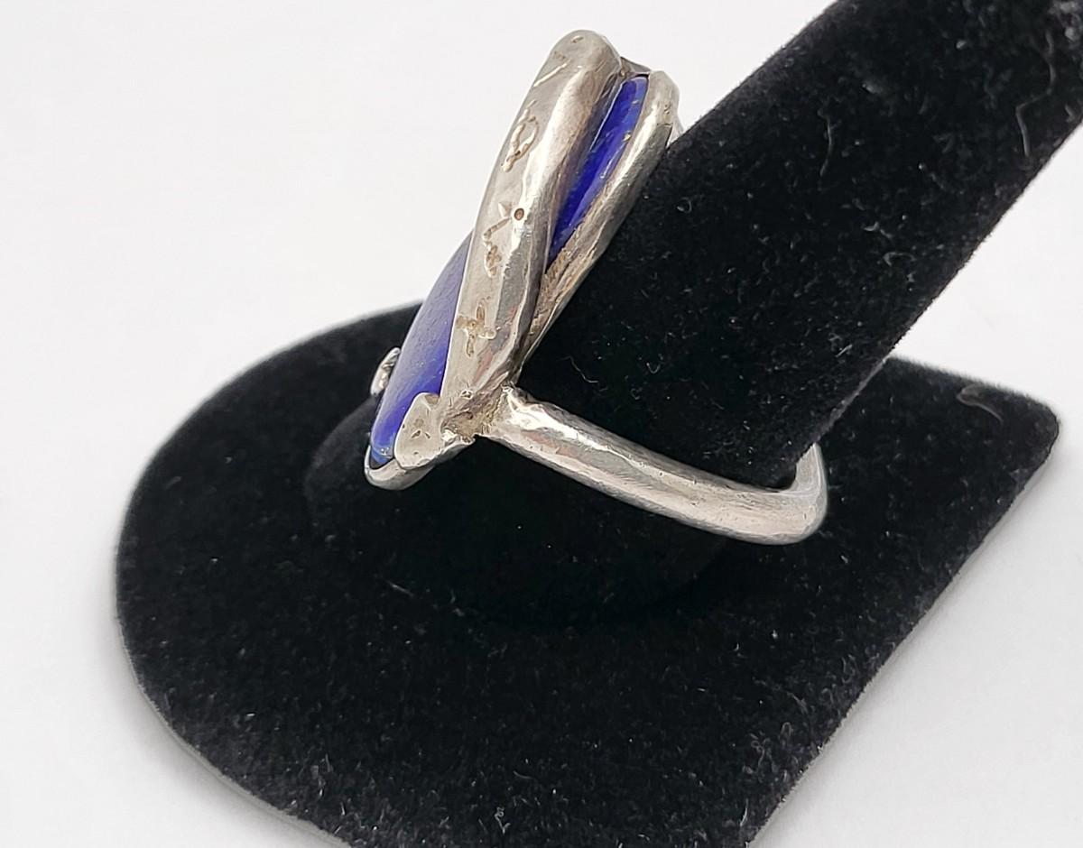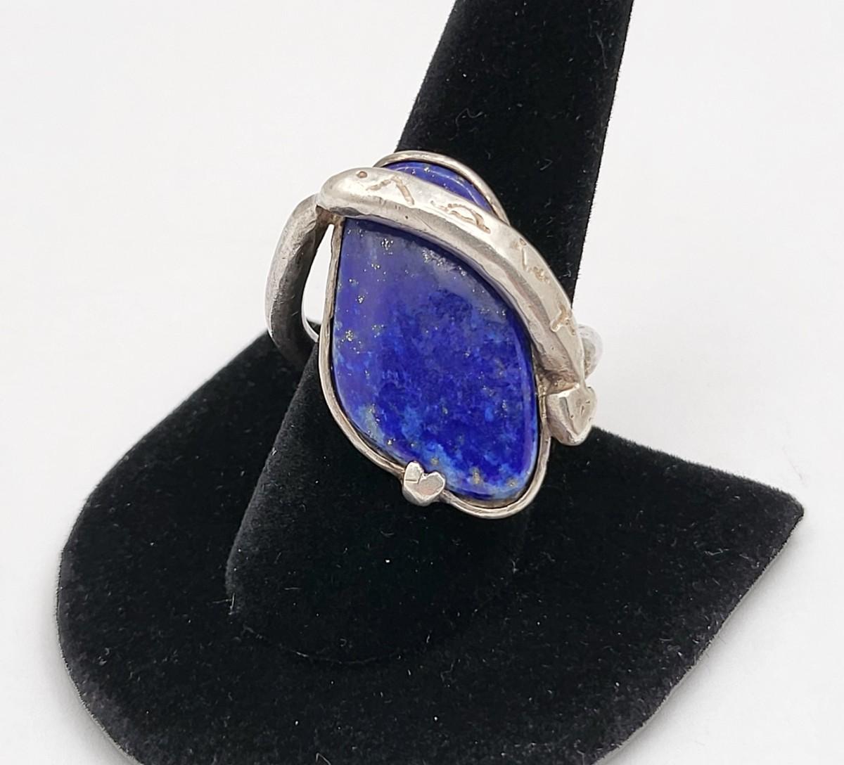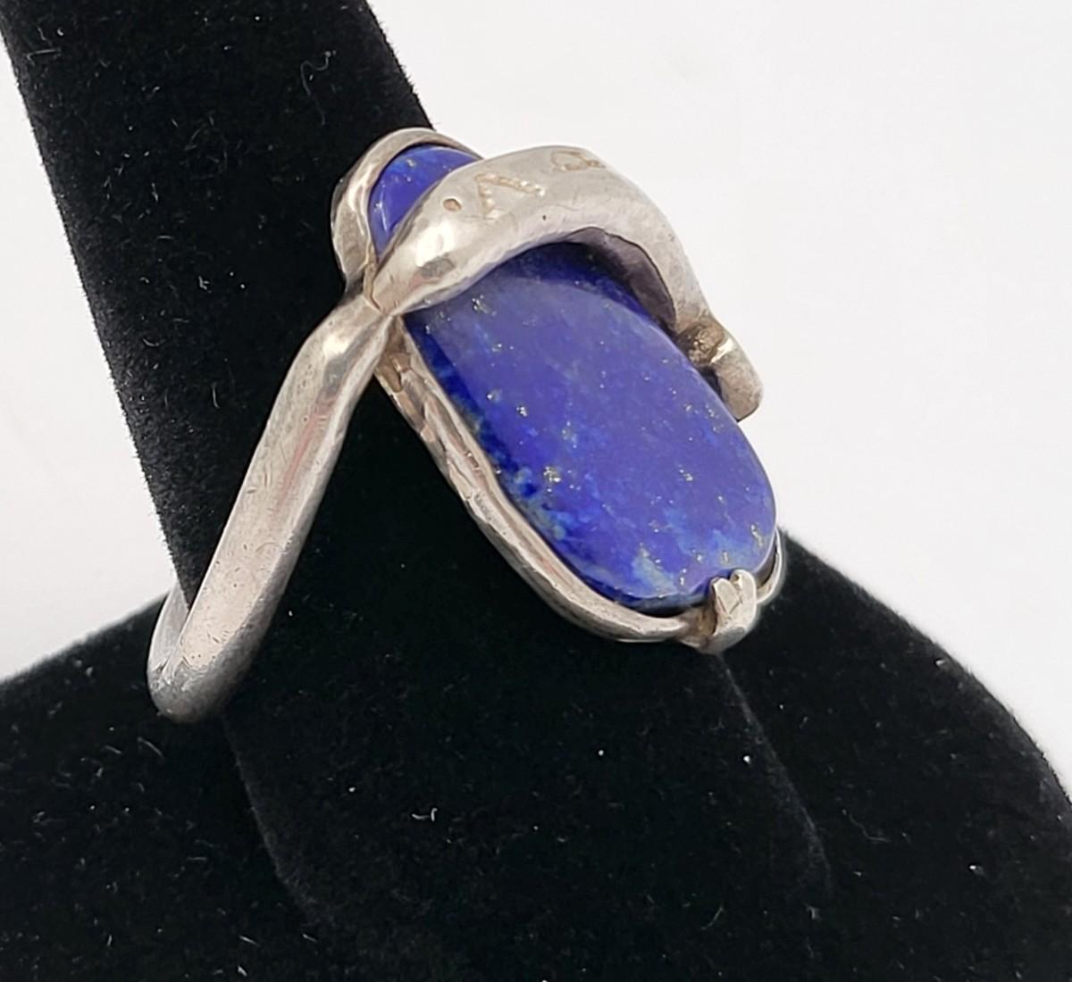 Vintage hand-crafted ring. Cool & unusual...OOAK. Etched asp/snake and blue Lapis Lazuli stone. Face of the rinf is 1.25" x .75" and is a size 12. Stamped 925 and artist etched initials. Weighs 13.9 grams