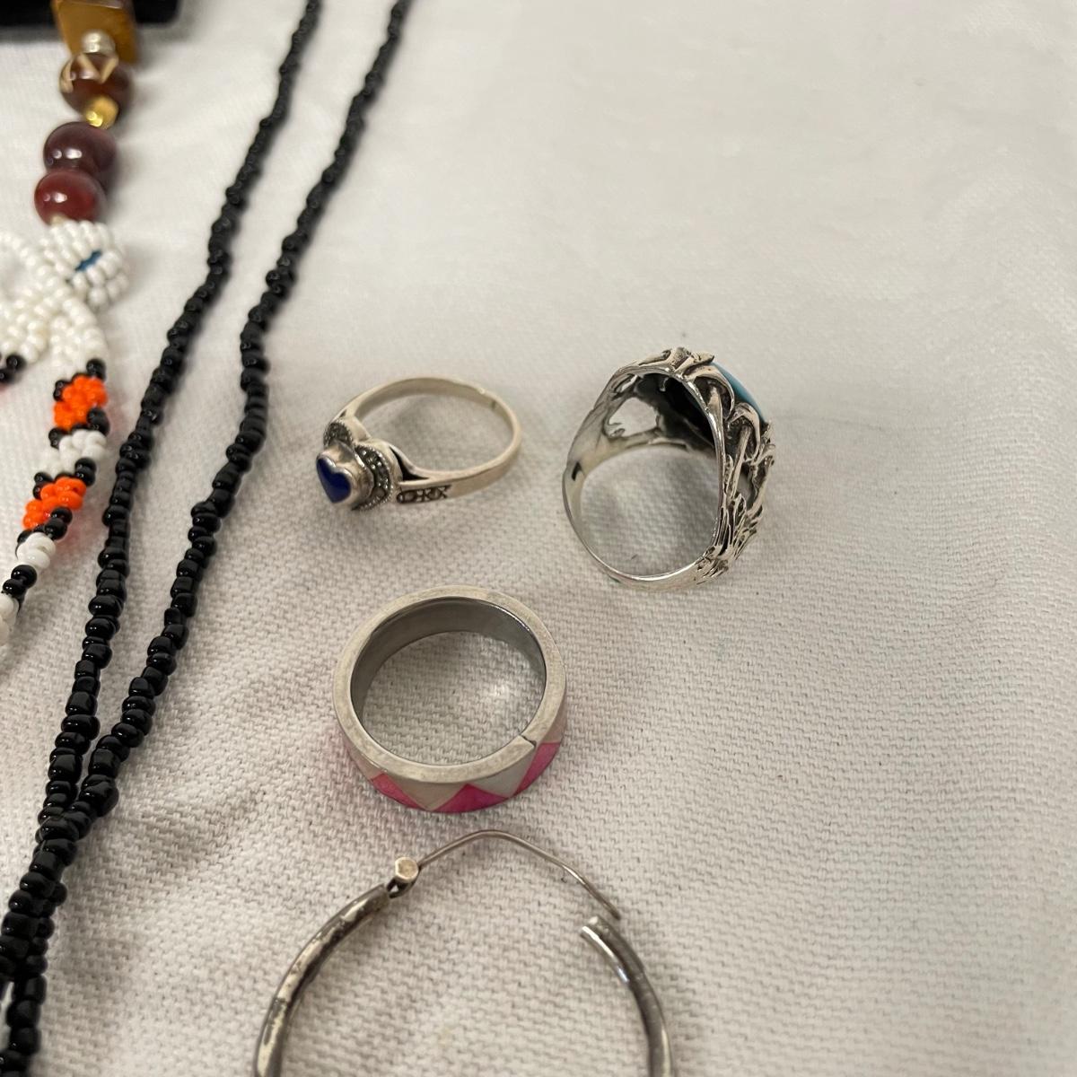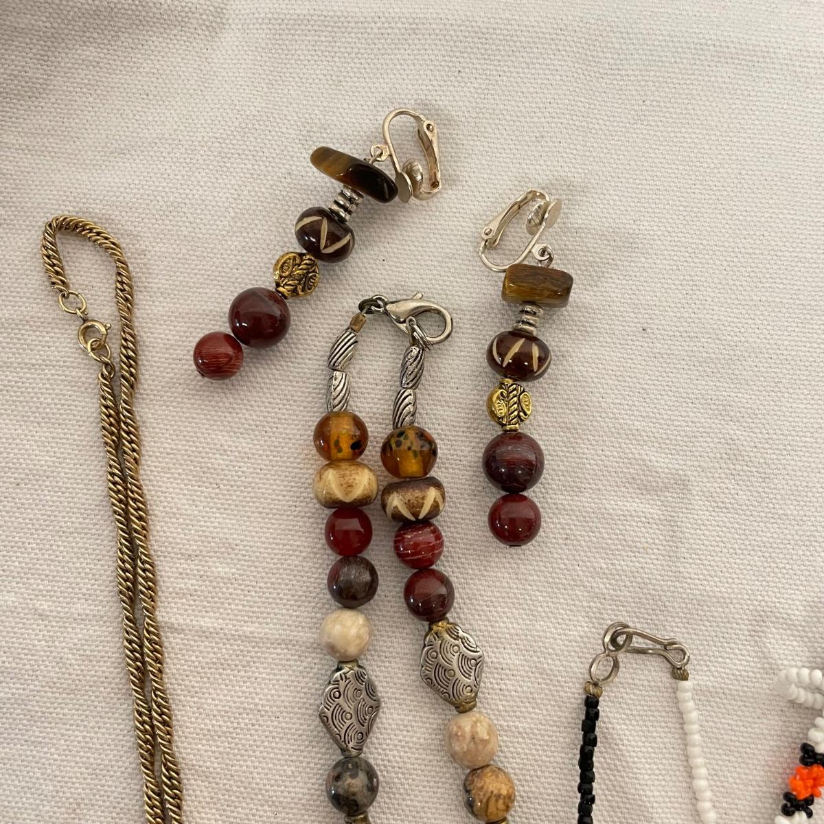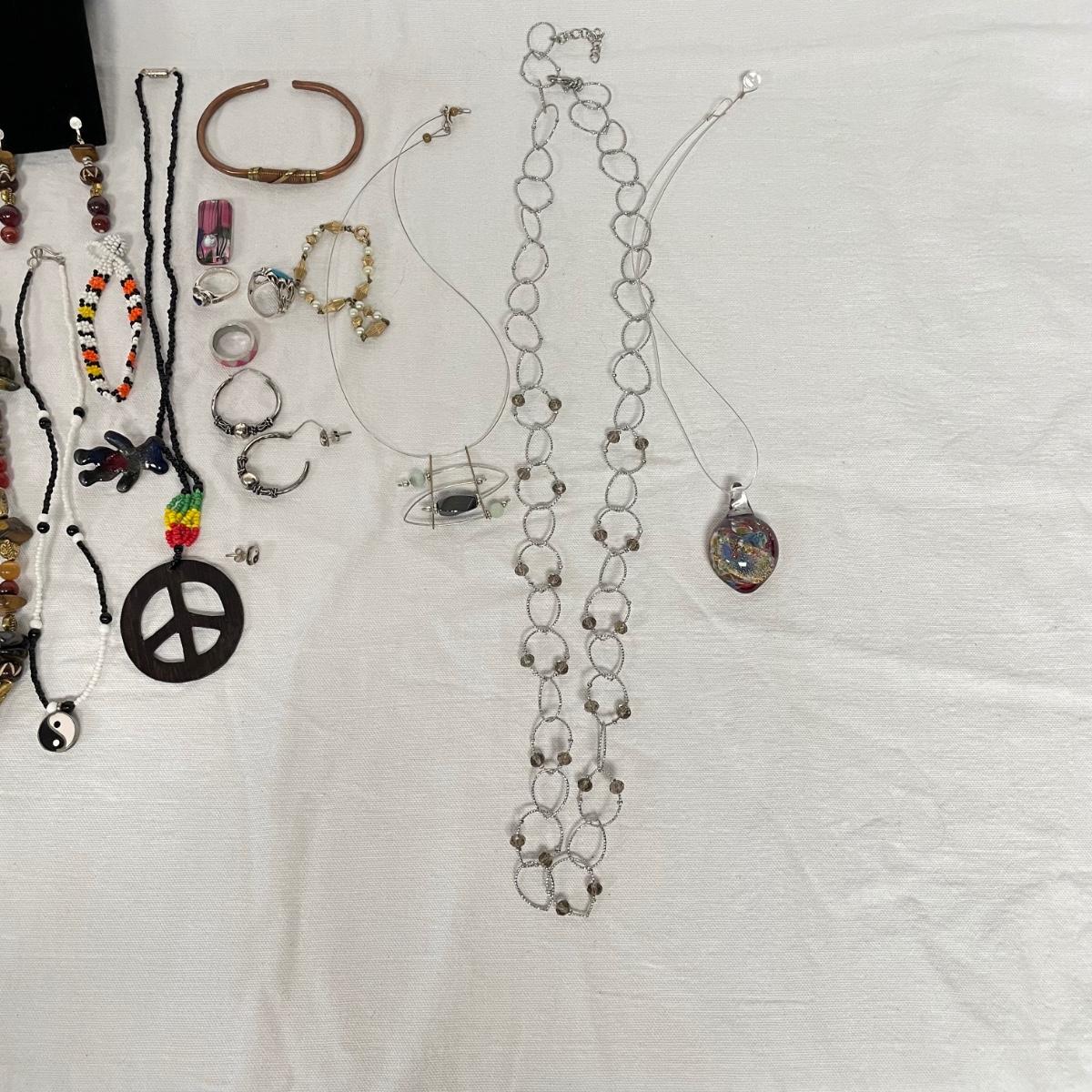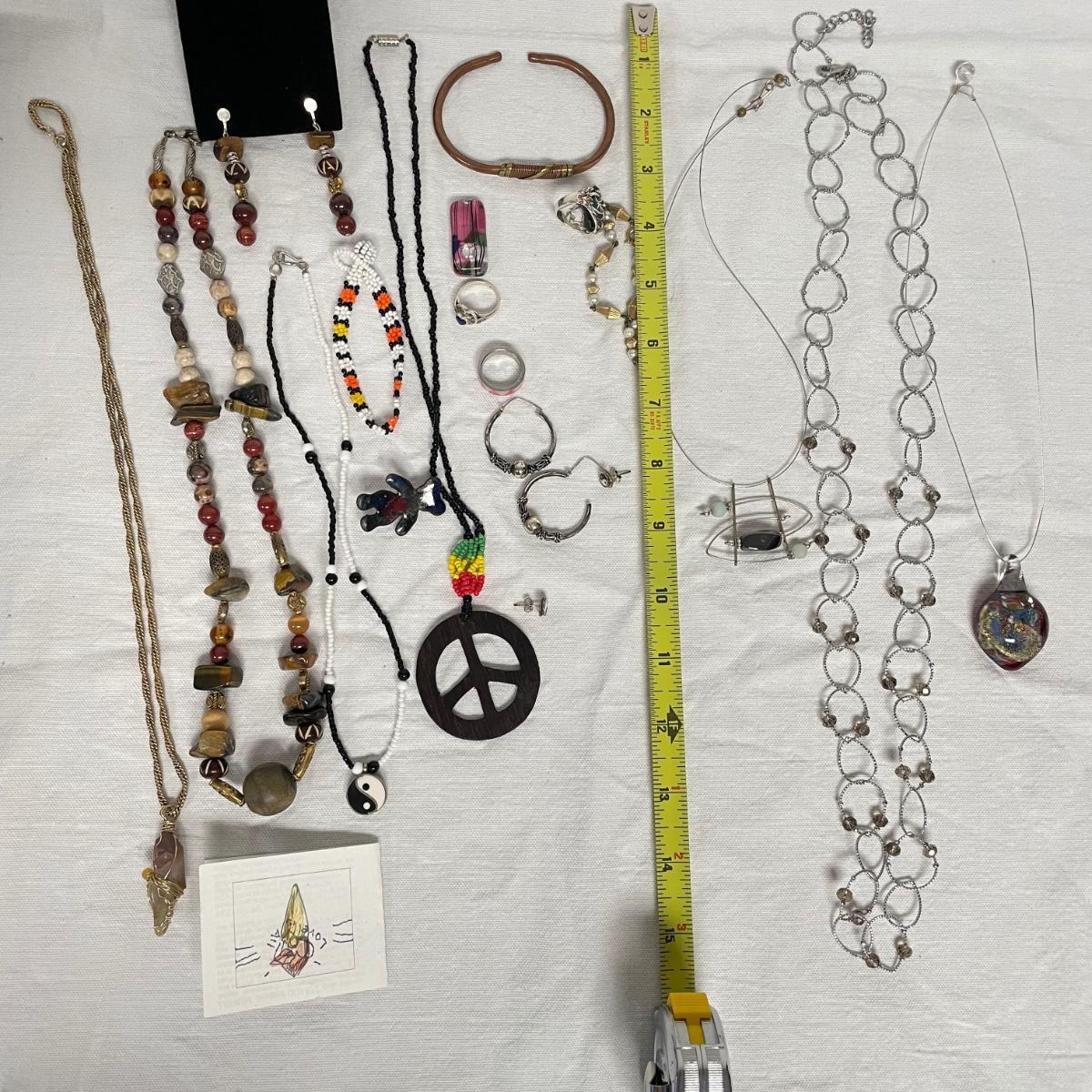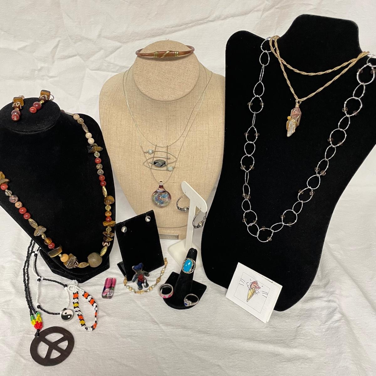 Fun, bold and colorful lot with a mix of necklaces, earrings, rings, bracelets, a brooch and a pendant. Lot features an artistic set with a necklace and clip earrings, two glass pendants and what appears to be a semi-precious mystic stone necklace with information pamphlet. No markings were seen on the rings. See images. Shipping available. All sales are final. No returns or refunds. Please bid accordingly.