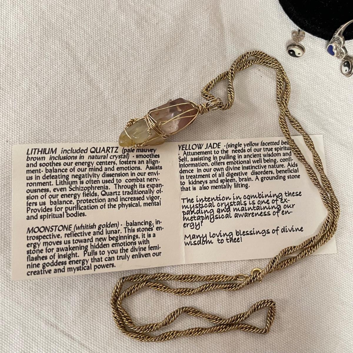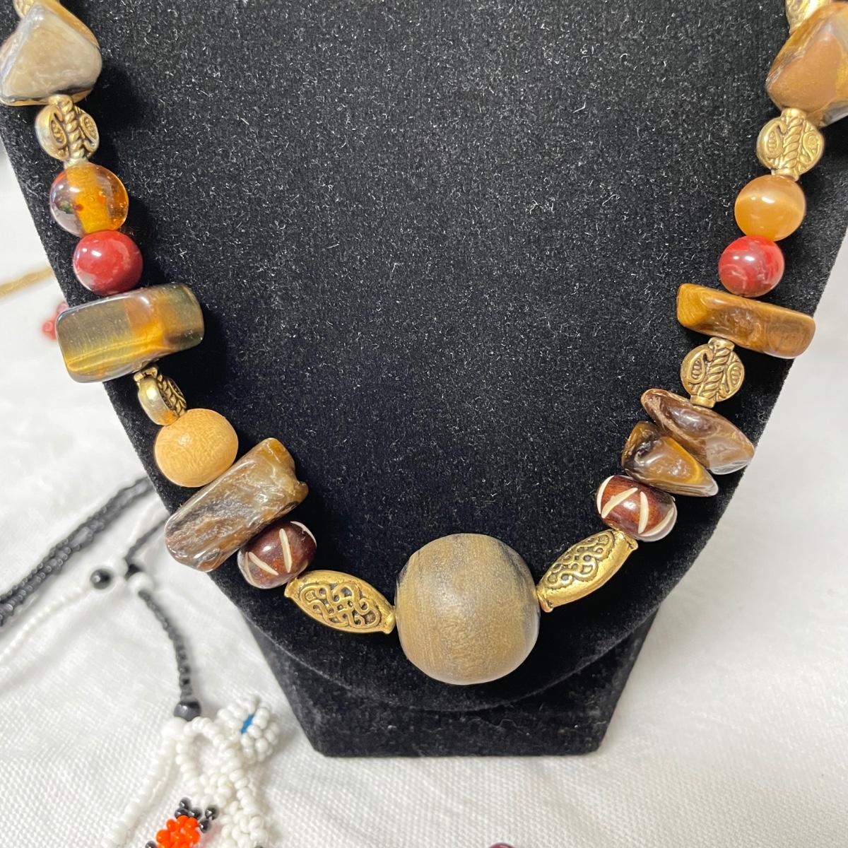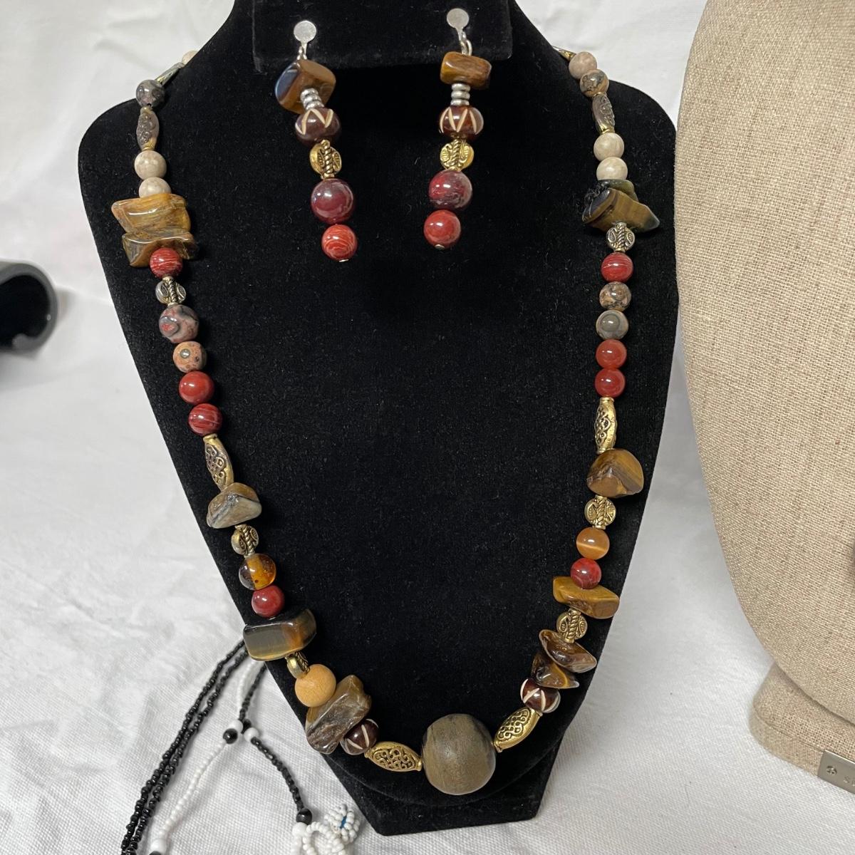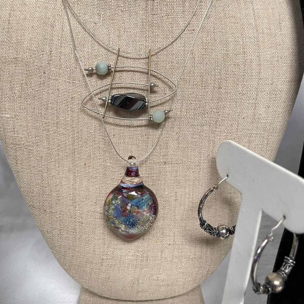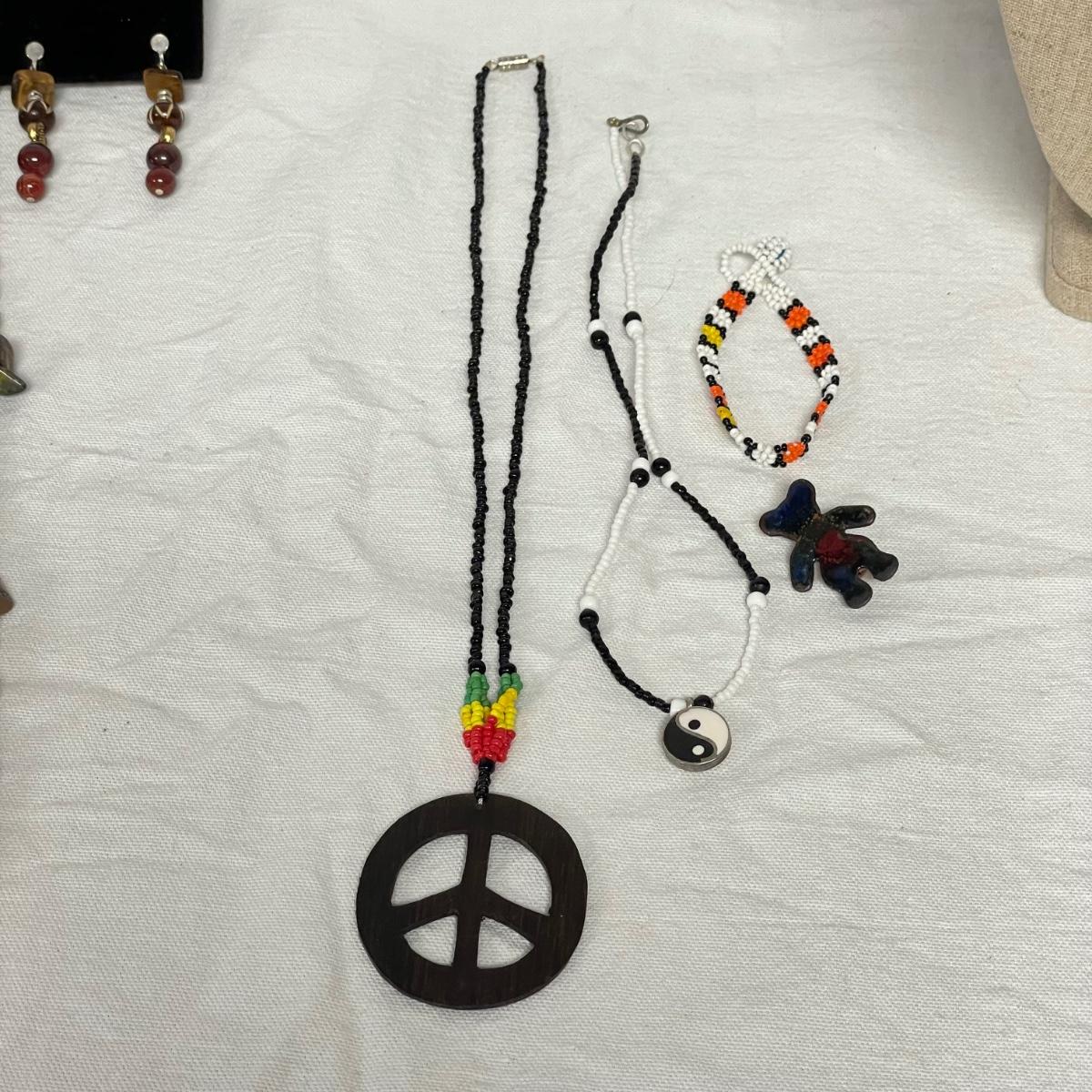 Fun, bold and colorful lot with a mix of necklaces, earrings, rings, bracelets, a brooch and a pendant. Lot features an artistic set with a necklace and clip earrings, two glass pendants and what appears to be a semi-precious mystic stone necklace with information pamphlet. No markings were seen on the rings. See images. Shipping available. All sales are final. No returns or refunds. Please bid accordingly.
