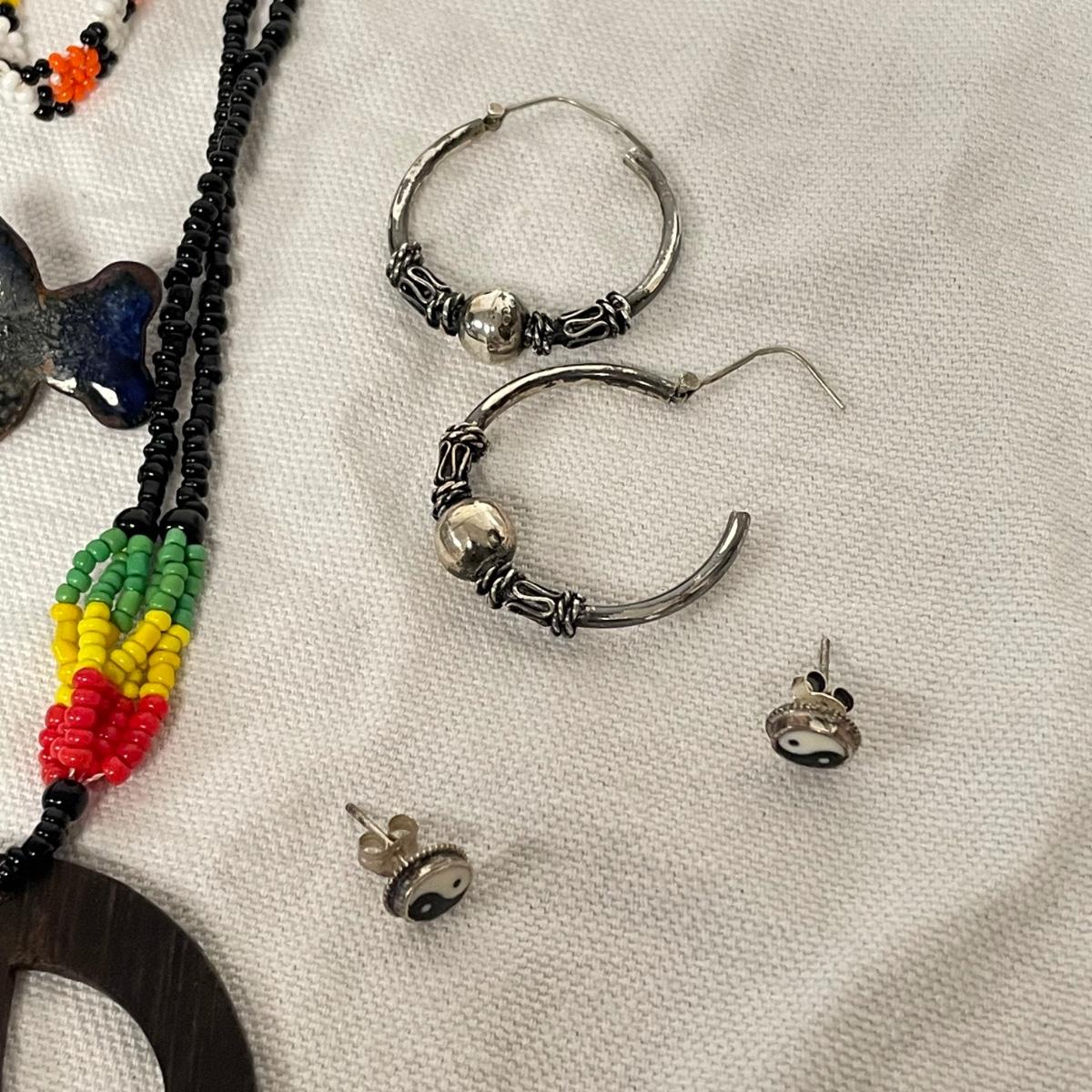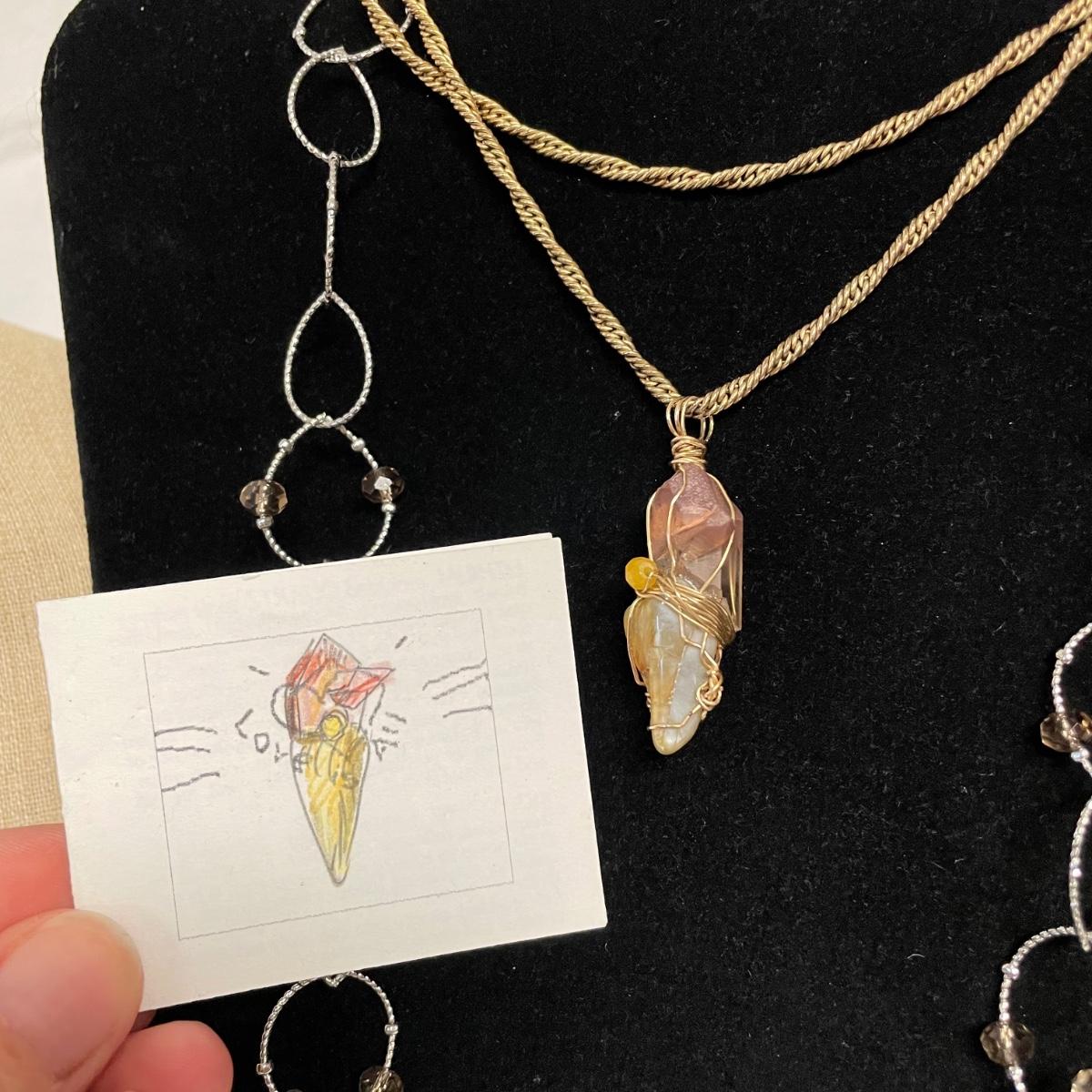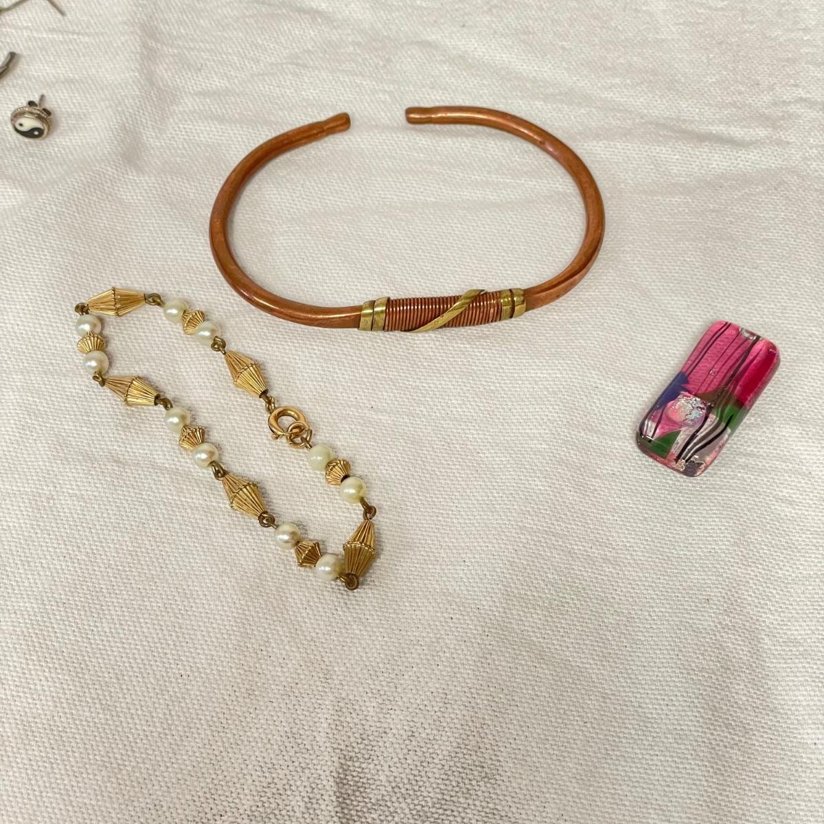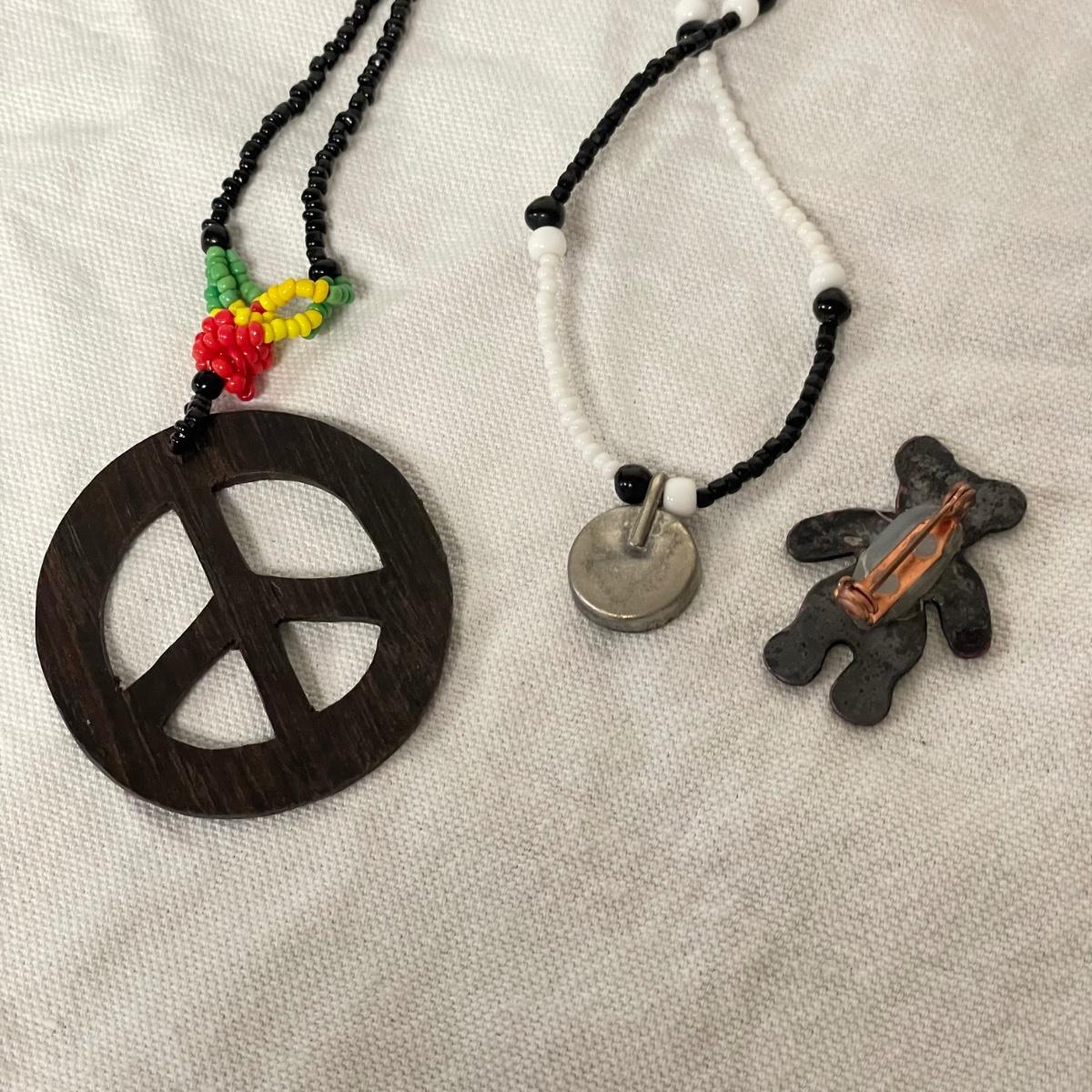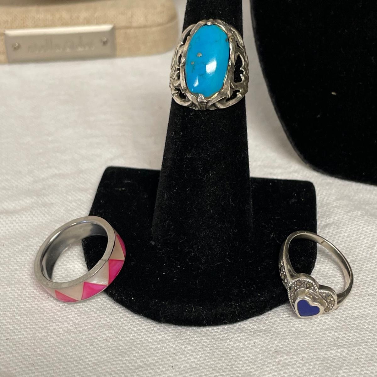 Fun, bold and colorful lot with a mix of necklaces, earrings, rings, bracelets, a brooch and a pendant. Lot features an artistic set with a necklace and clip earrings, two glass pendants and what appears to be a semi-precious mystic stone necklace with information pamphlet. No markings were seen on the rings. See images. Shipping available. All sales are final. No returns or refunds. Please bid accordingly.