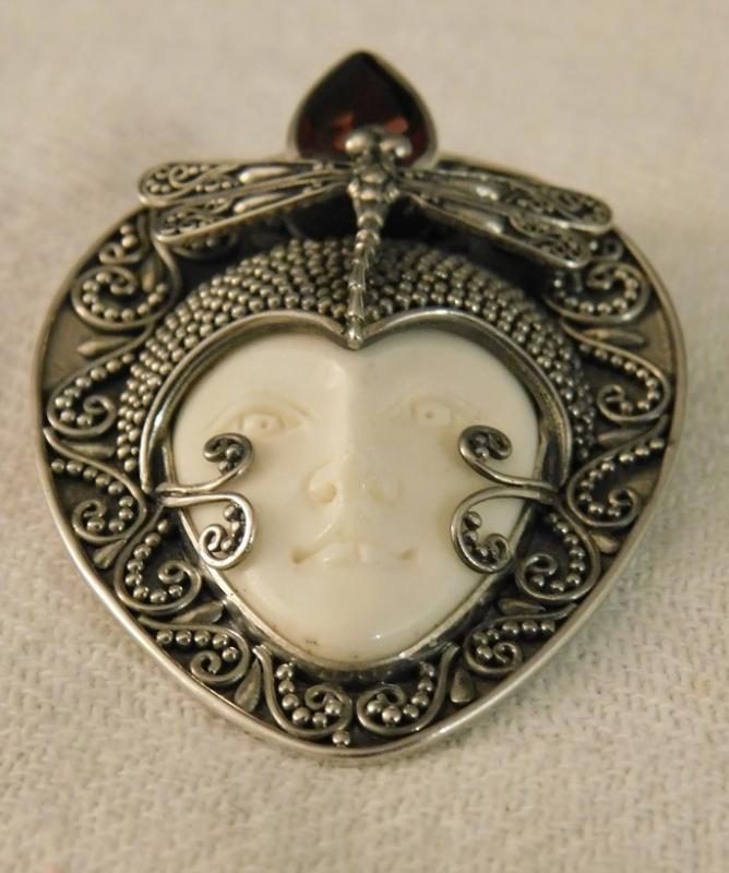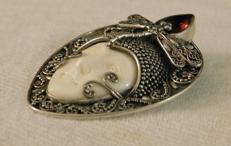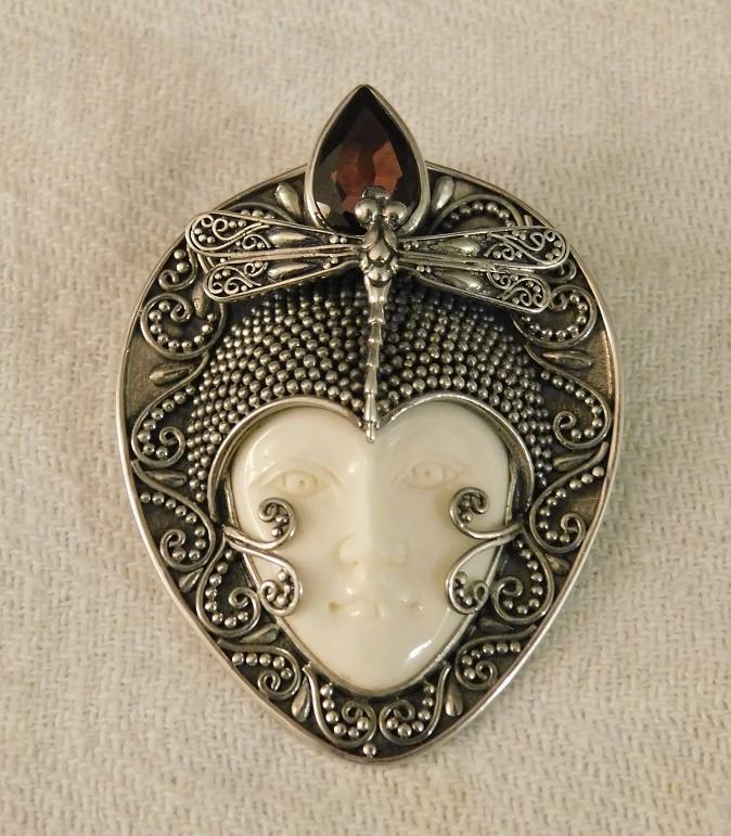 Artisan Crafted Dragonfly Carved Bone Goddess in Sterling Silver with Mozambique garnet accent
