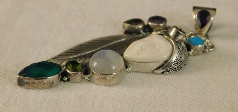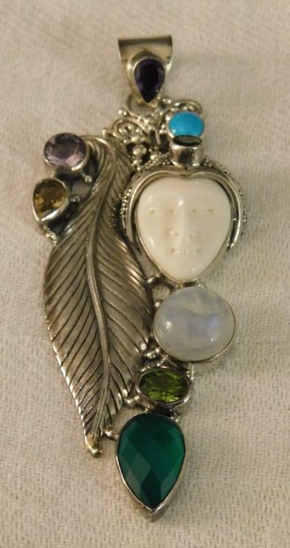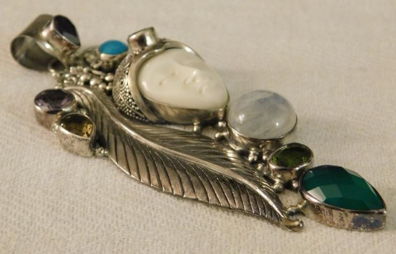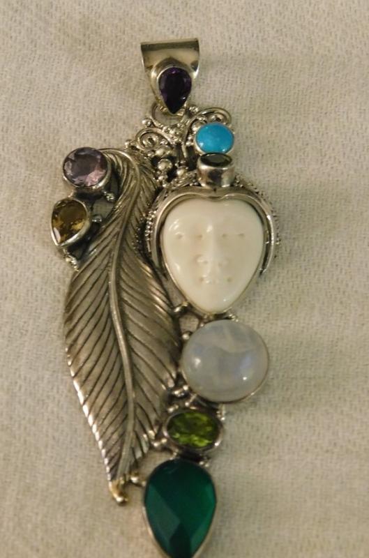 Large Artisan Crafted Leaf Carved Bone Sleeping Goddess Pendant with multi stone accents in sterling silver.