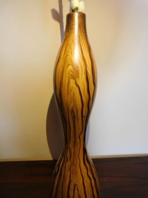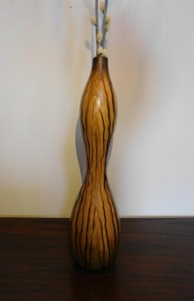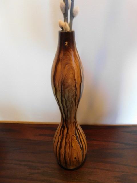 Ceramic Faux Paibted Turned Exotic Wood Body Vase 16" in very good condition has beautiful painted grain lines and rich coloring.