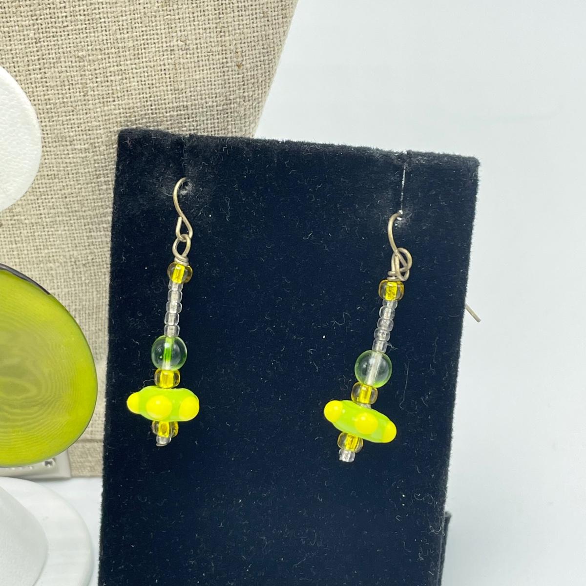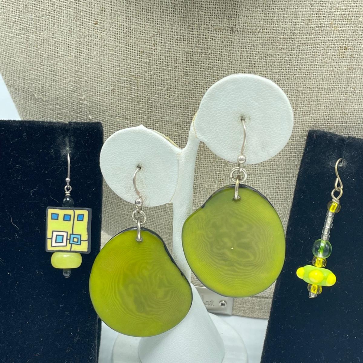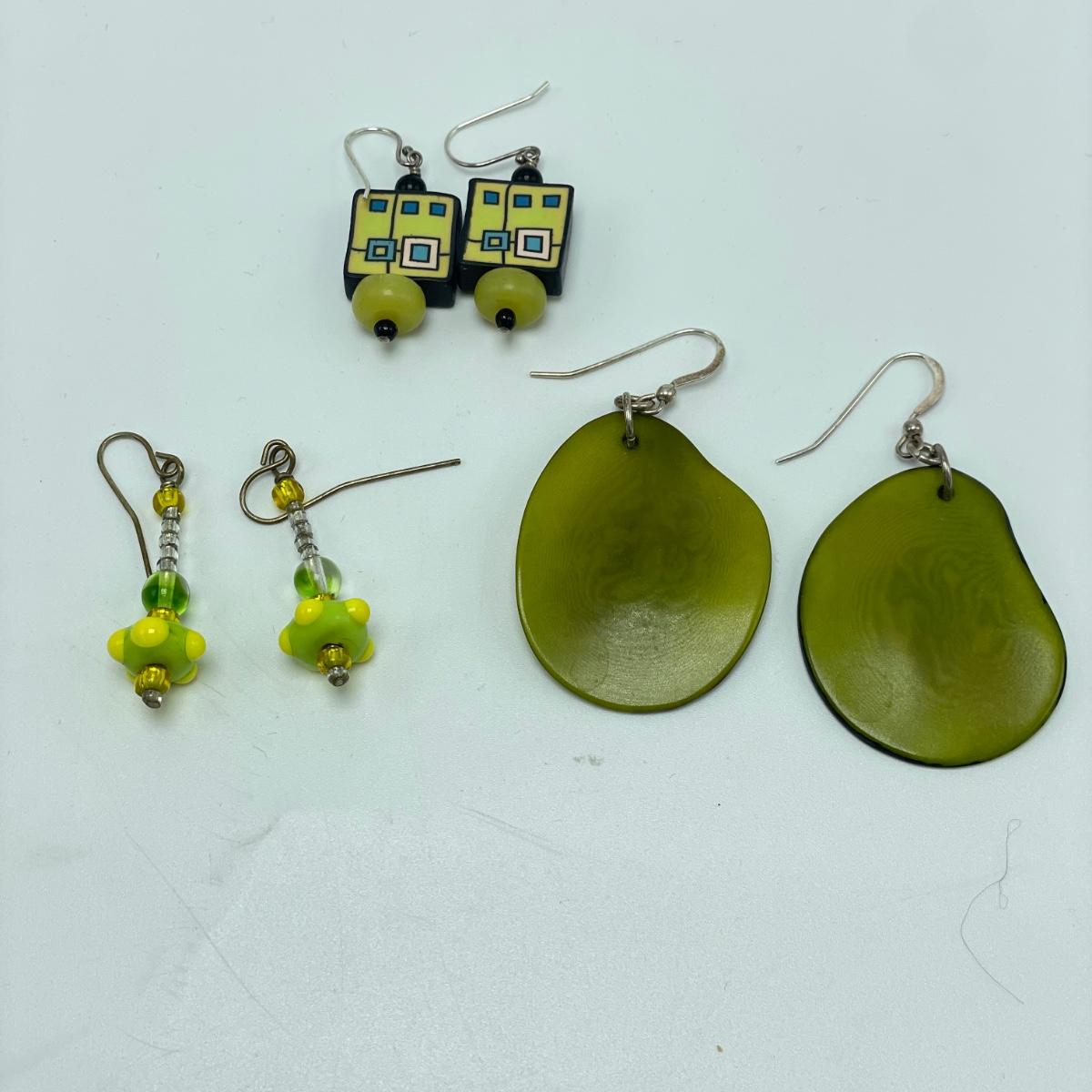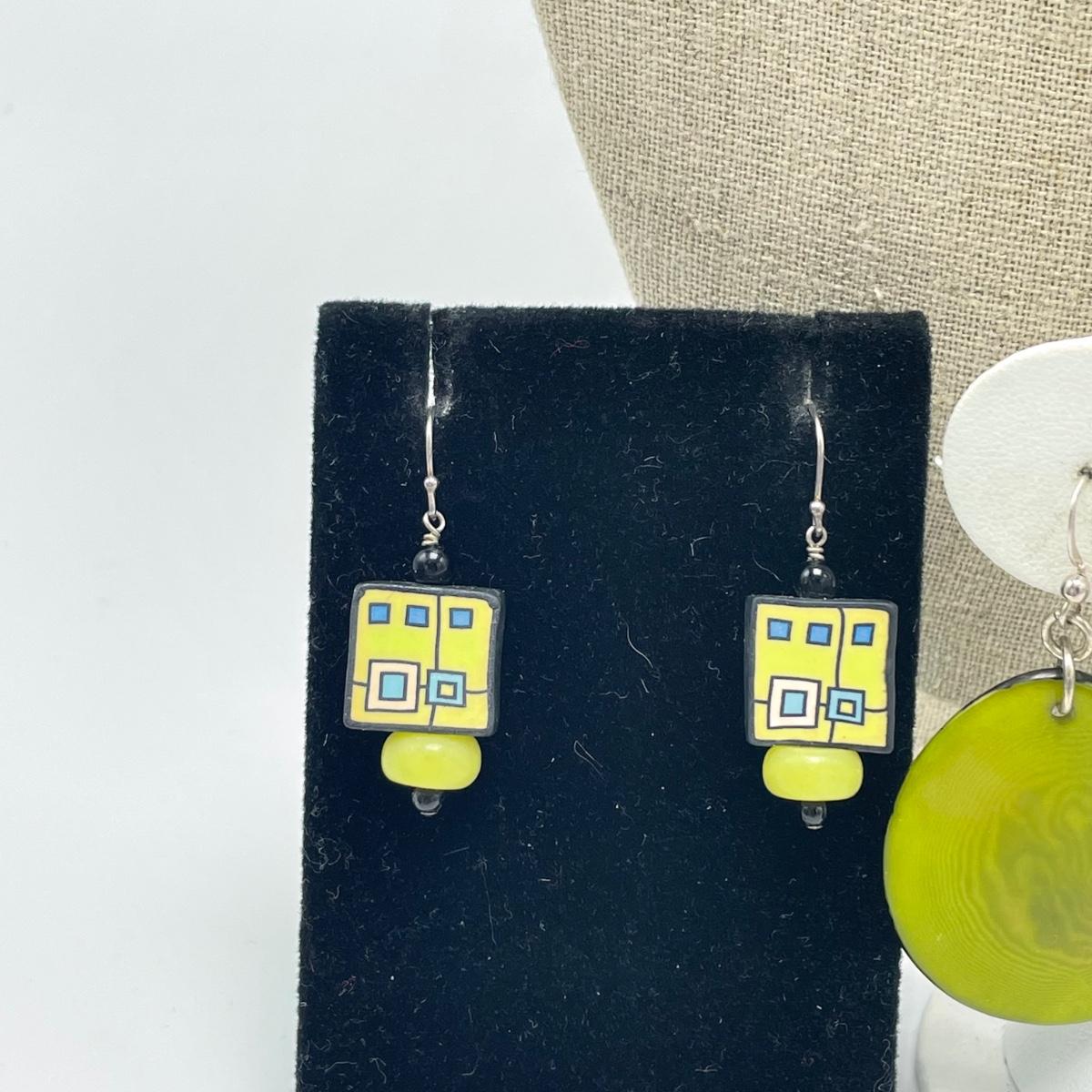 Three pairs of earrings with French wires, one is glass beads, the square ones are a clay polymer technique and the third are unknown. The earrings are paired with an Emily Ray beaded necklace. See images. Shipping available.